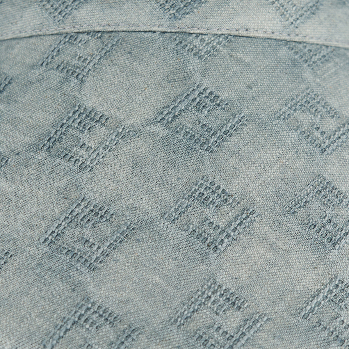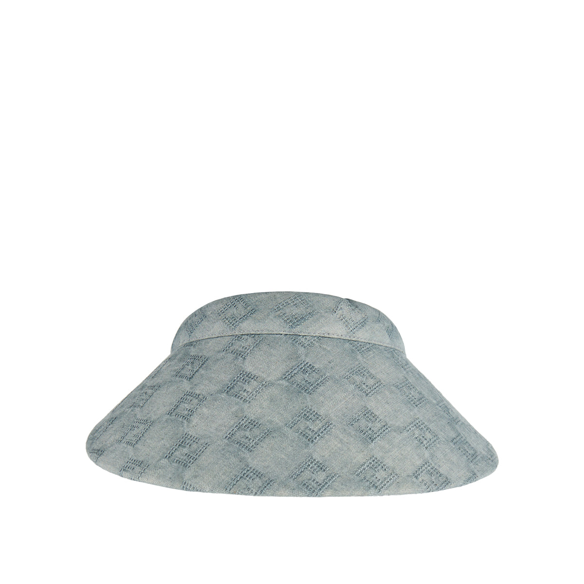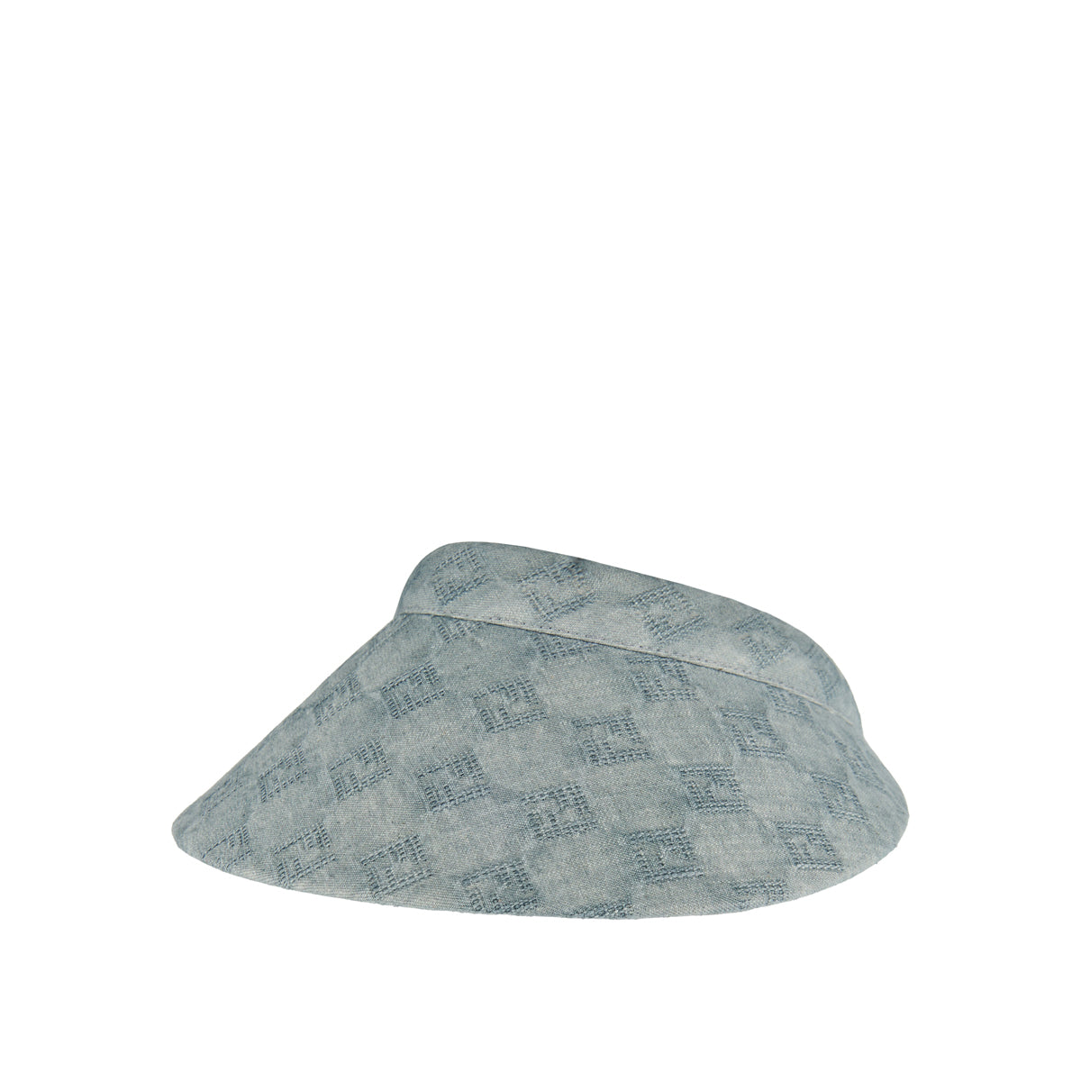 Shield yourself in style with the Fendi blue FF visor canvas . Crafted in Italy, this wide-brim visor features a chic blue denim-colored washed canvas, adorned with the iconic micro FF motif embroidered throughout in coordinating tones. Designed for comfort and a perfect fit, it includes an elastic insert at the back and adjustable length with side buttons. The interior is finished with a luxurious blue grosgrain ribbon featuring the Fendi logo, adding a touch of signature elegance.