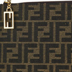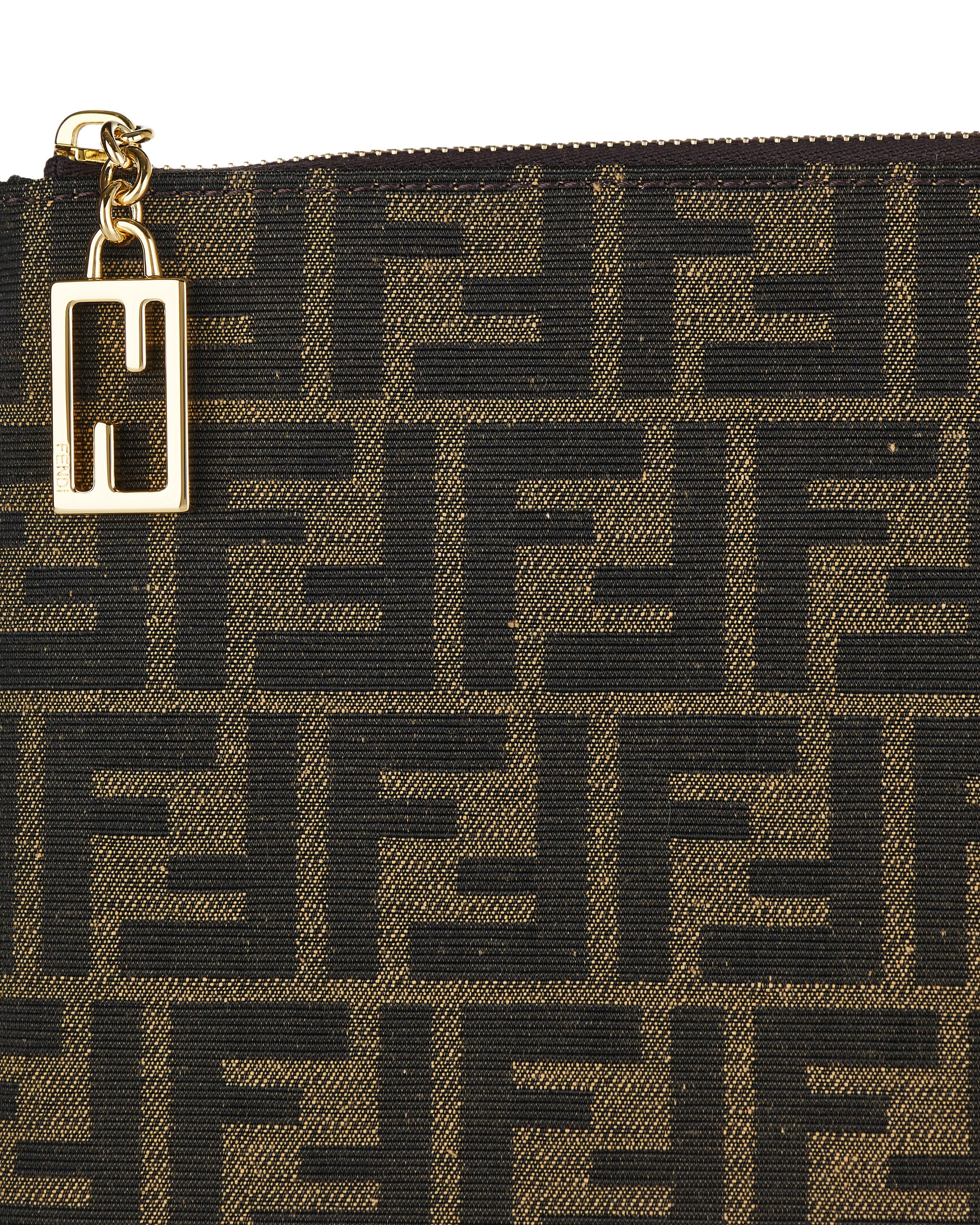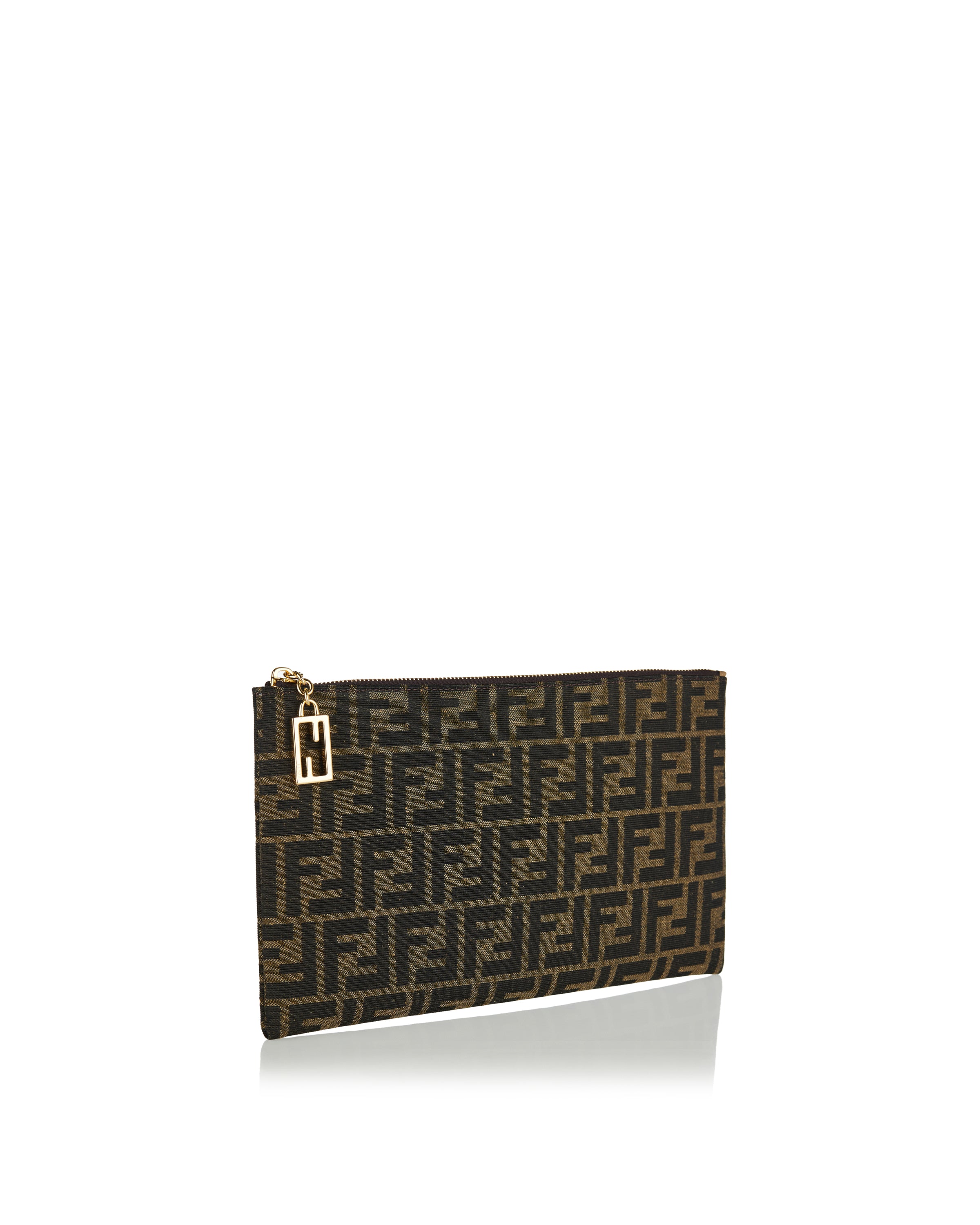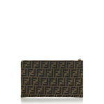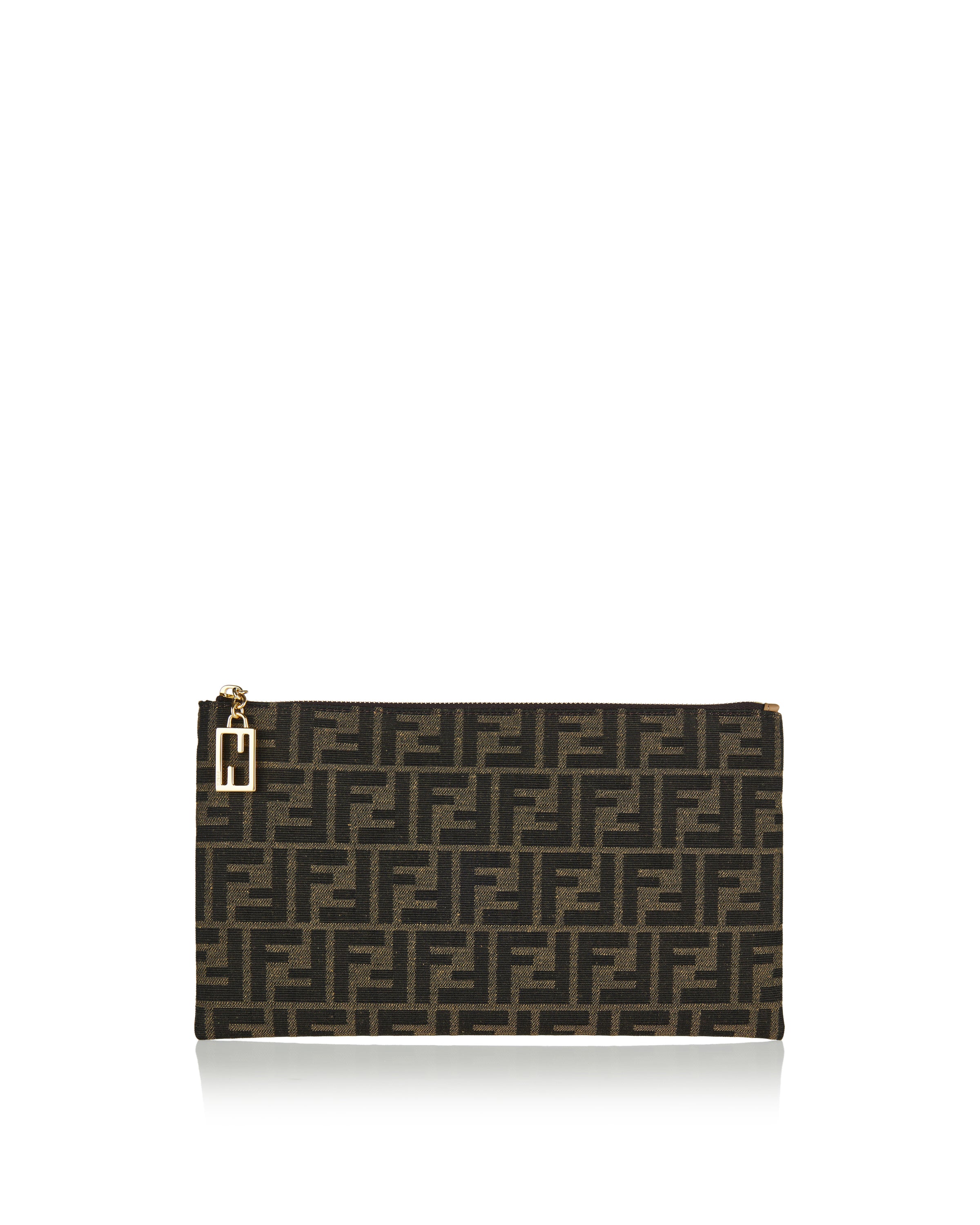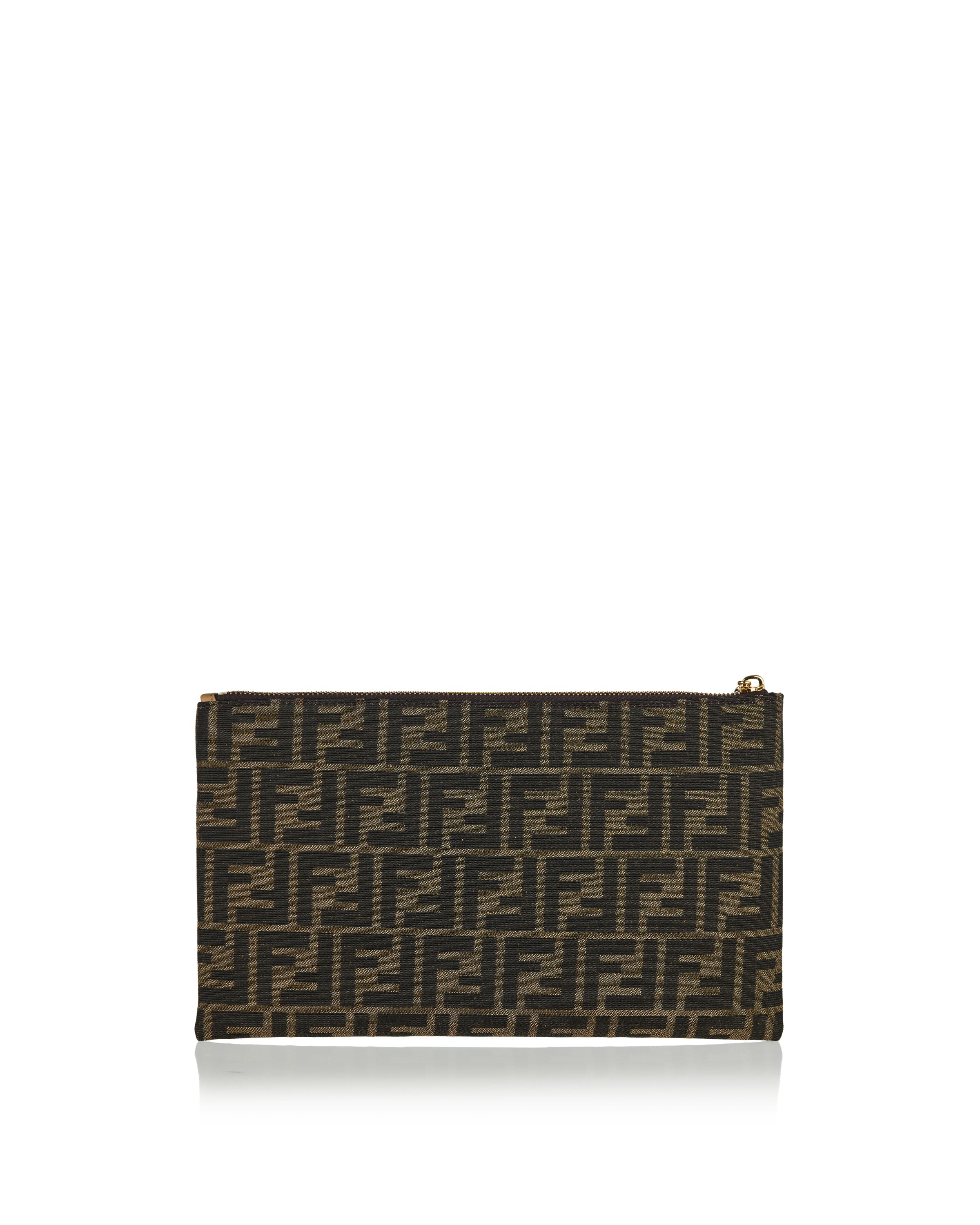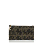 Pouch with zip closure. Made of jacquard fabric with iconic brown FF motif. Finished with FF Baguette zip pull. Lined inner with six cardholder slots in beige leather. Gold-finish metalware.