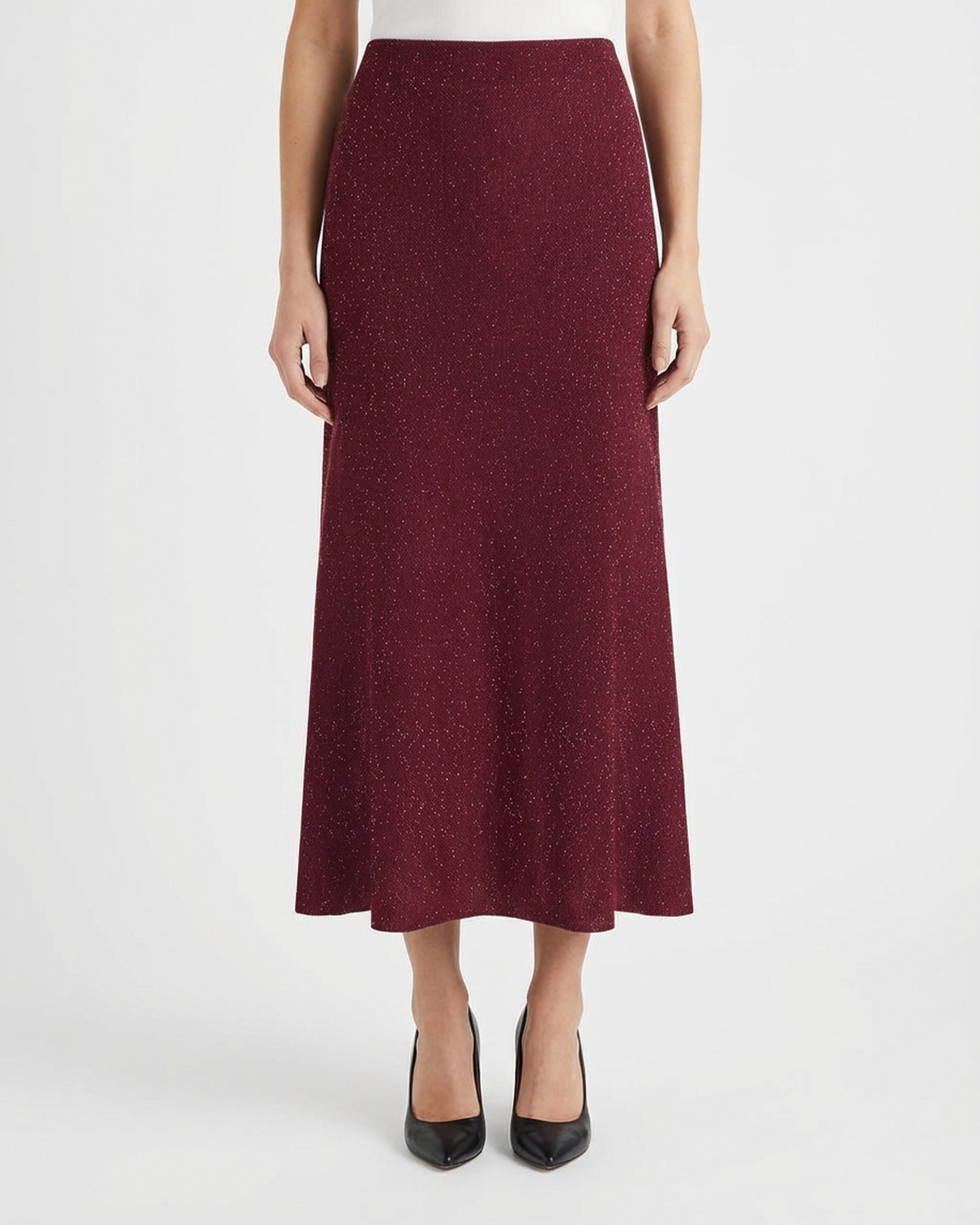 A luxurious Gabriela Hearst Sabine knit skirt in bordeaux beaded cashmere-silk blend with a subtly flared maxi silhouette and shimmering glass bead detailing. Designed for elevated daytime and evening wardrobes, it infuses refined knit craftsmanship with modern couture allure.