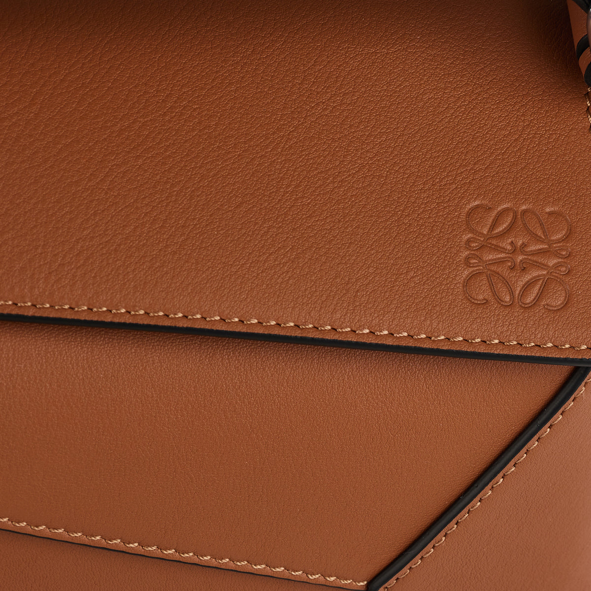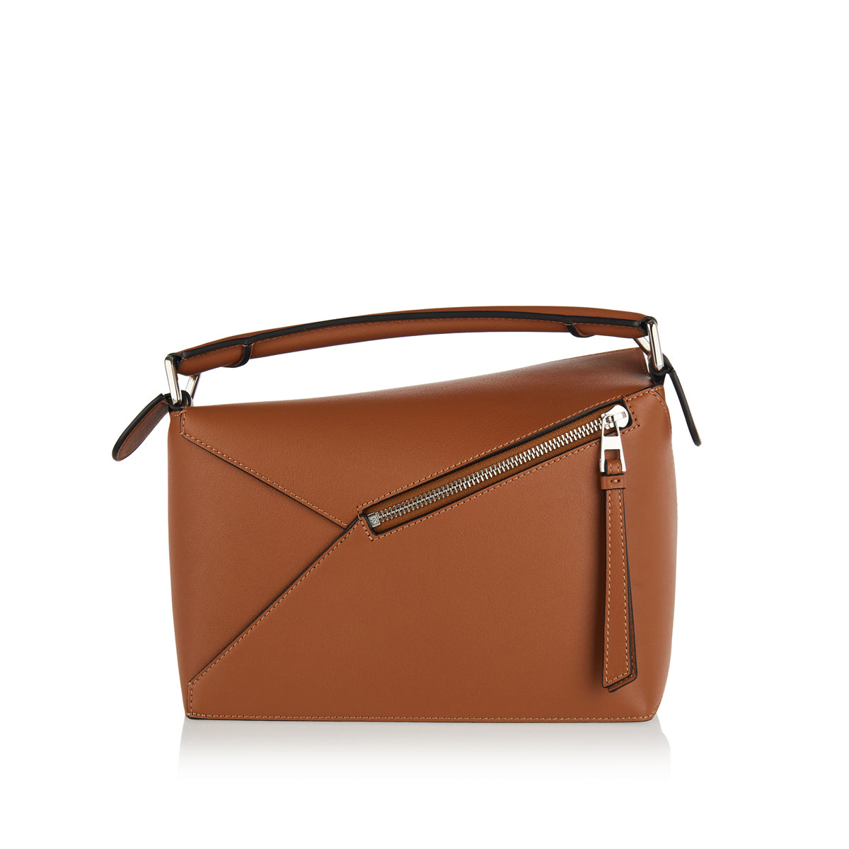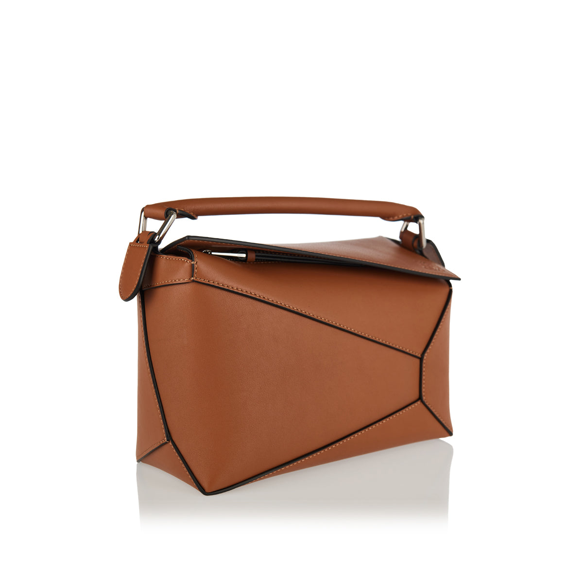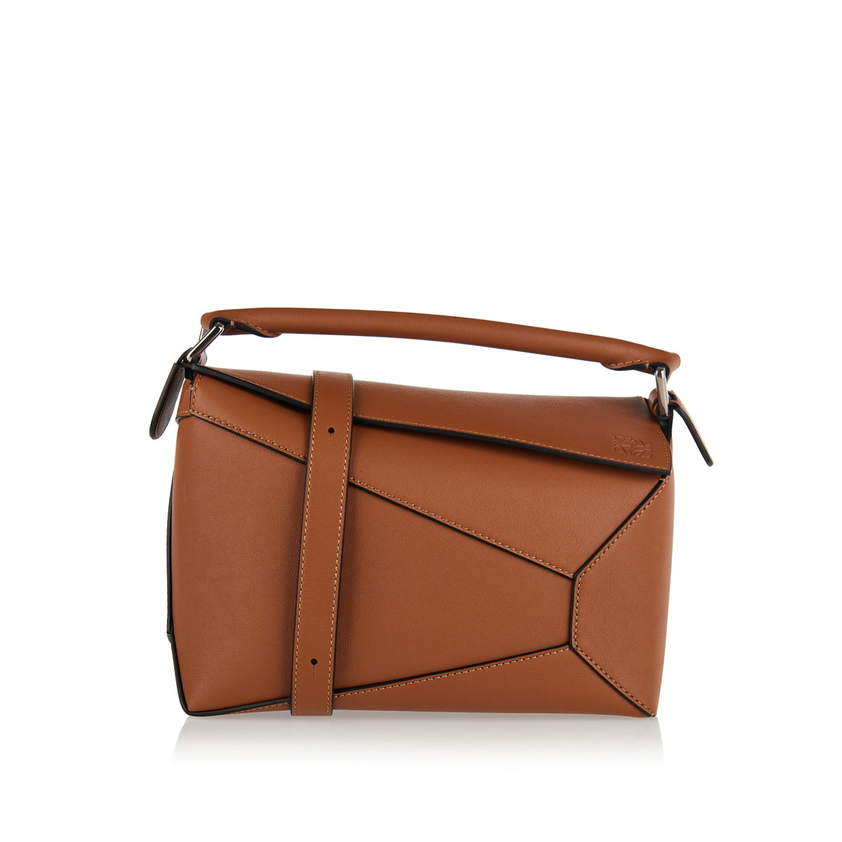 Loewe’s Small Puzzle Edge bag is crafted from supple tan calfskin leather and showcases the house’s signature cuboid silhouette with precise geometric panels. Designed with an adjustable strap and top handle, it is a versatile companion for everyday wear.