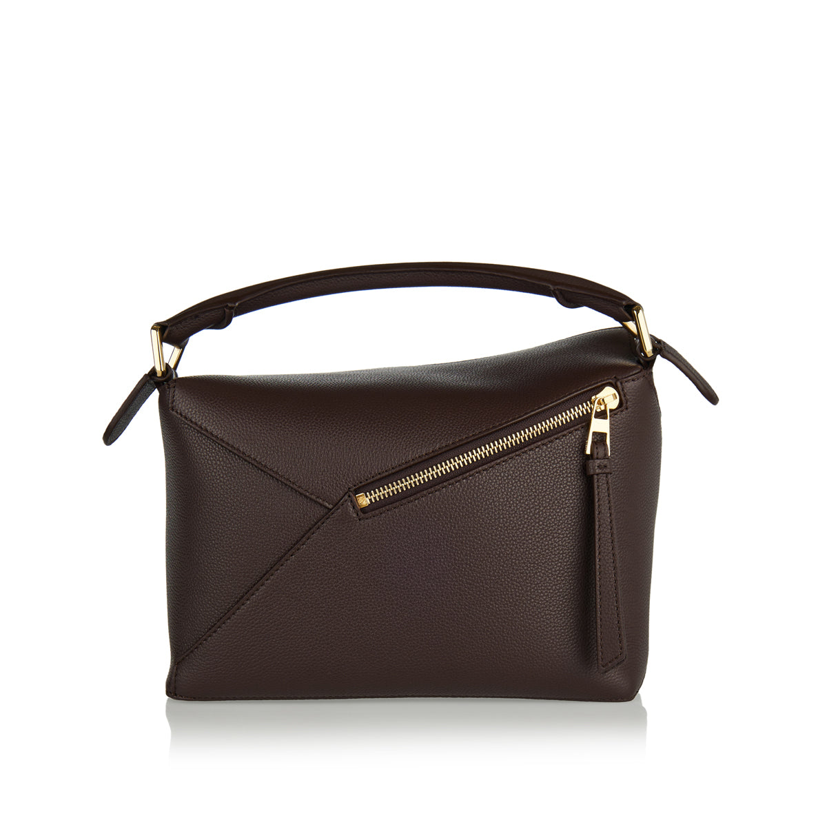 A sculptural yet versatile shoulder bag from Loewe in soft grained calfskin, defined by geometric panels, a top handle, zip closure and detachable strap — ideal for elevated everyday or refined evening carry.