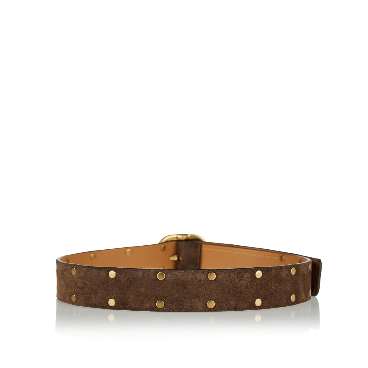 A refined belt that marries soft suede calfskin with elegant detailing, crafted for understated sophistication. The rounded profile and subtle stud-embellishments give it a unique refined character, ideal for both tailored outfits and elevated casual styling. A versatile accessory that elevates trousers or dresses with quiet luxury and subtle craftsmanship.