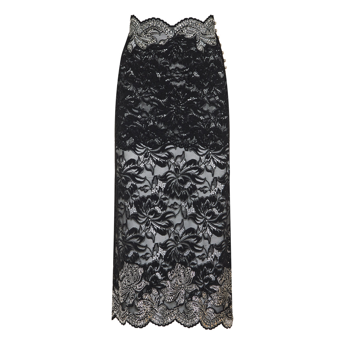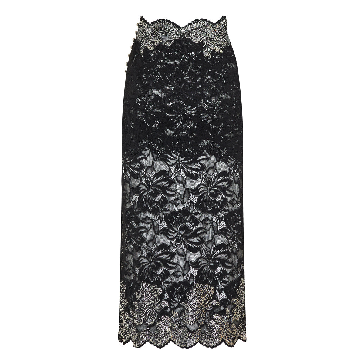This Rabanne floral lace midi skirt offers refined allure, ideal for cocktail evenings or elevated daytime elegance. Crafted in stretch lace that subtly reveals through, it features a button‑front fastening and a flattering mid‑length silhouette rendered in timeless black.