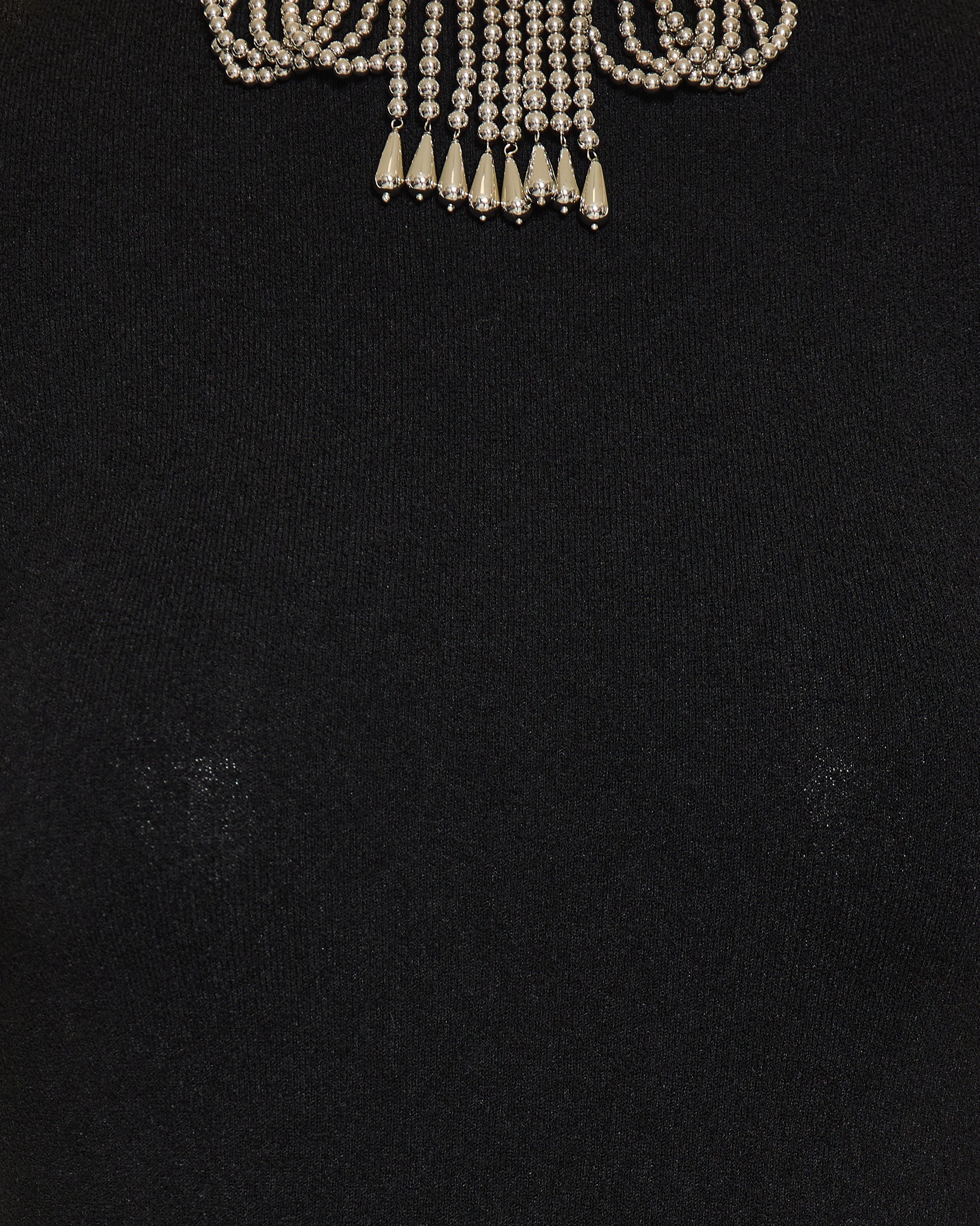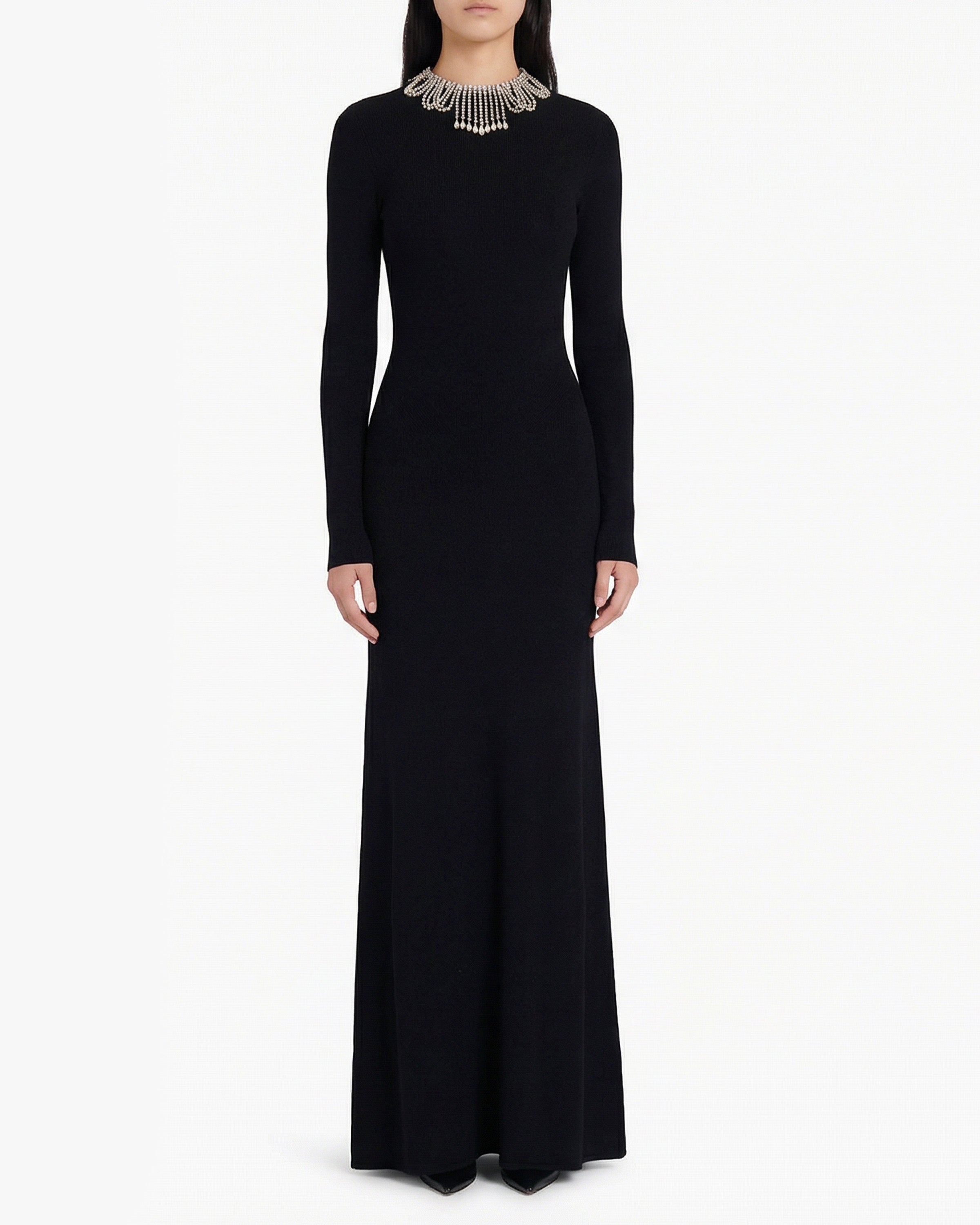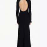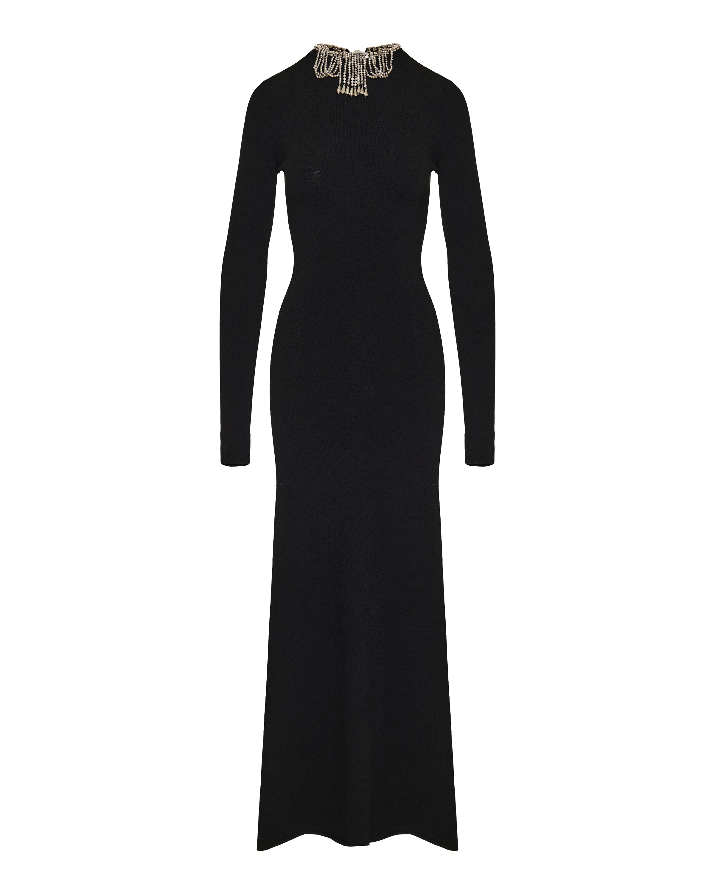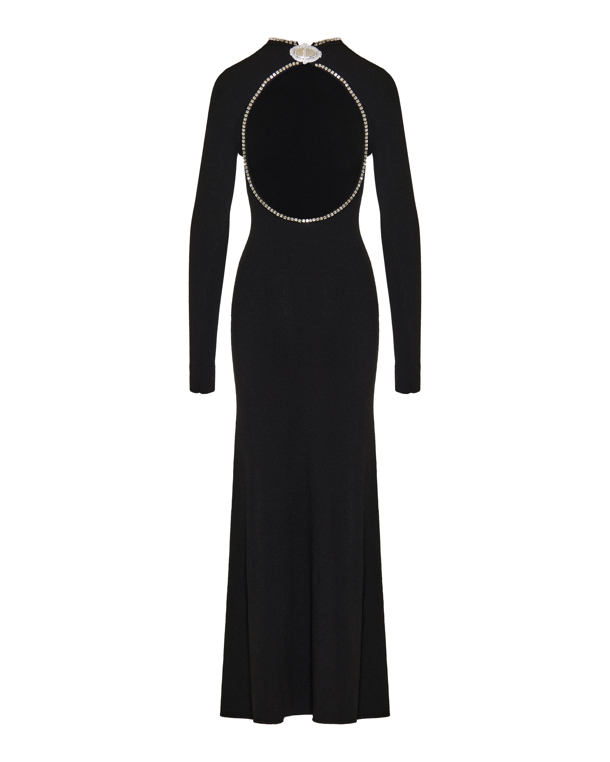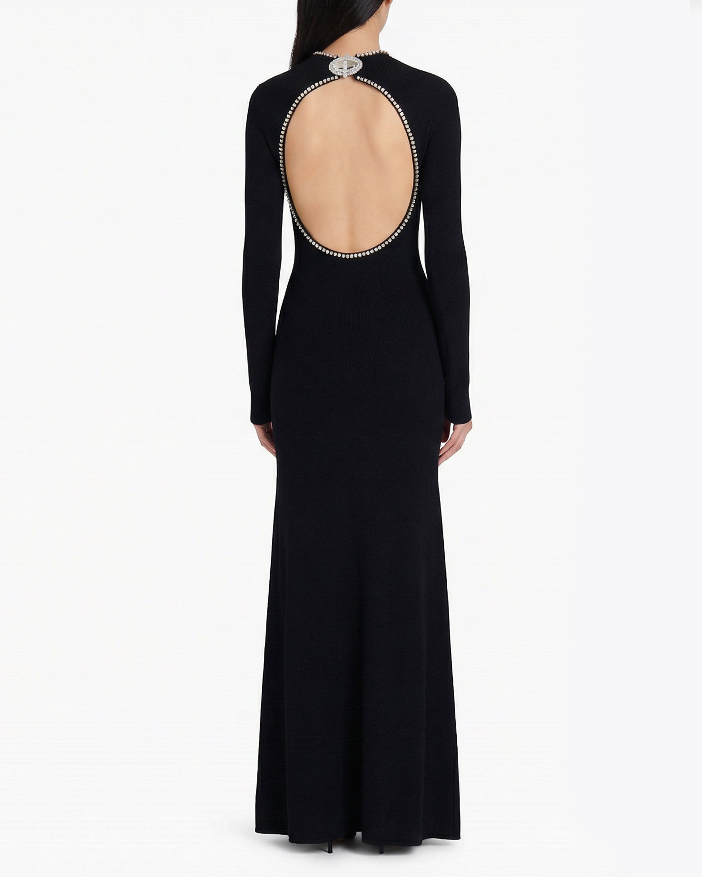 Striking and refined, this knit gown reflects Rabanne’s signature balance of sensuality and modern elegance. Designed with a fluid, body-skimming silhouette, it features a dramatic backless design enhanced by jeweled detailing that adds a subtle yet luminous accent. Ideal for evening wear and formal occasions, it delivers a confident, sculptural presence with a refined contemporary edge.