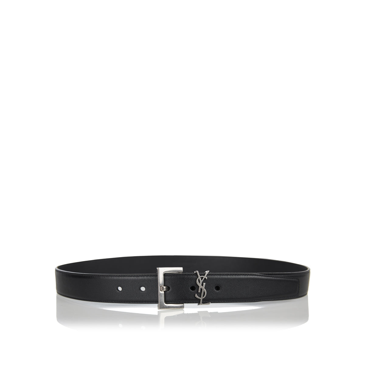 This elegant black belt from Saint Laurent is crafted from 100% calf leather, featuring a polished silver-tone square buckle adorned with the iconic Cassandre logo. Its slim profile and adjustable fit make it a versatile accessory, suitable for both formal and smart-casual occasions.