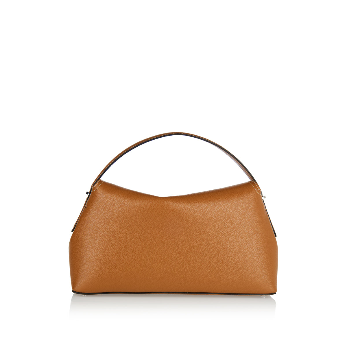 A sculptural top-handle bag from Toteme, featuring a curved topline that complements the shape of the hand and arm. Crafted from supple yet resilient pebble-grained leather, it is finished with a silver-tone twist lock and a beige microsuede lining. Ideal for formal occasions and evening events, this accessory offers a sophisticated touch to your ensemble.