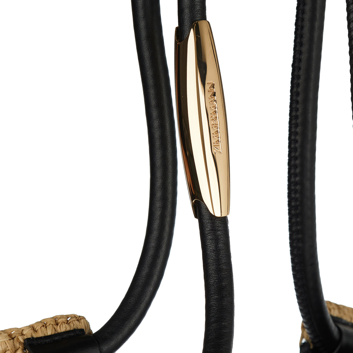 Crafted in hand‑woven raffia with black striped detailing, this Zimmermann Goldentime tote combines a surf‑inspired silhouette with functional design featuring tubular handles and leather‑tie closure — perfect for elevated resort wear or sophisticated day‑to‑evening carry.