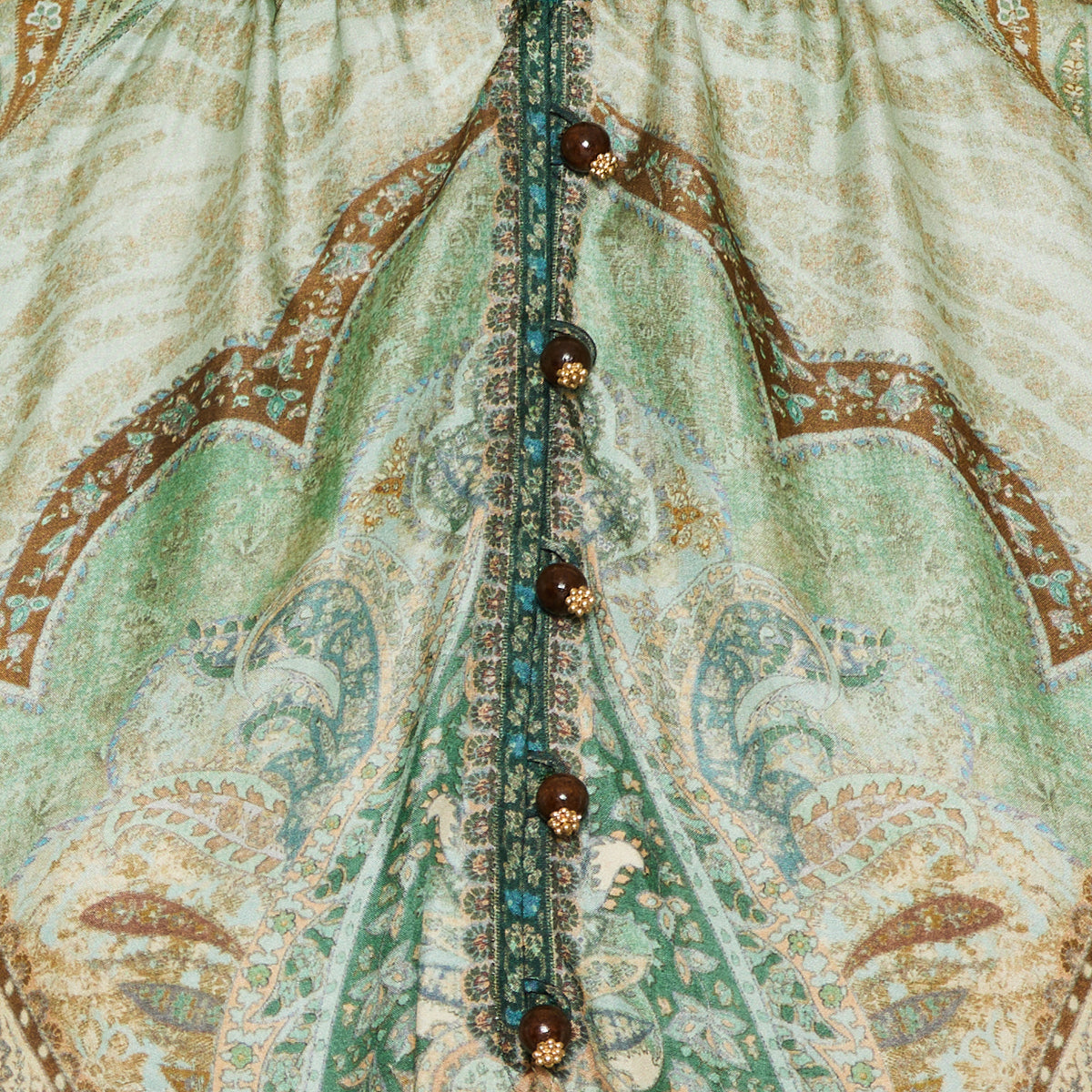 This silk maxi dress by Zimmermann features a rich tapestry‑teal multicolour print, a shirred stand collar, short billowed sleeves and a detachable rope belt — ideal for elevated resort wear or refined summer evenings.