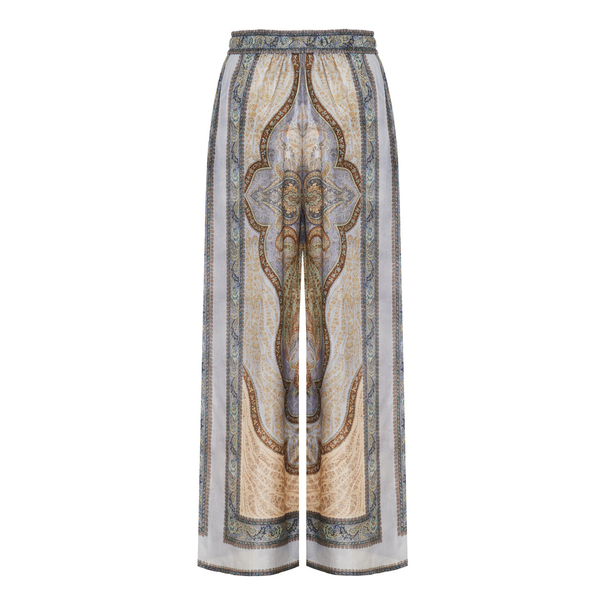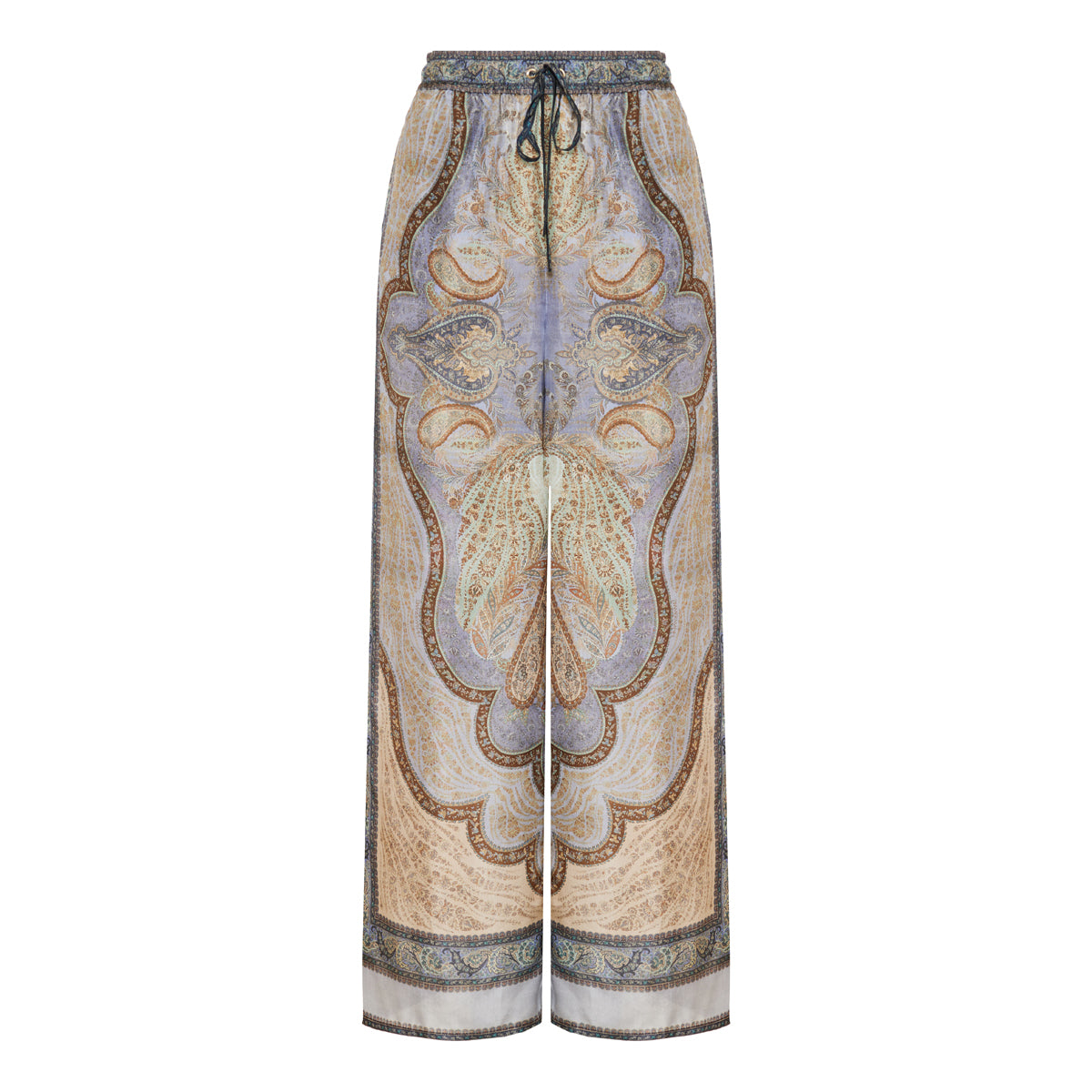 These Zimmermann Wanderlust relaxed trousers bring elegant ease with a free-spirited flair, perfect for resort wear or refined day-to-night styling. Crafted from lightweight habutai silk, they feature a mid-rise waist with gathered drawstring, placement floral print in soft blues and greens, wide-leg silhouette, and side pockets for practical sophistication.
