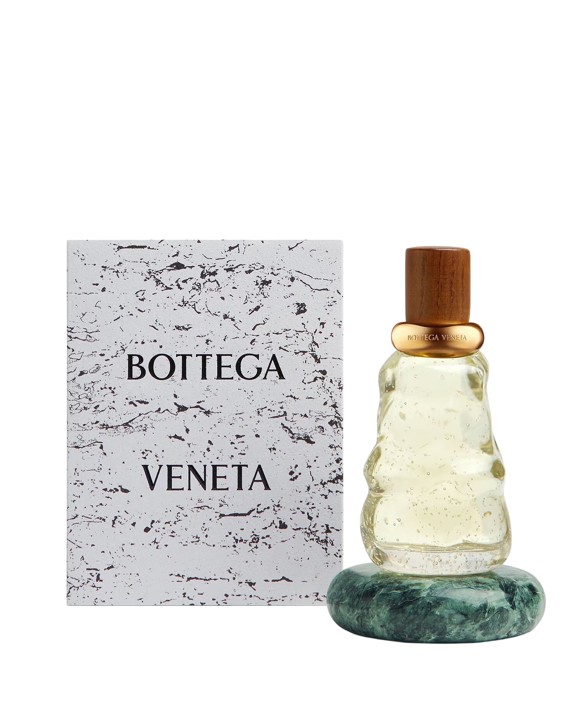 Elevated on a base of Verde Saint Denis marble, this tailor-made, opulent Intrecciato of ingredients is housed in an organically shaped glass bottle inspired by the artisanal heritage of the Veneto region.