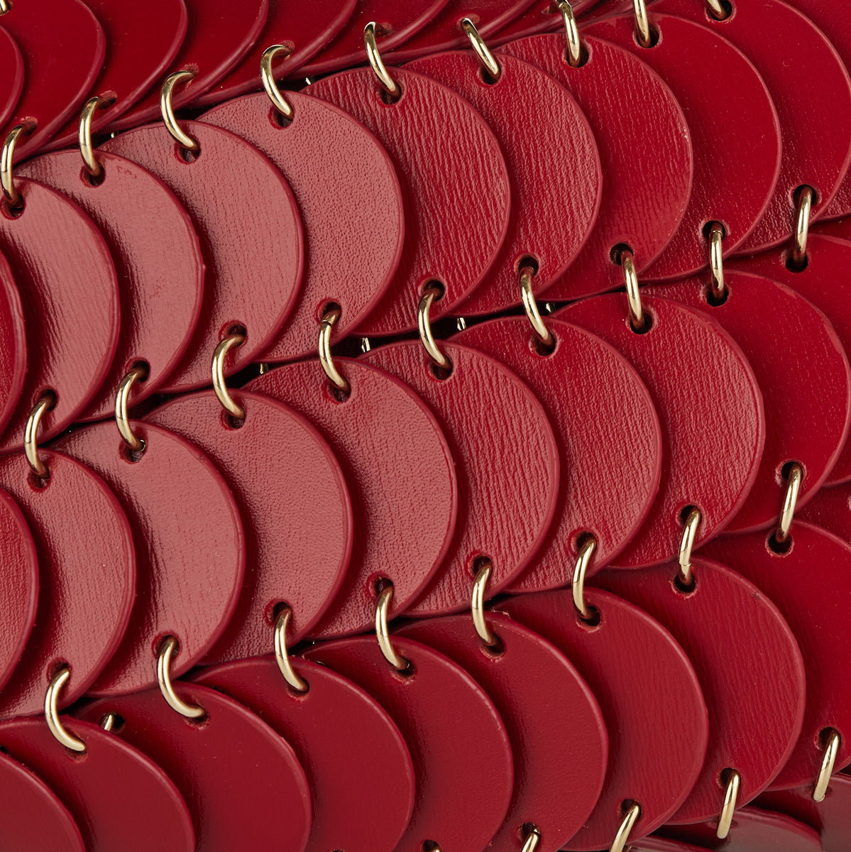 The Rabanne Paco leather crossbody bag is composed of interlinked calfskin leather discs, offering a sculptural texture and fluid movement. Complete with an adjustable leather strap and zip closure, it transitions elegantly between day and evening settings.