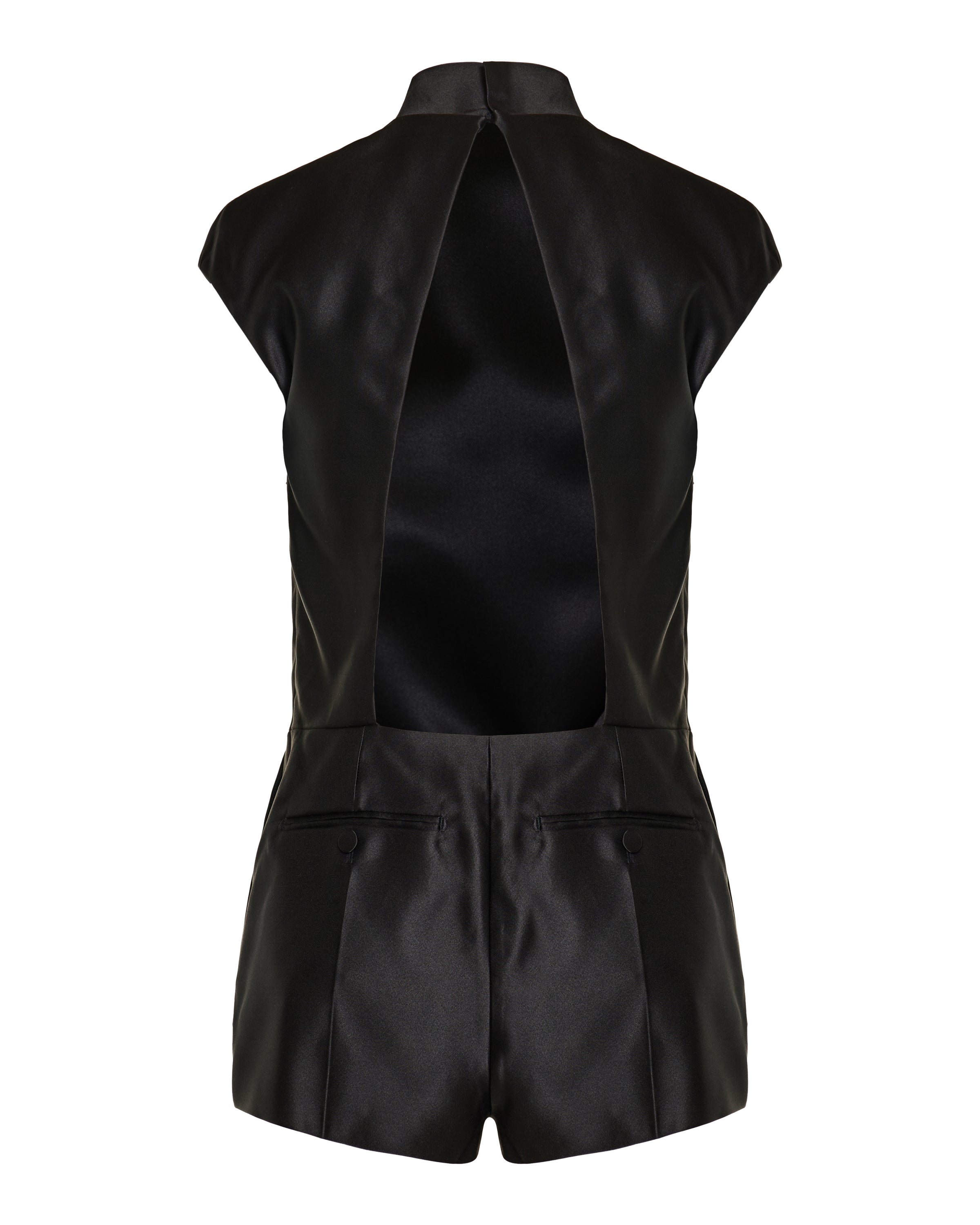 A refined Tom Ford double silk duchesse playsuit featuring a high-neck bias cut and sculptural open-back design for a sleek, modern silhouette. Crafted in lustrous silk for an elevated evening or formal wardrobe, it exemplifies refined tailoring with contemporary allure.