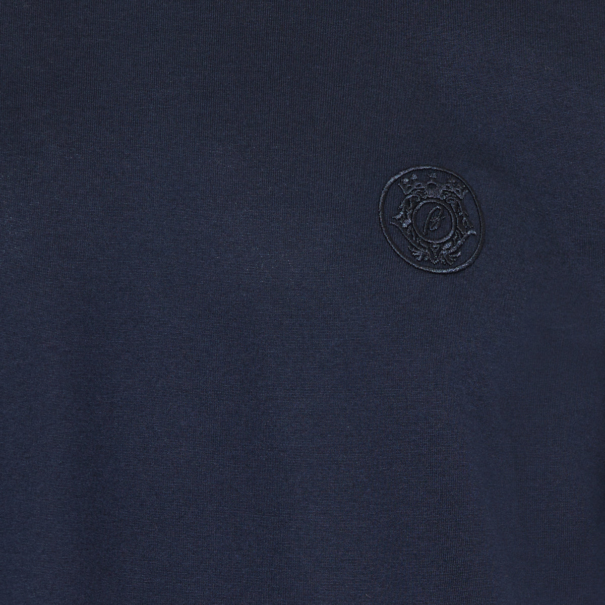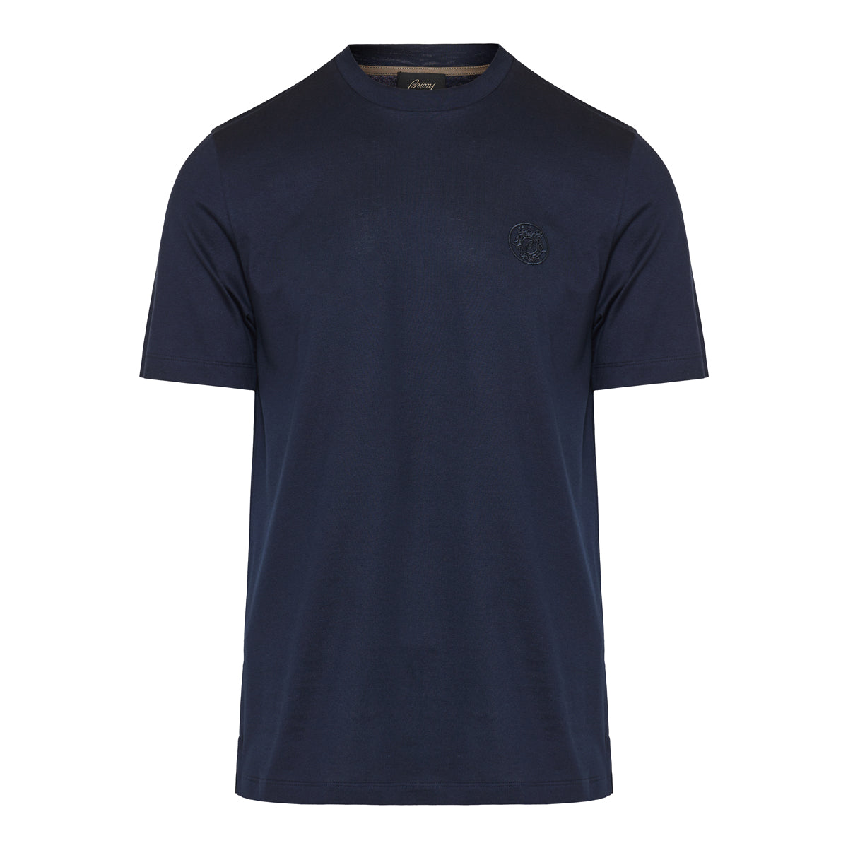 This Brioni T-shirt is crafted in Italy from navy cotton jersey, featuring a subtle embroidered logo, crewneck, and short sleeves. Its regular fit and timeless design make it a versatile addition to any wardrobe.