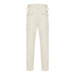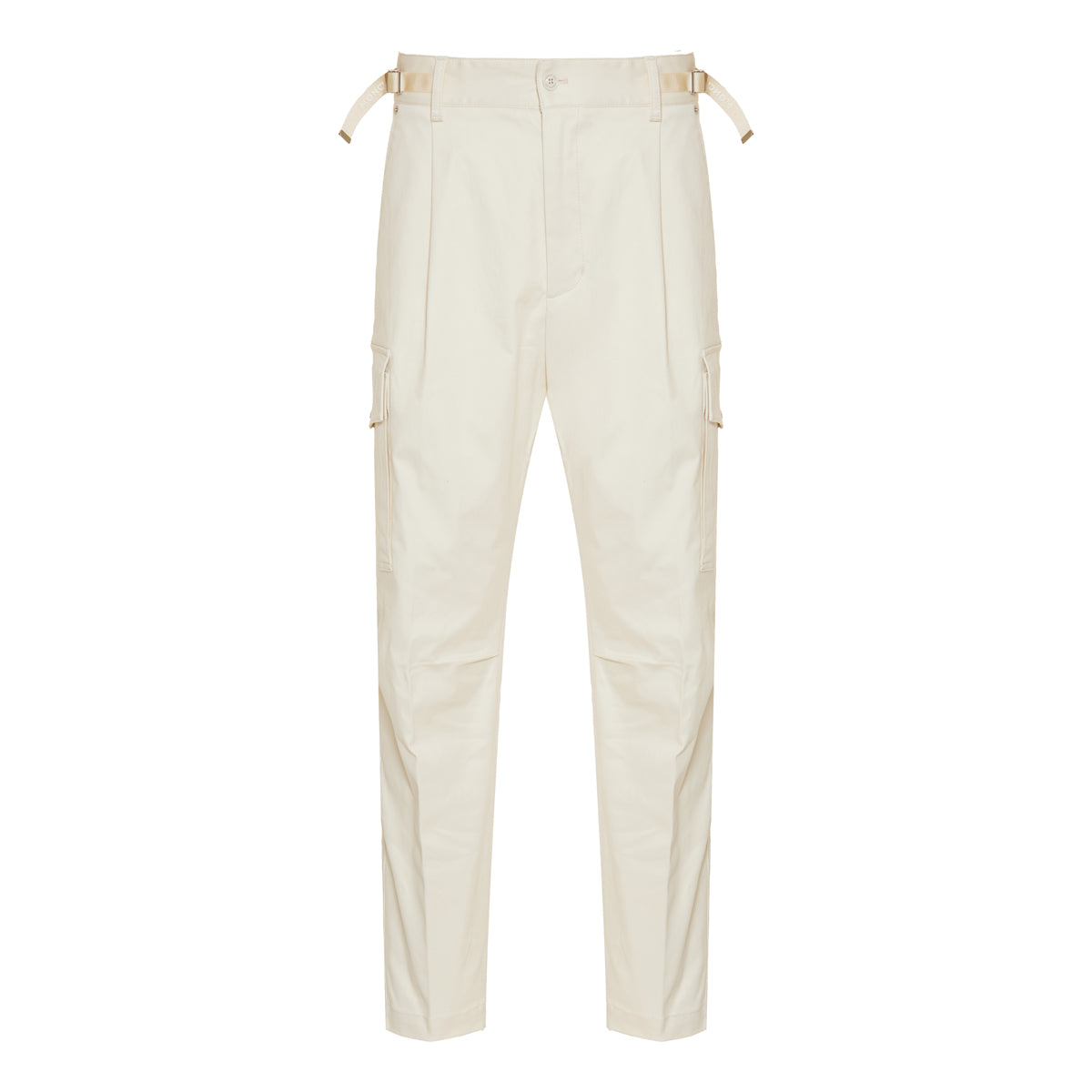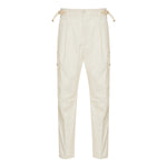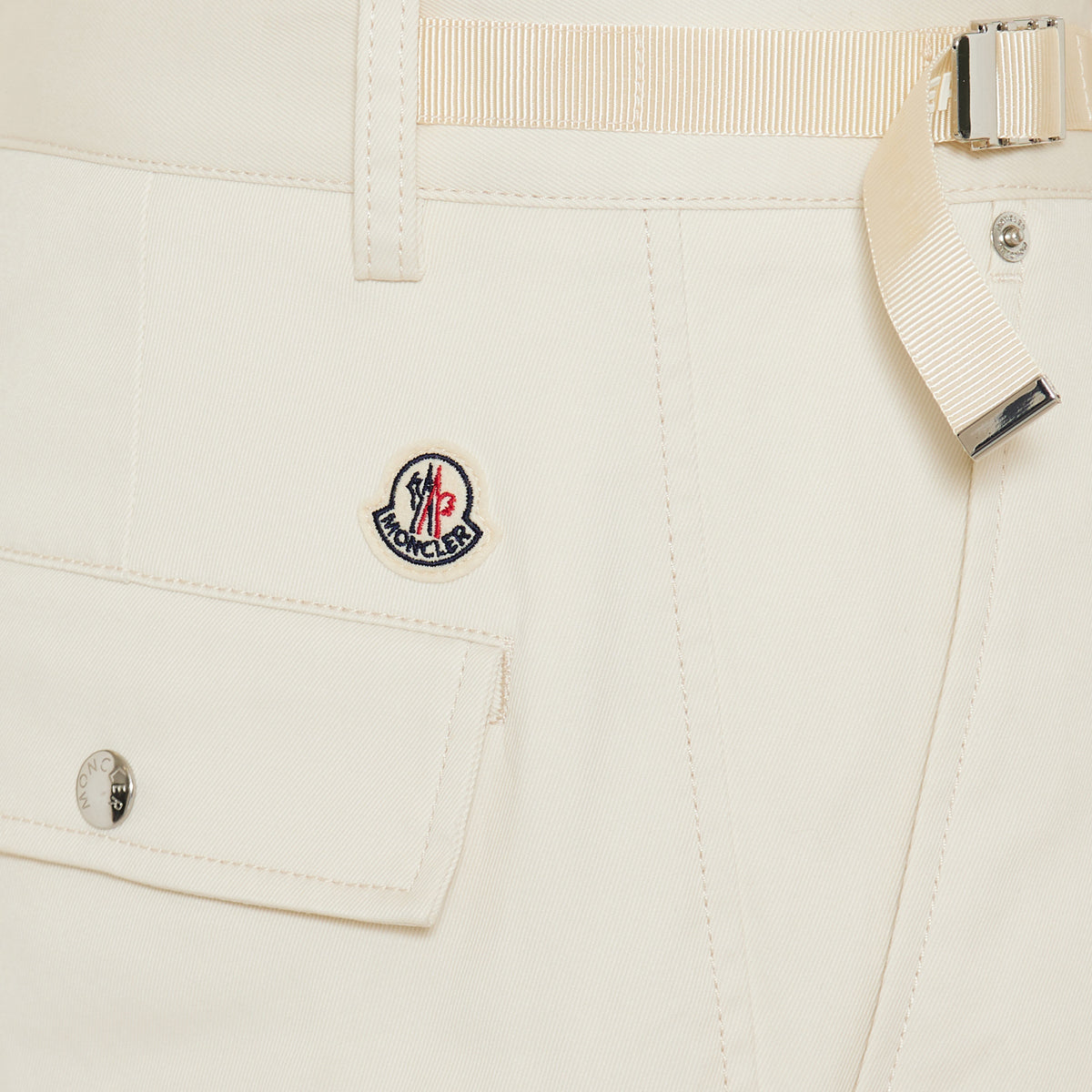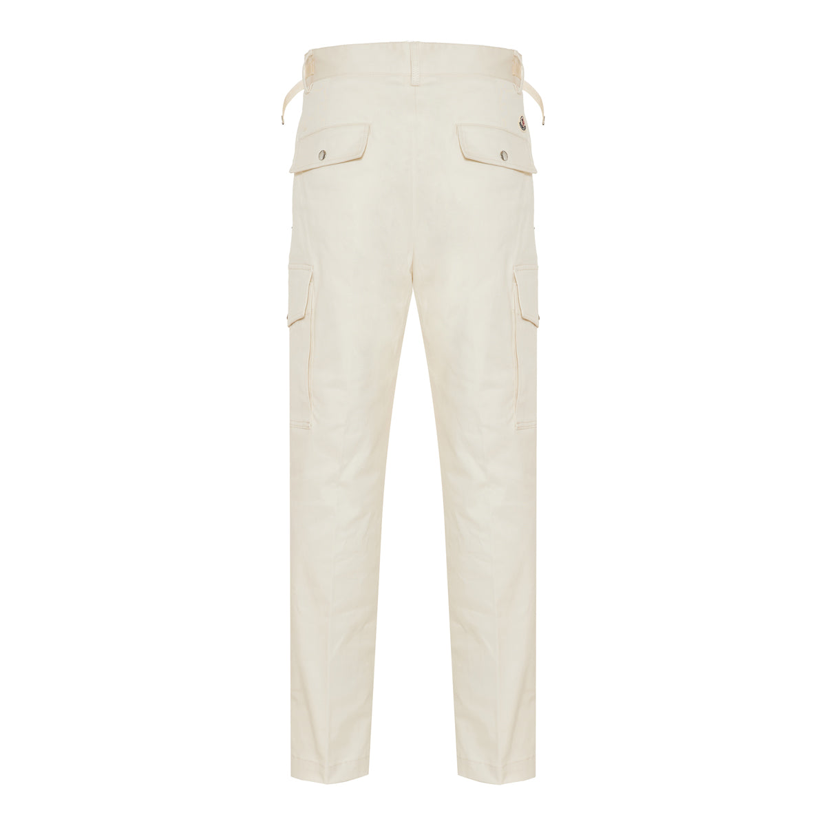 These White Ivory cargo trousers from Moncler are crafted from stretch cotton gabardine, offering a relaxed fit with spacious cargo pockets. The adjustable waistband features logo straps, adding a modern touch to the utilitarian design.