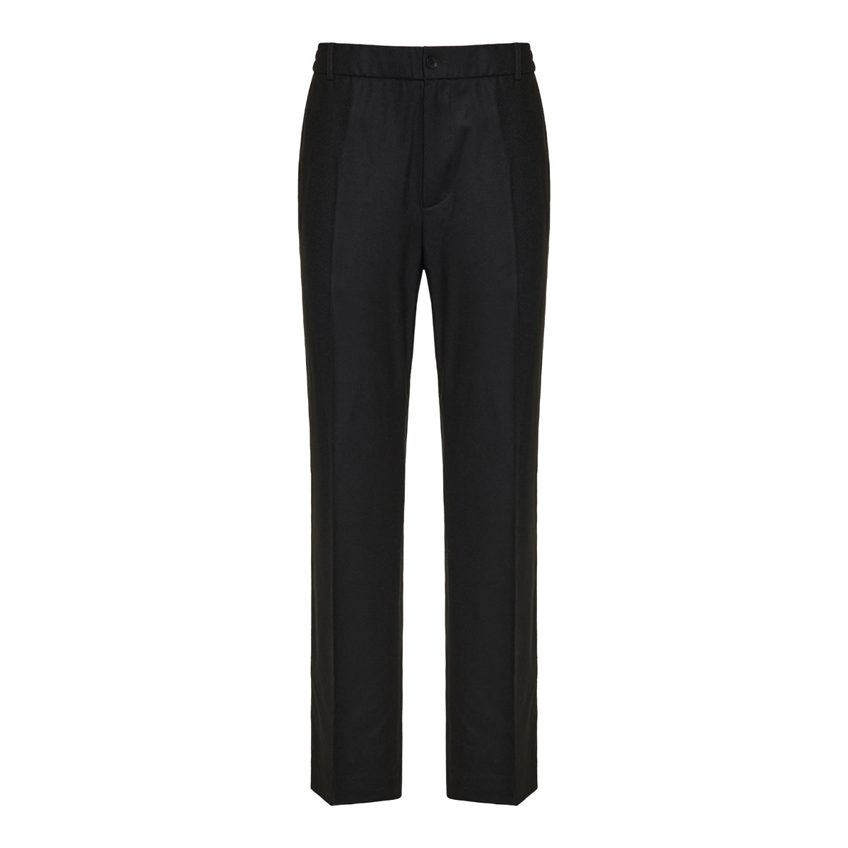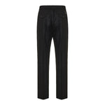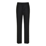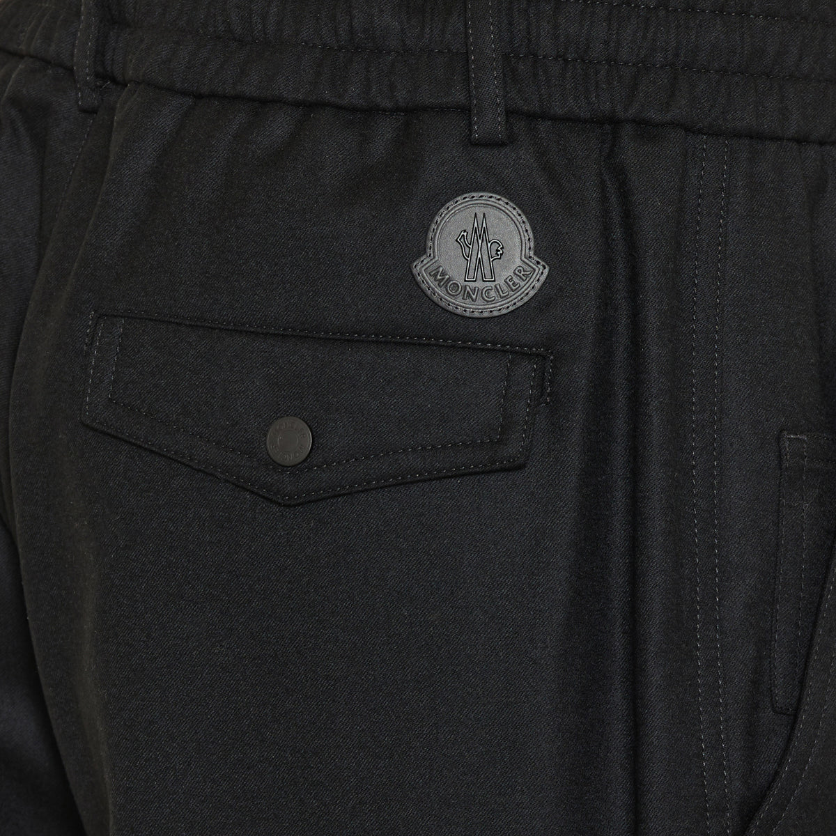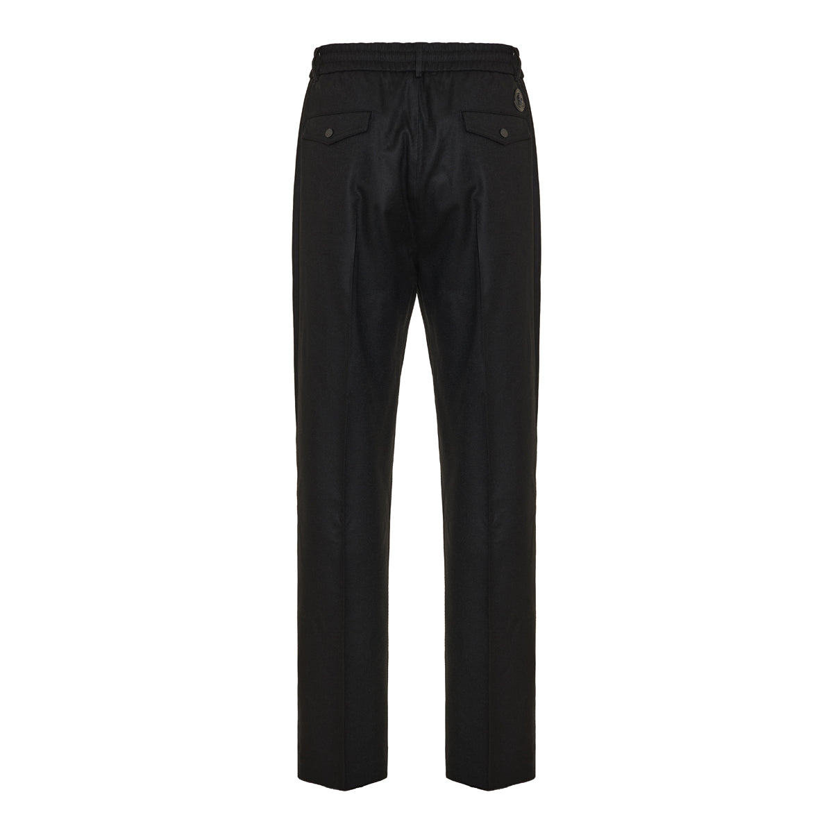 These Black wool flannel trousers from Moncler offer a tailored silhouette, featuring a drawstring waistband, button and zip closure, snap button pockets, and ribbed trim. Crafted from 100% virgin wool, they provide a sophisticated look suitable for both formal and casual occasions.