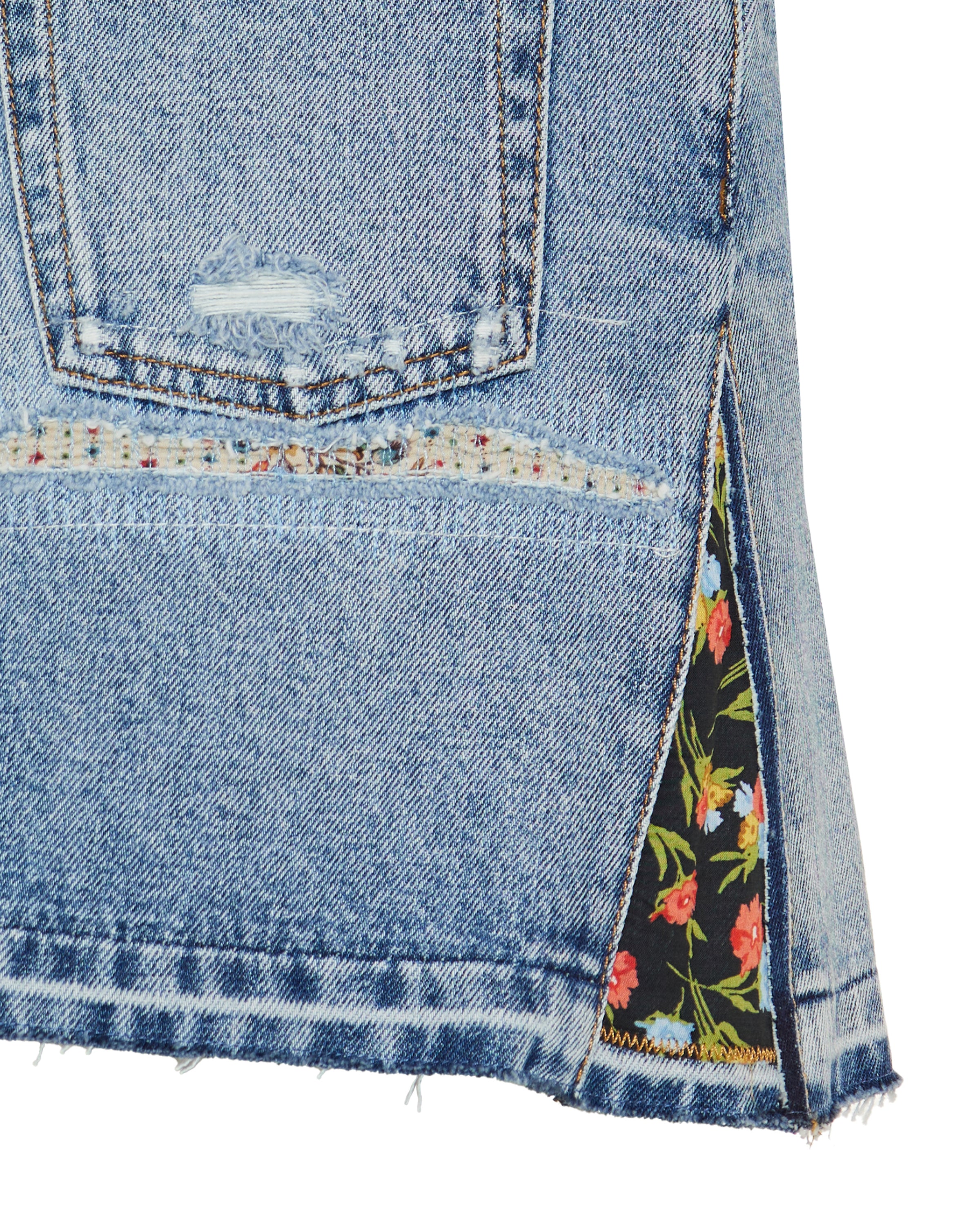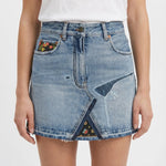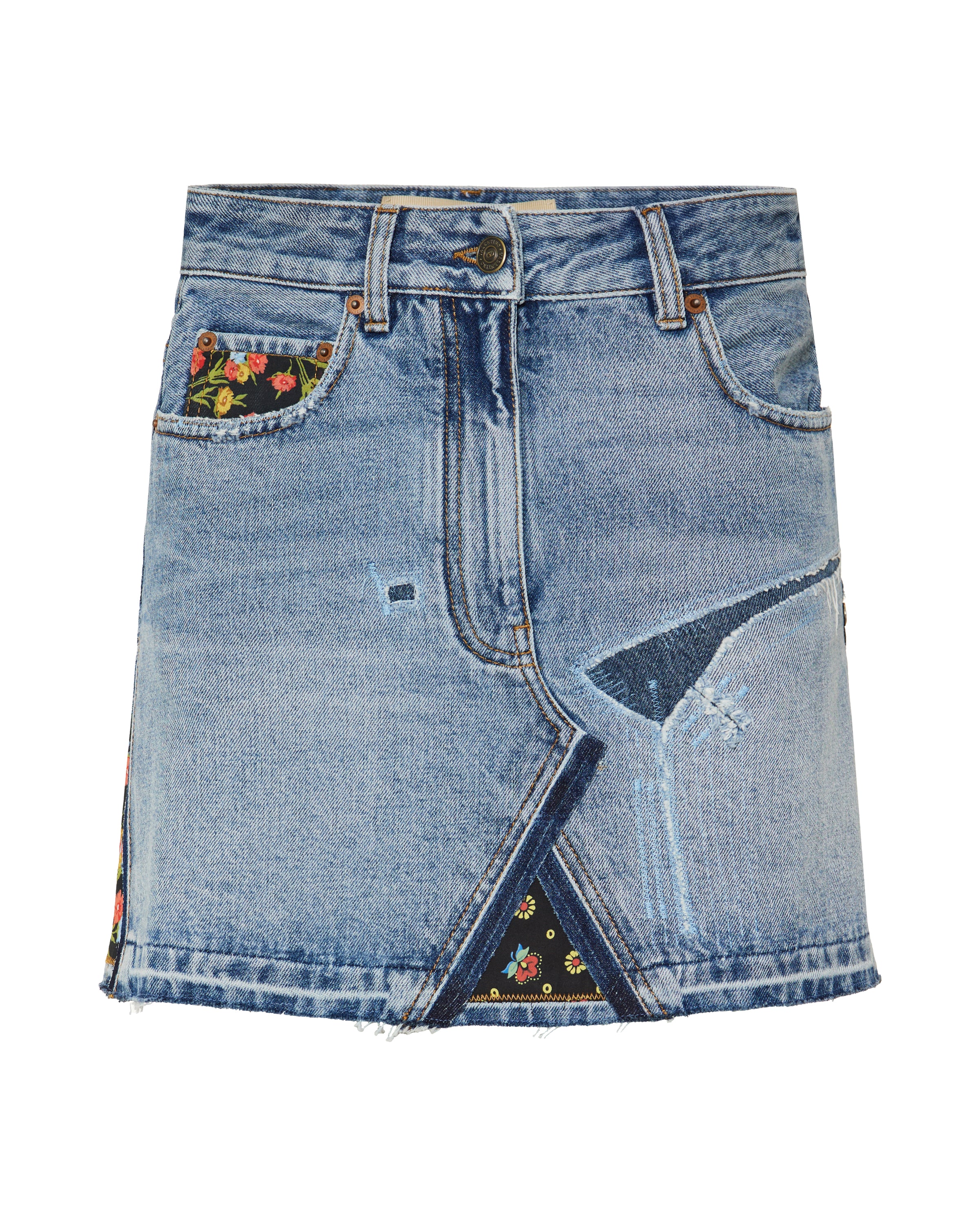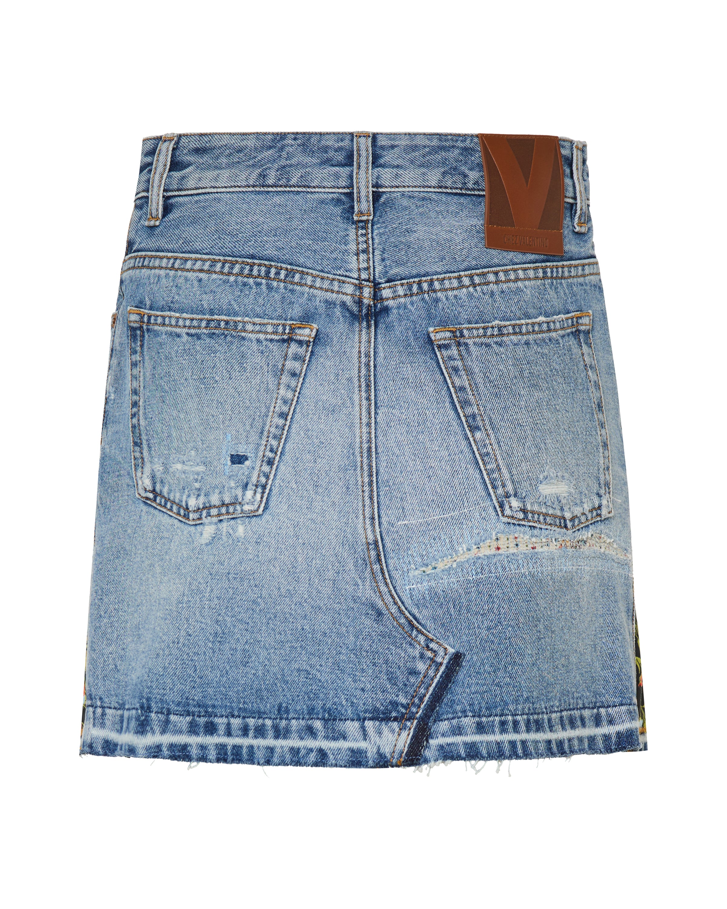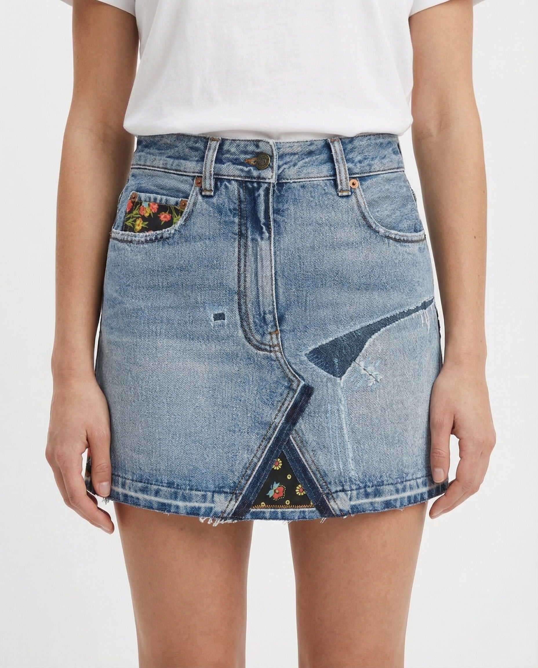 A structured skirt crafted from rigid denim with a clean, sculpted silhouette, combining casual material with tailored proportions.
