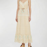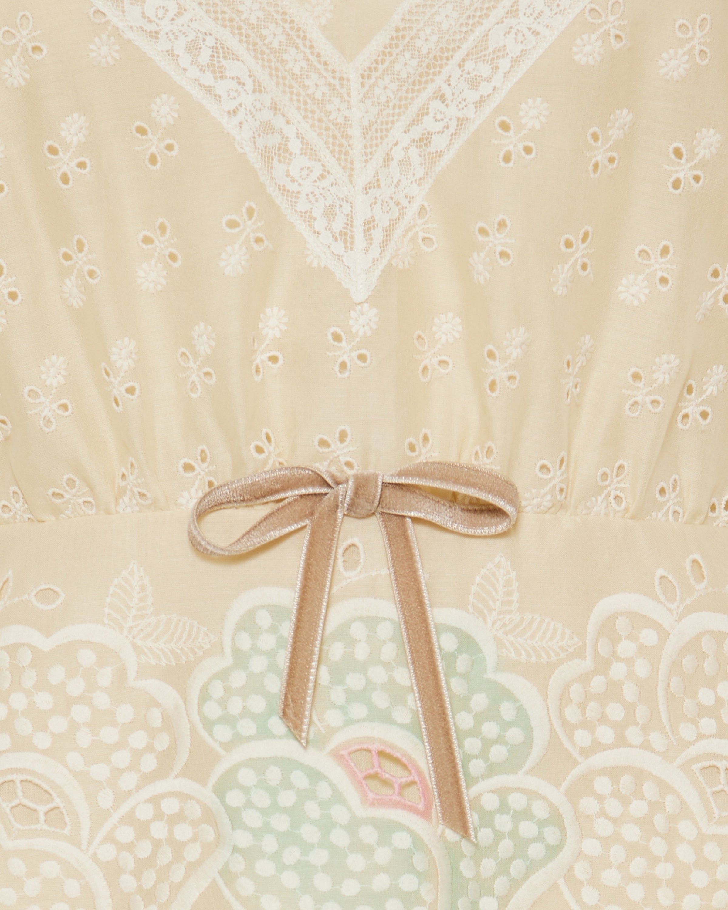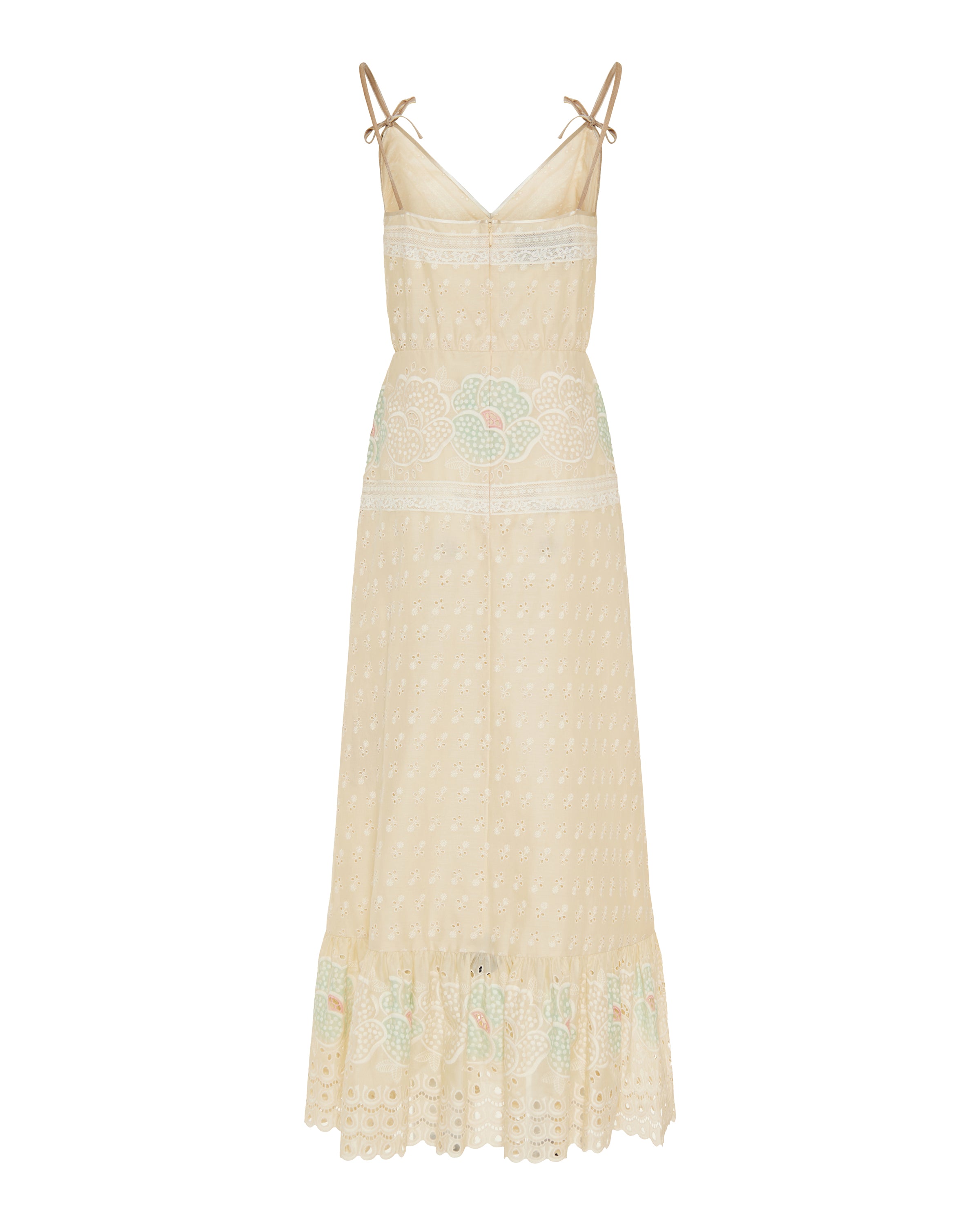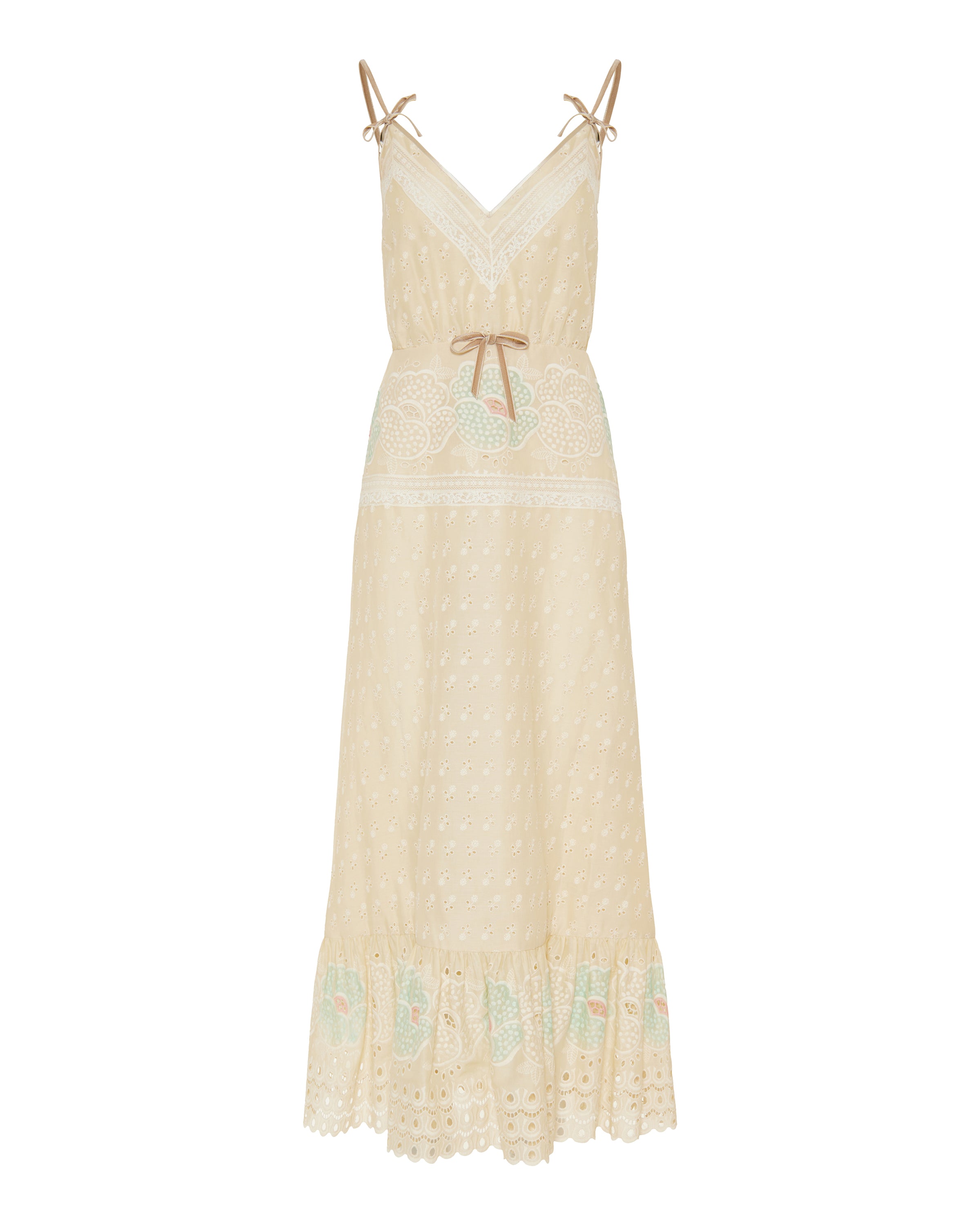 This maxi dress is crafted from lightweight cotton and detailed with delicate lace trims that frame the neckline and waist. The softly structured silhouette flows effortlessly to a scalloped hem, while slim shoulder straps and a gentle tie at the waist add a refined, feminine finish. Intricate embroidery and a subtle multicolour motif lend a romantic, summery feel that moves easily from daytime occasions to warm-evening wear.
