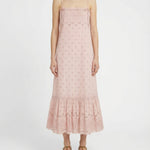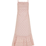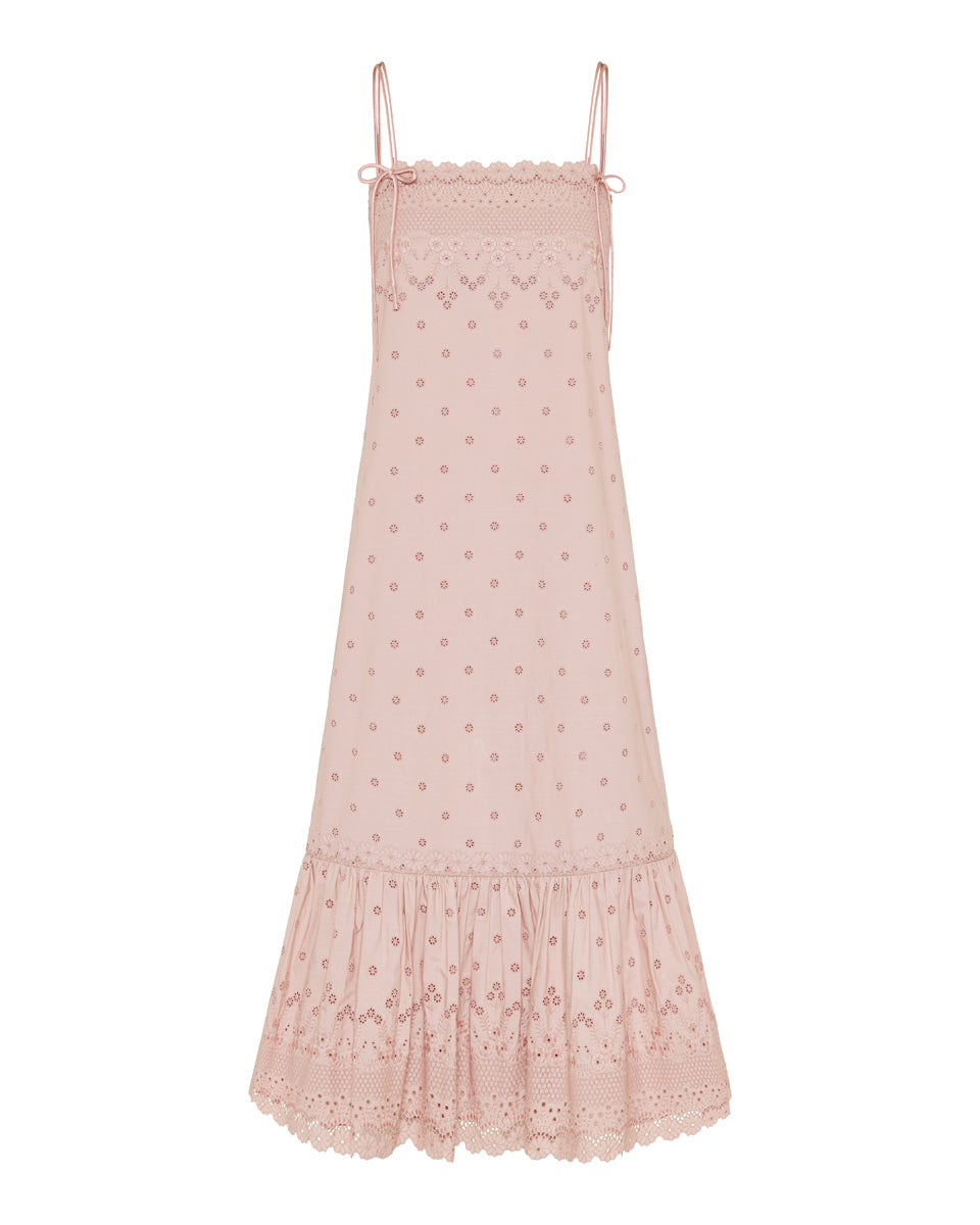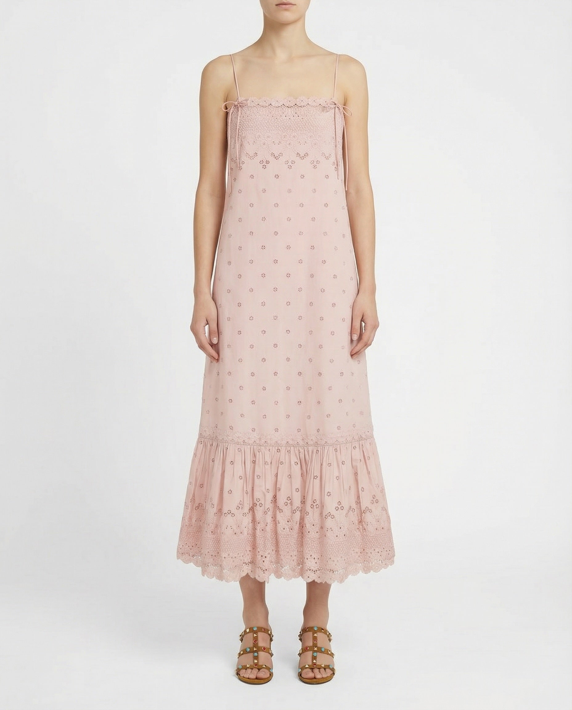 A romantic Valentino dress crafted from broderie anglaise cotton, elevated with delicate silk trims and a feminine, flowing silhouette.