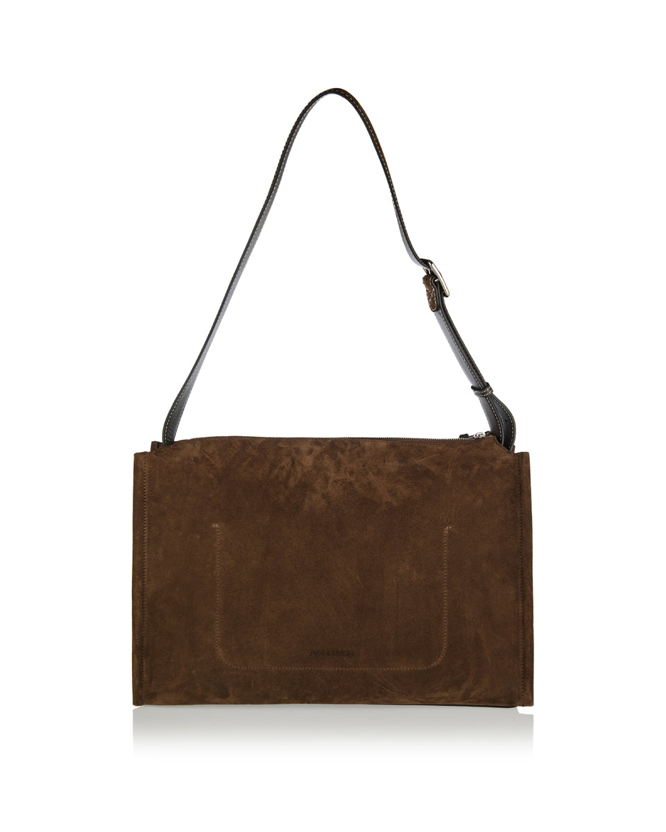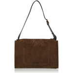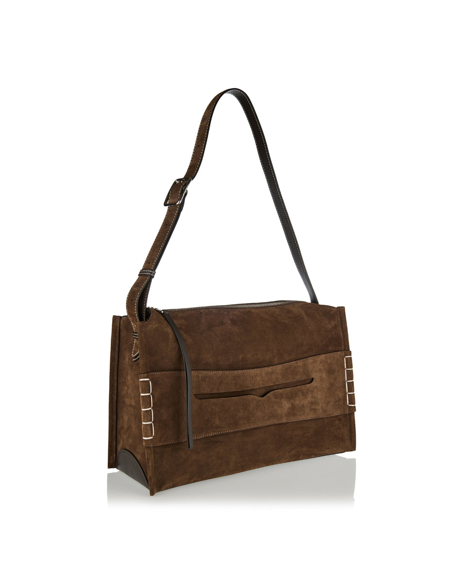 A contemporary messenger bag that reinterprets heritage loafer motifs in soft suede, balancing functional design with distinguished character.