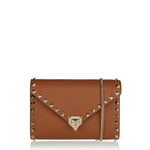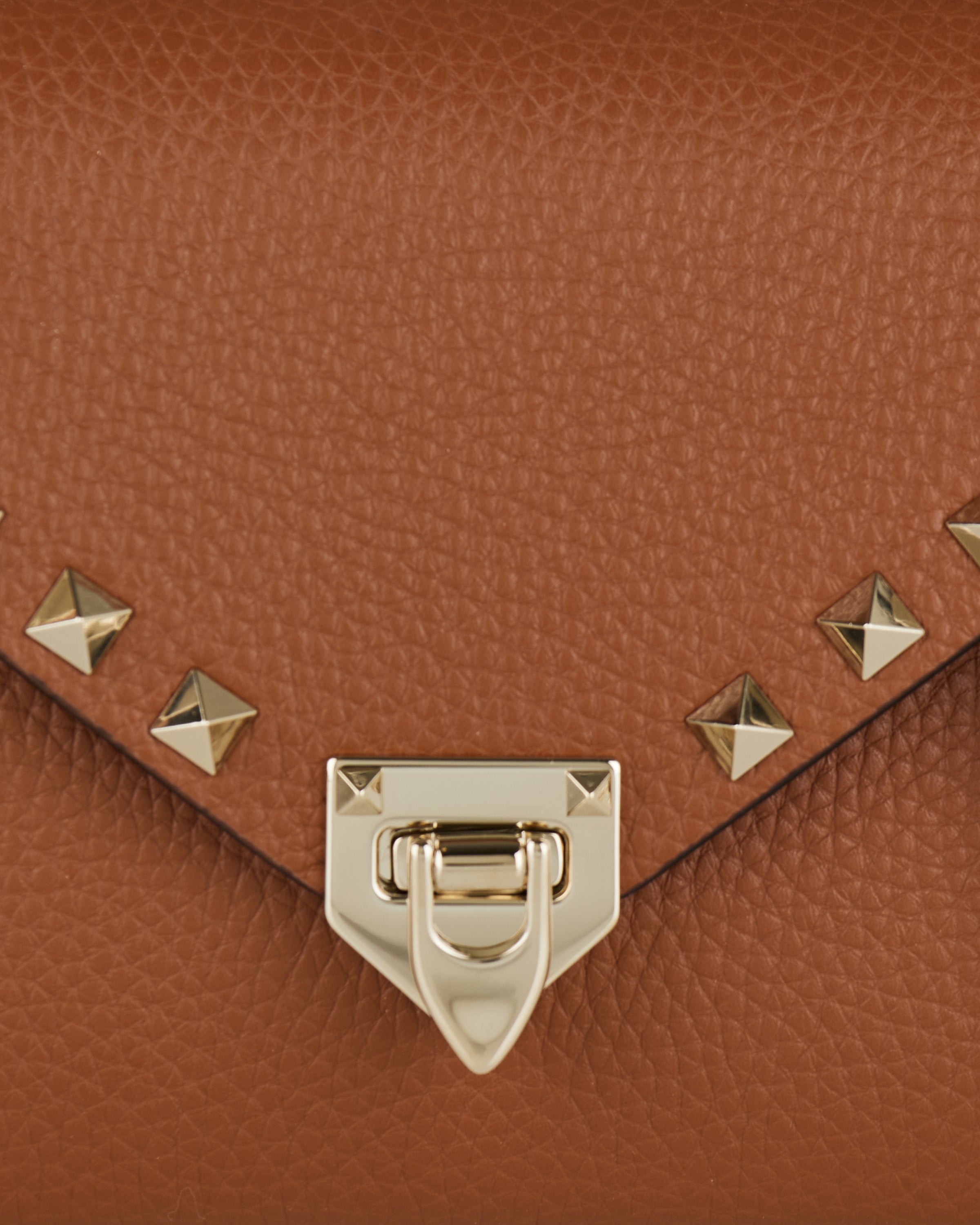 A compact crossbody bag crafted from smooth leather, defined by signature stud detailing and a structured, modern silhouette.