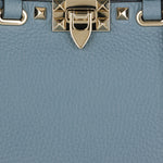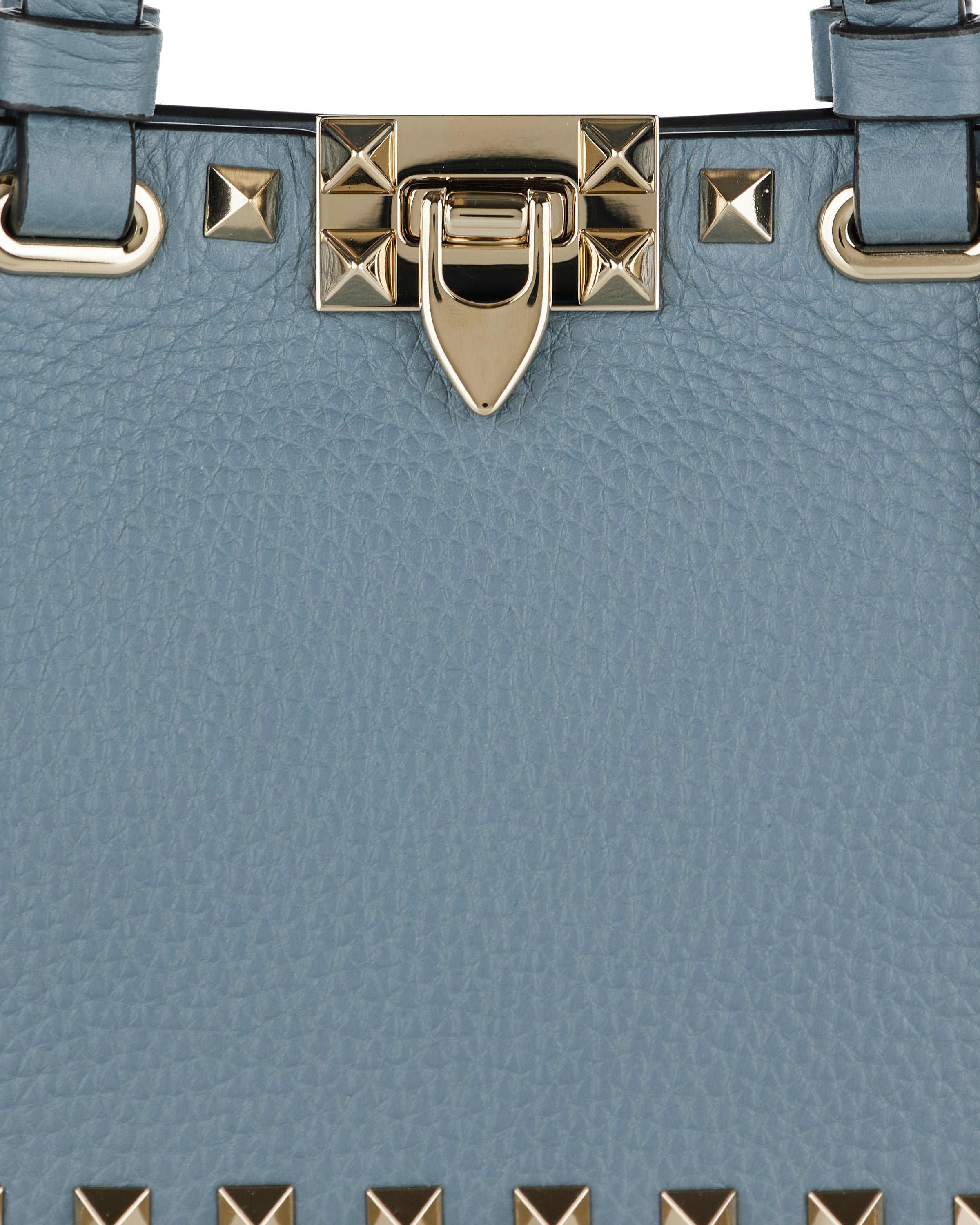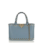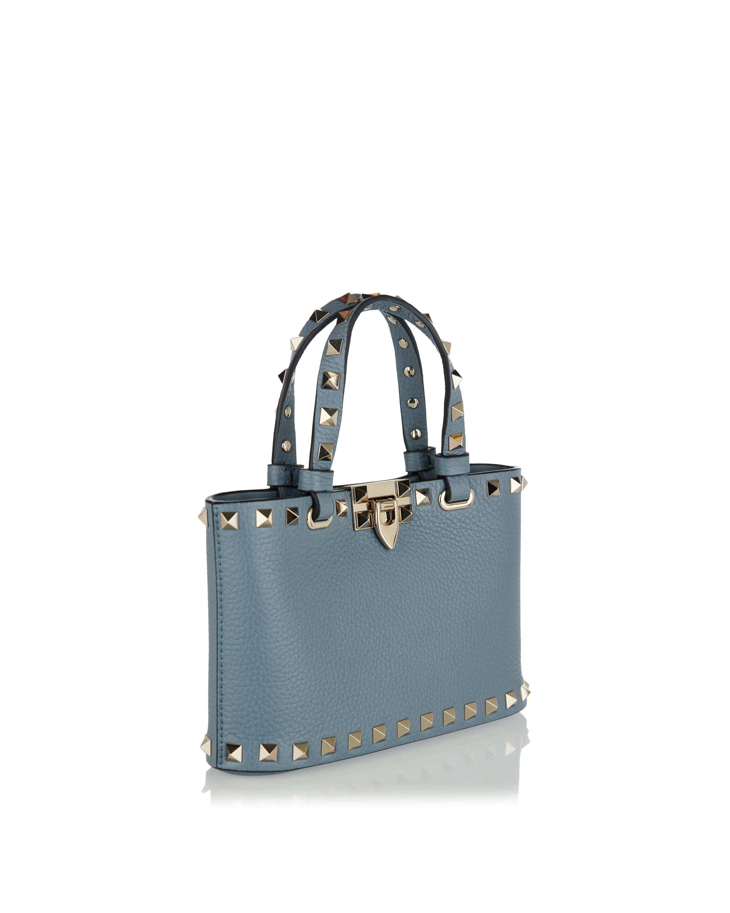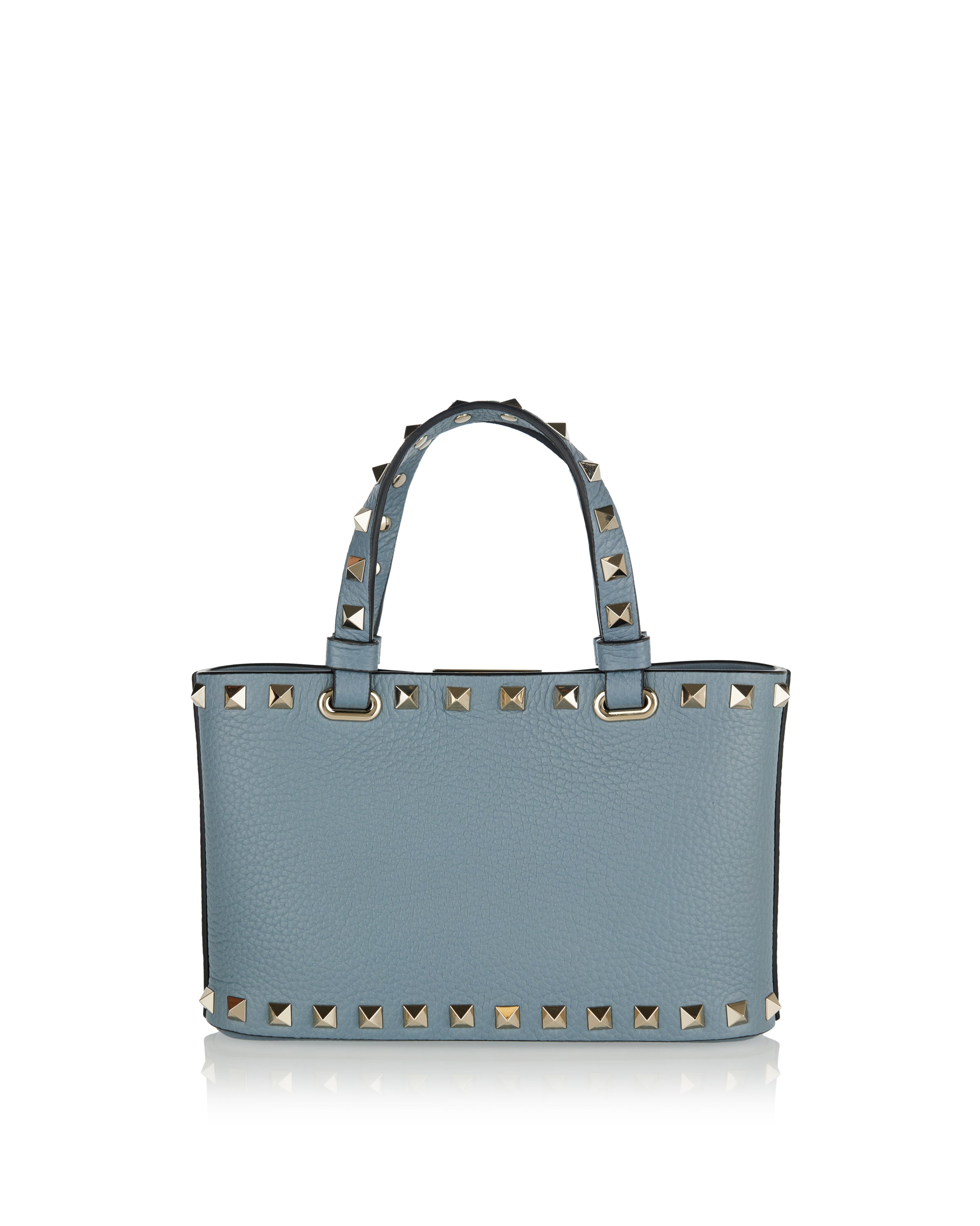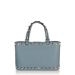 A compact shopping bag crafted from grainy calfskin, defined by a structured silhouette and refined stud detailing.