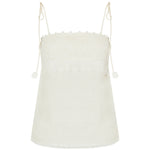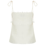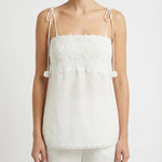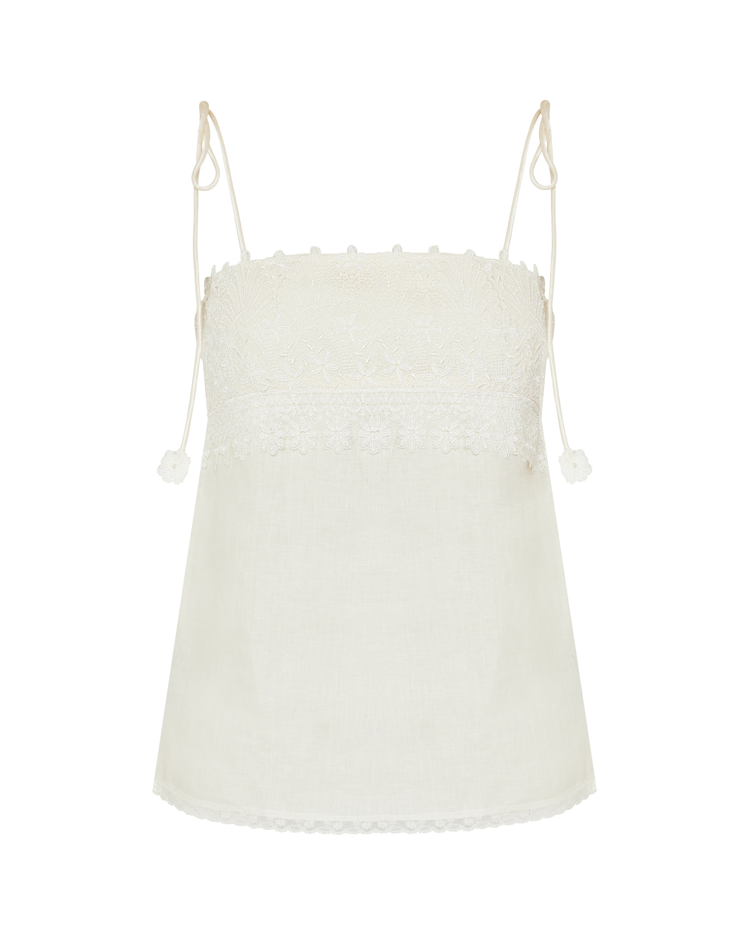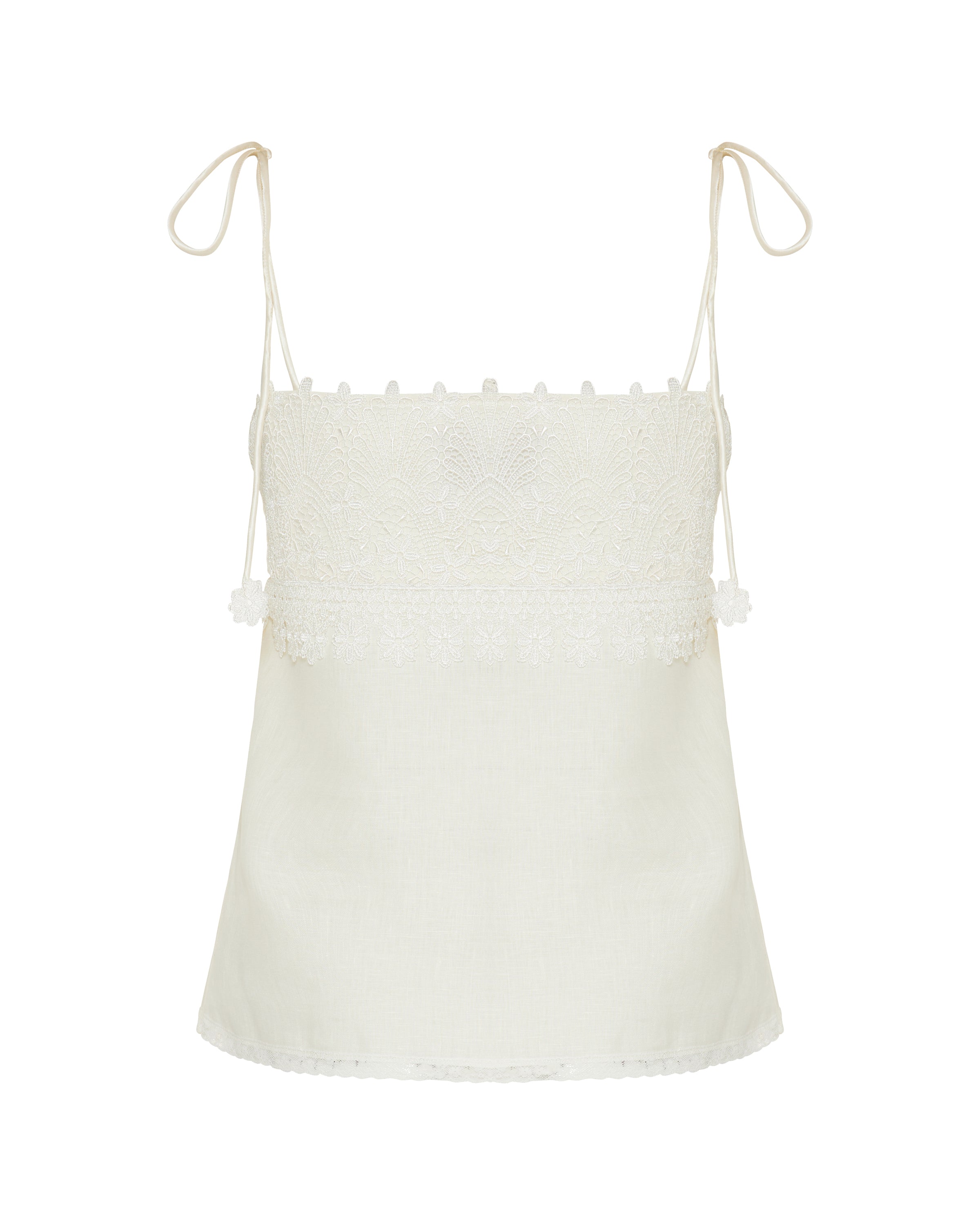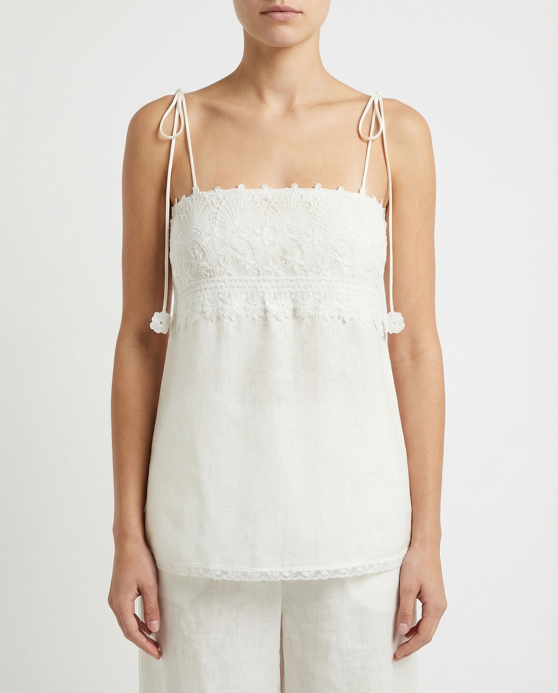 Delicate camisole top crafted from pure linen, featuring intricate lace detailing and a lightweight silhouette for effortless summer elegance.
