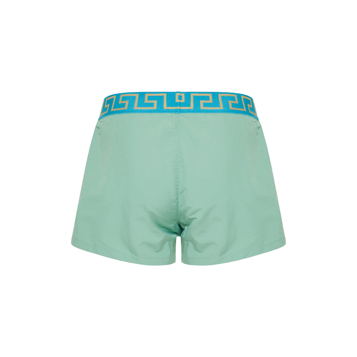 Versace swim shorts crafted in lightweight green fabric, detailed with the iconic Greca border motif at the elastic waistband. Designed for comfort and style, this versatile piece blends practicality with signature house codes, making it a refined addition to both poolside and beachwear wardrobes.