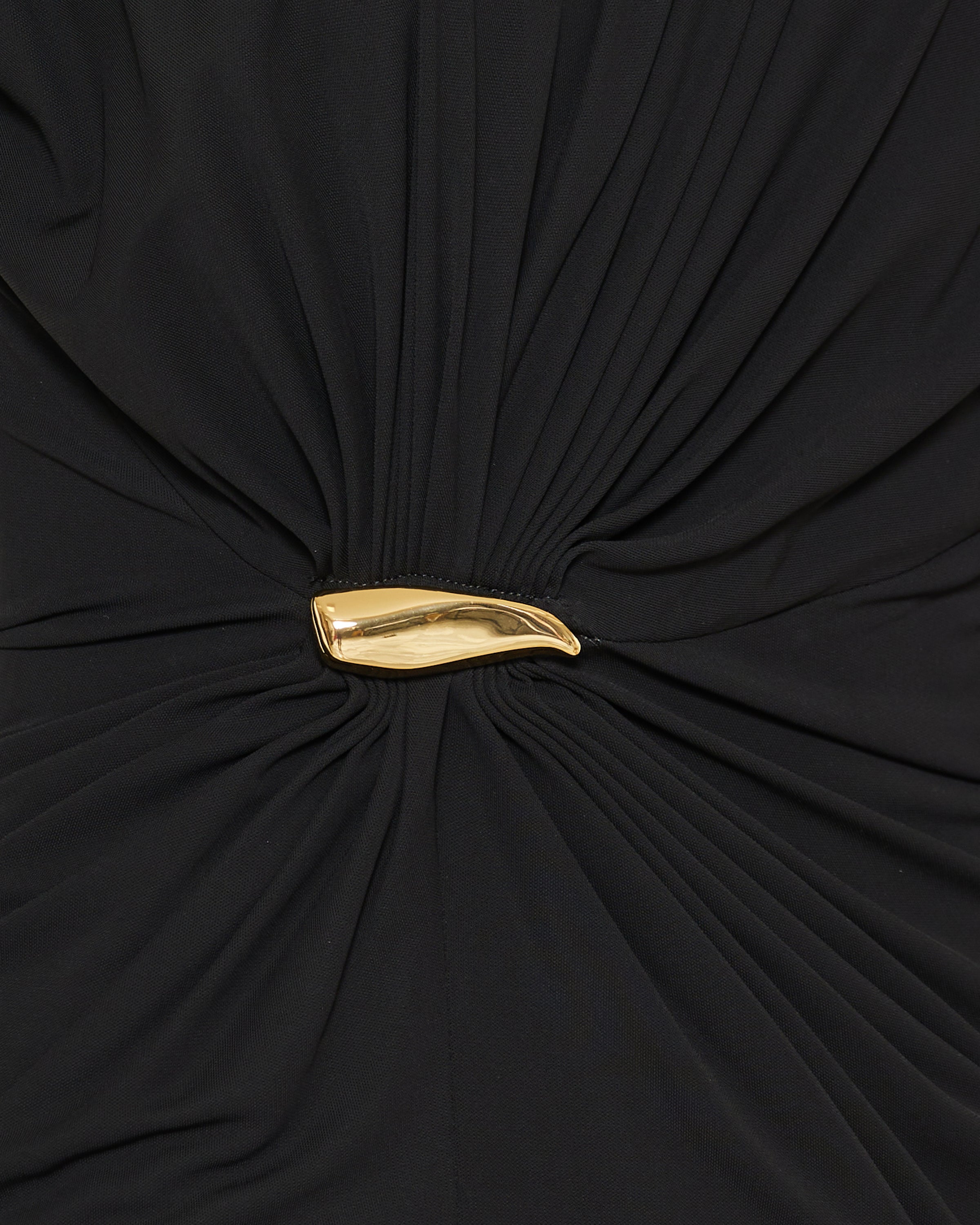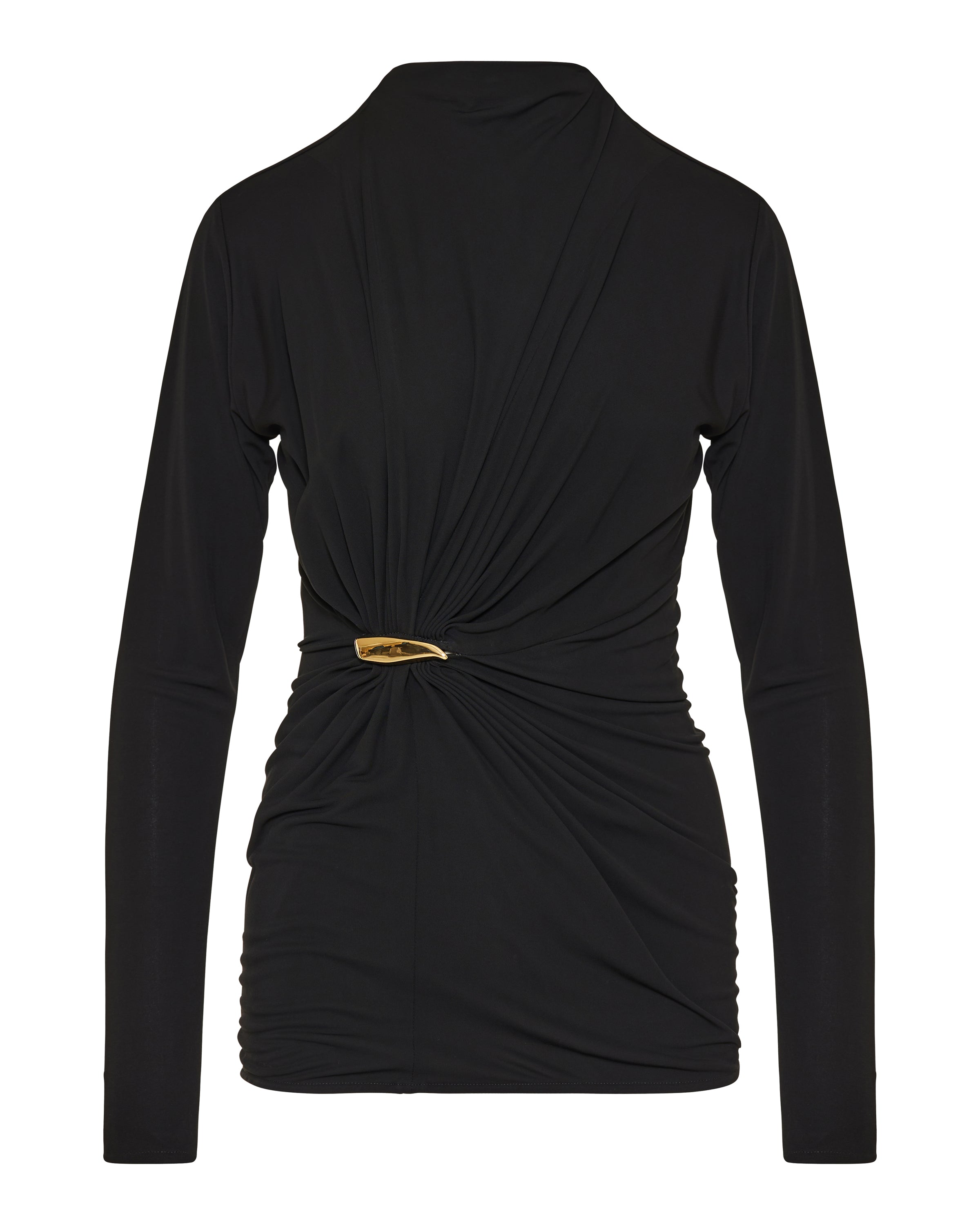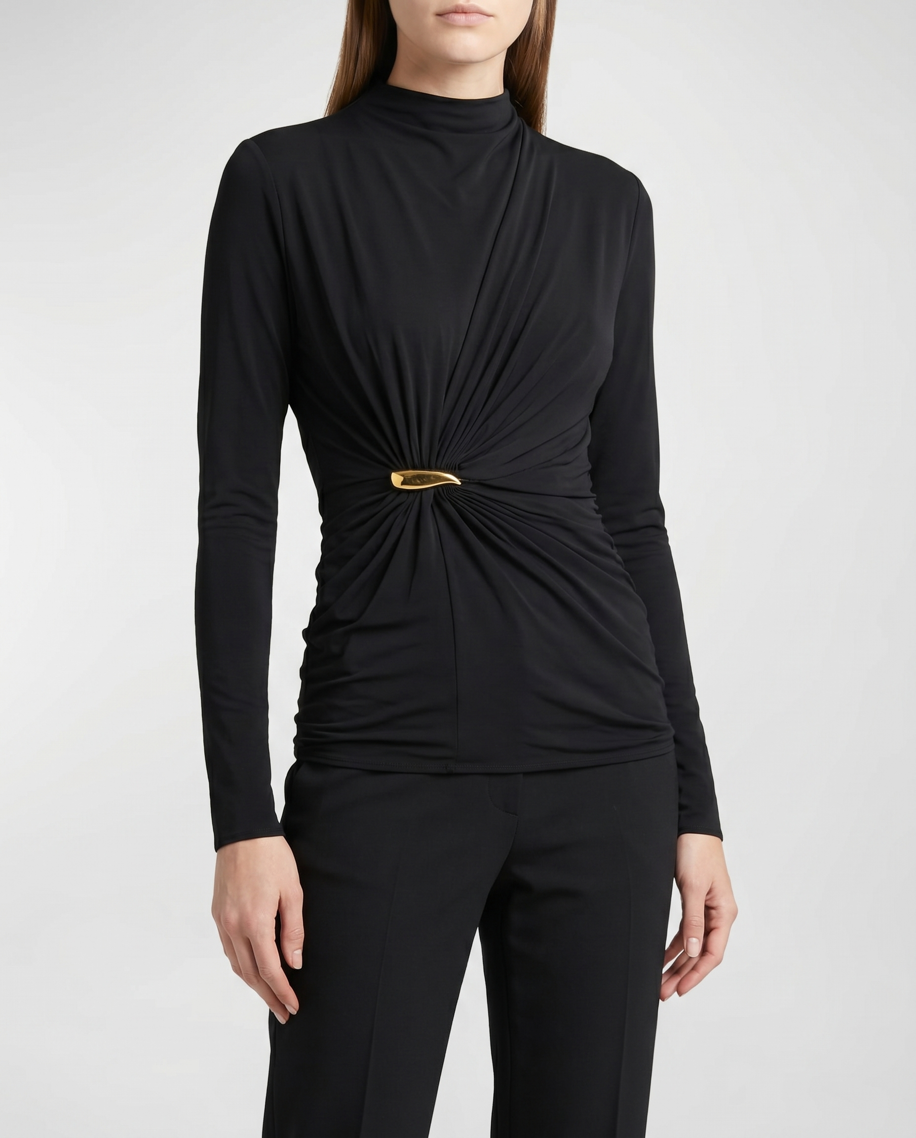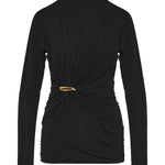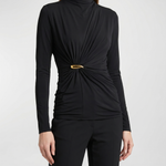 A softly draped jersey top defined by gathered construction and subtle embellishment, creating a refined sculptural silhouette.