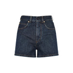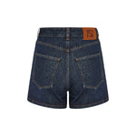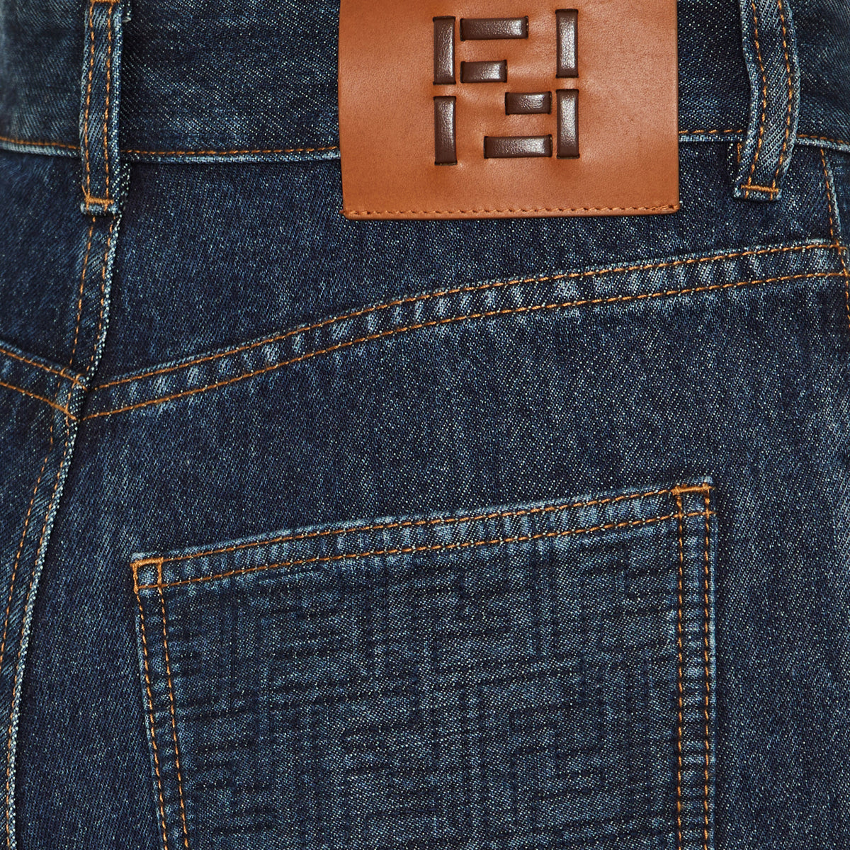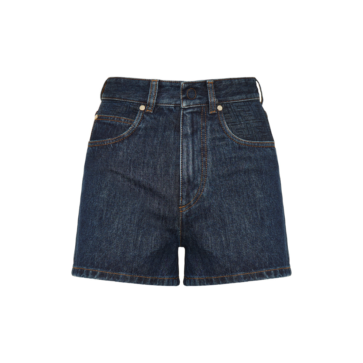 These Fendi five-pocket shorts are tailored in dark blue stretch denim with a flared silhouette and quilted FF motif on the front and back pockets. Finished with palladium-finish metal rivets and a concealed zip and press-stud closure, they blend relaxed elegance with iconic brand signature. Ideal for elevated casual styling.