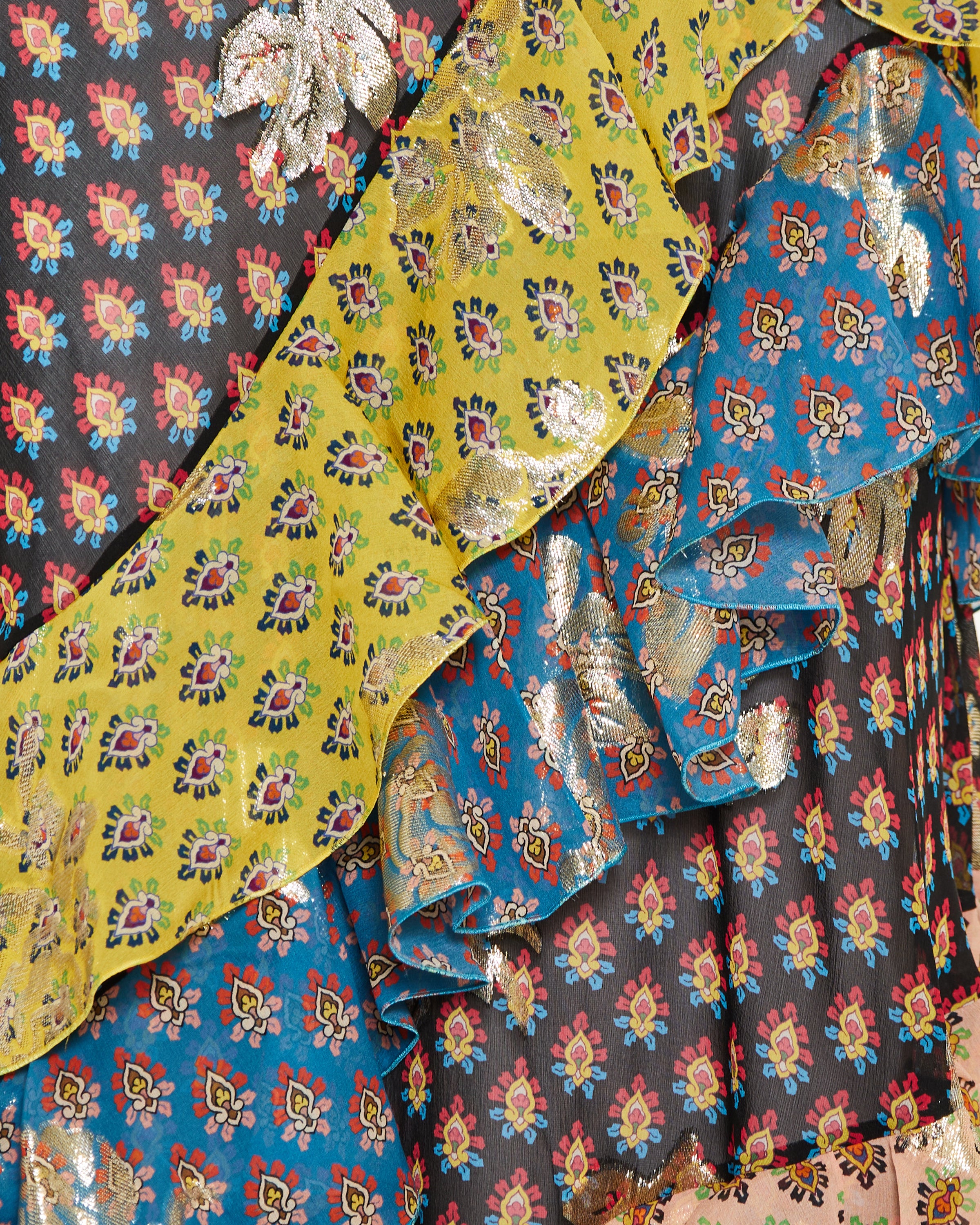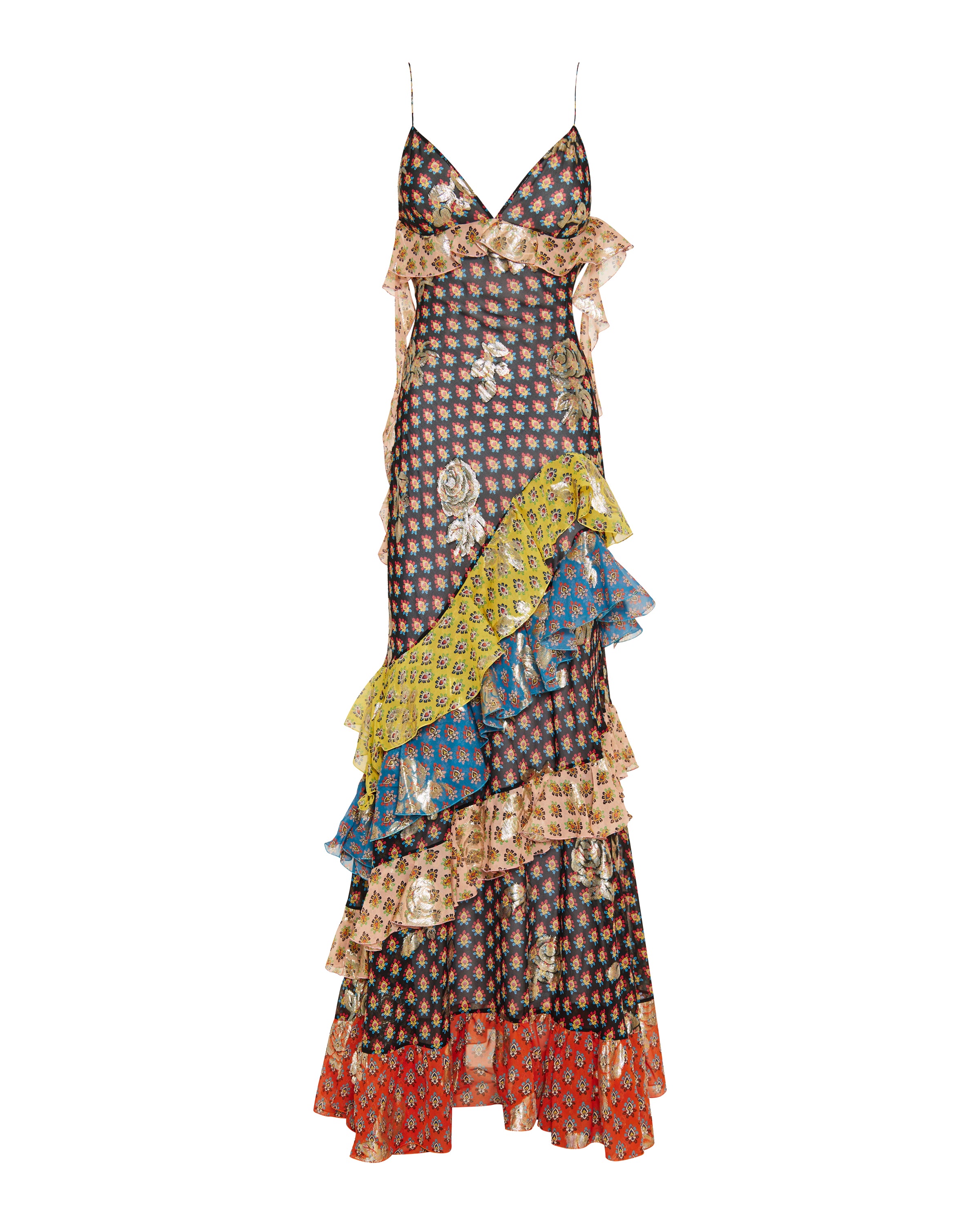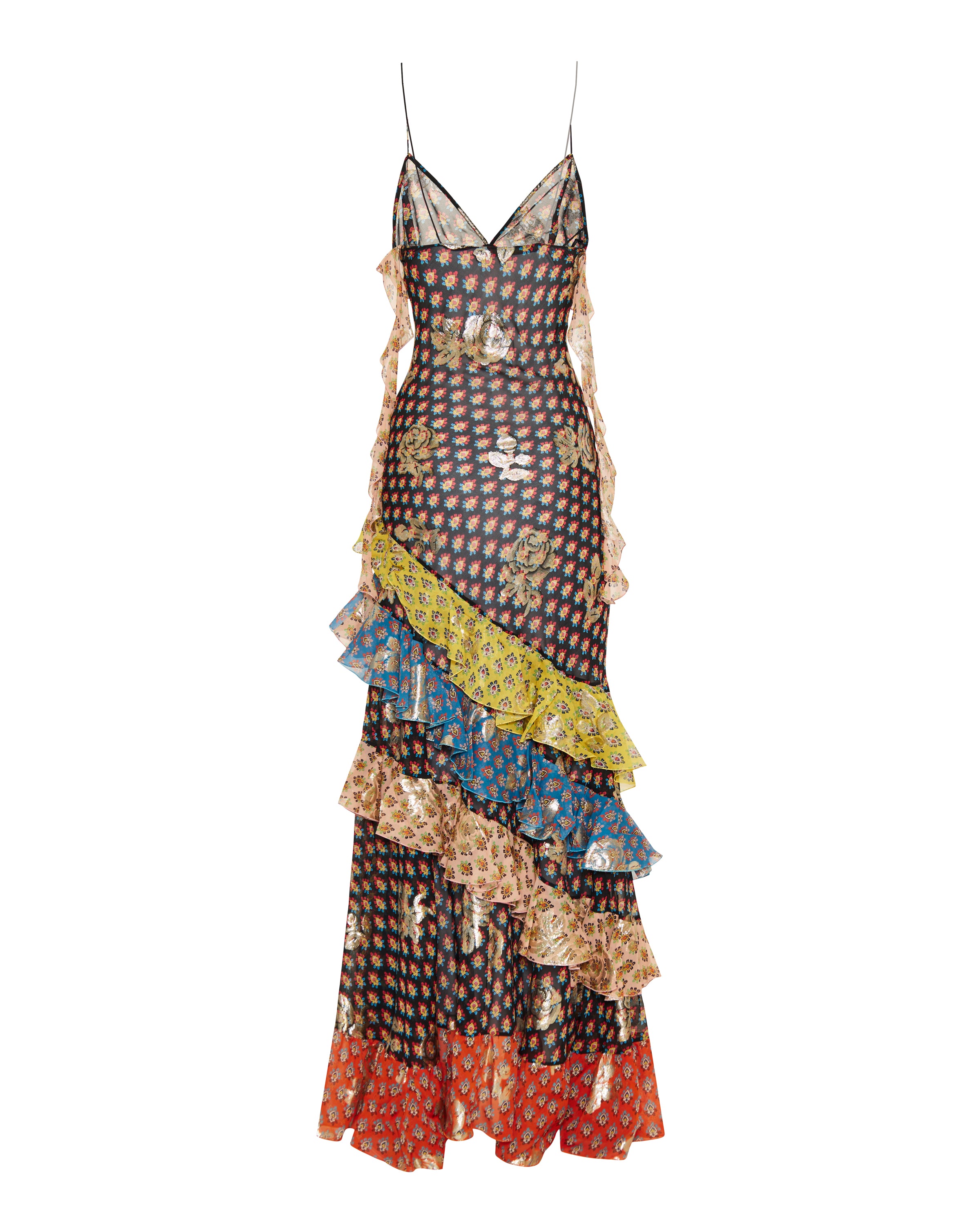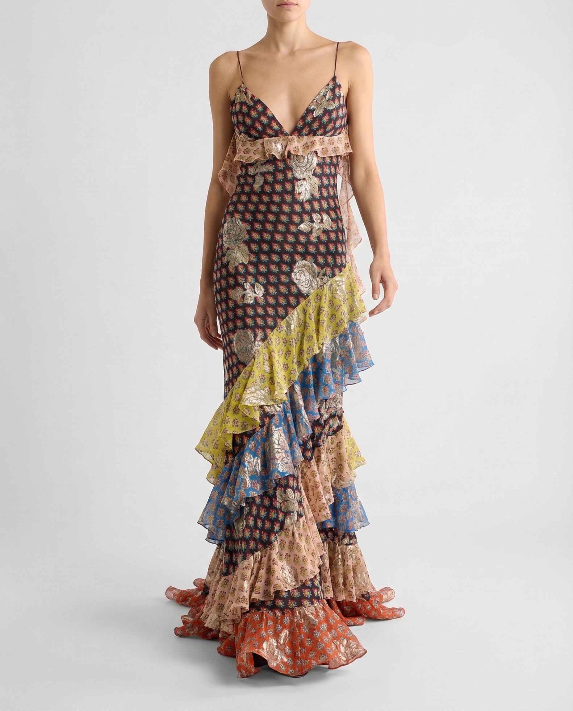 A flowing silk dress enriched with fil coupé roses and a tie-inspired motif, creating a fluid silhouette with refined texture.