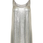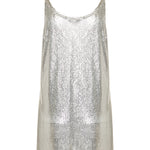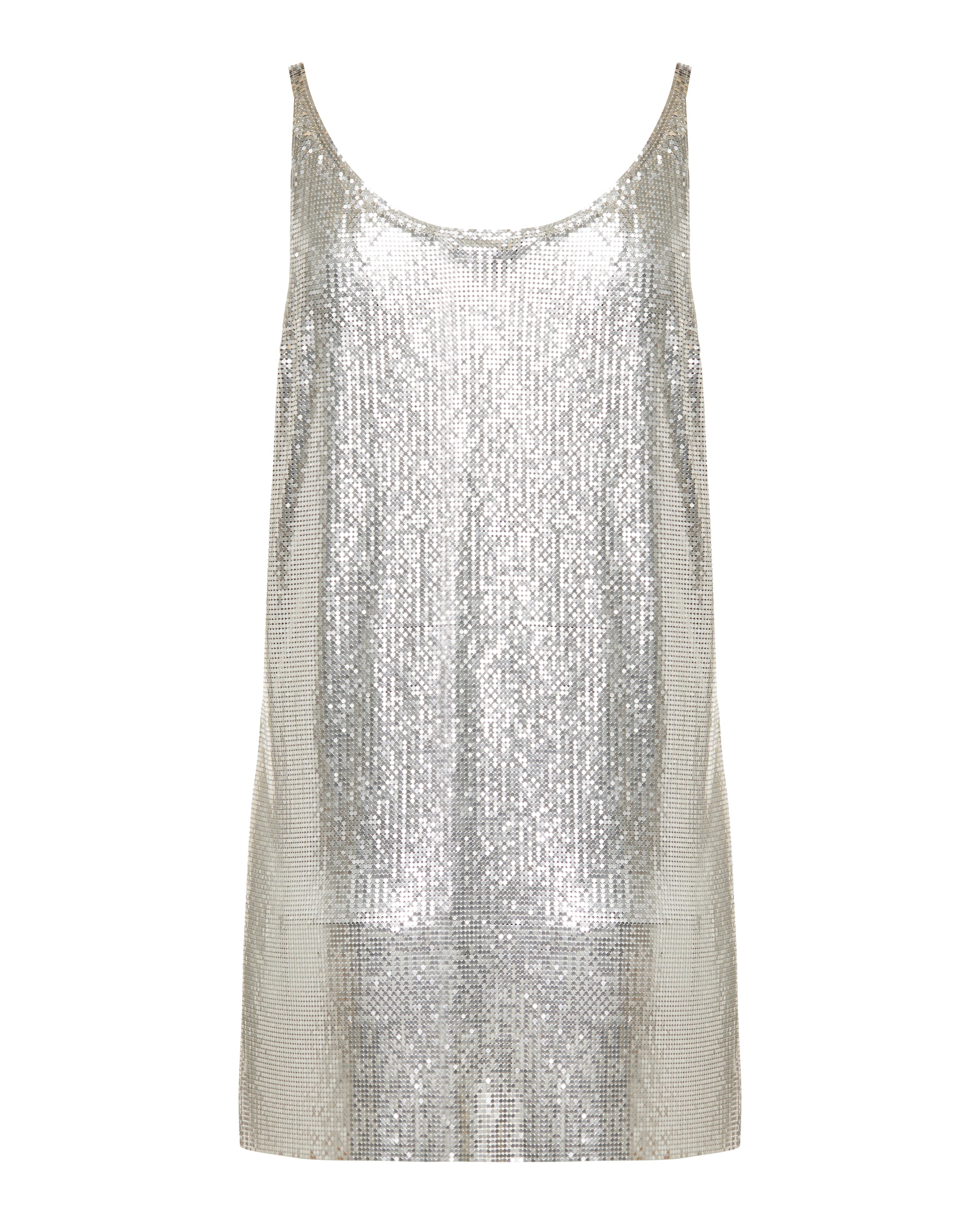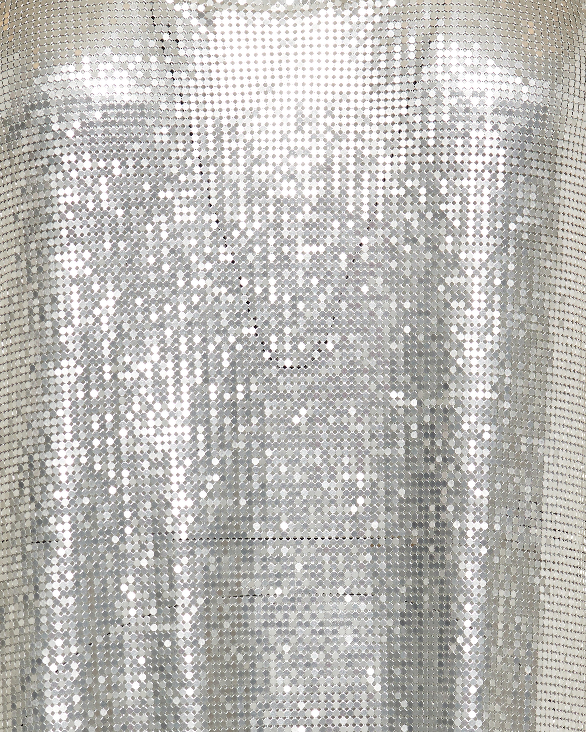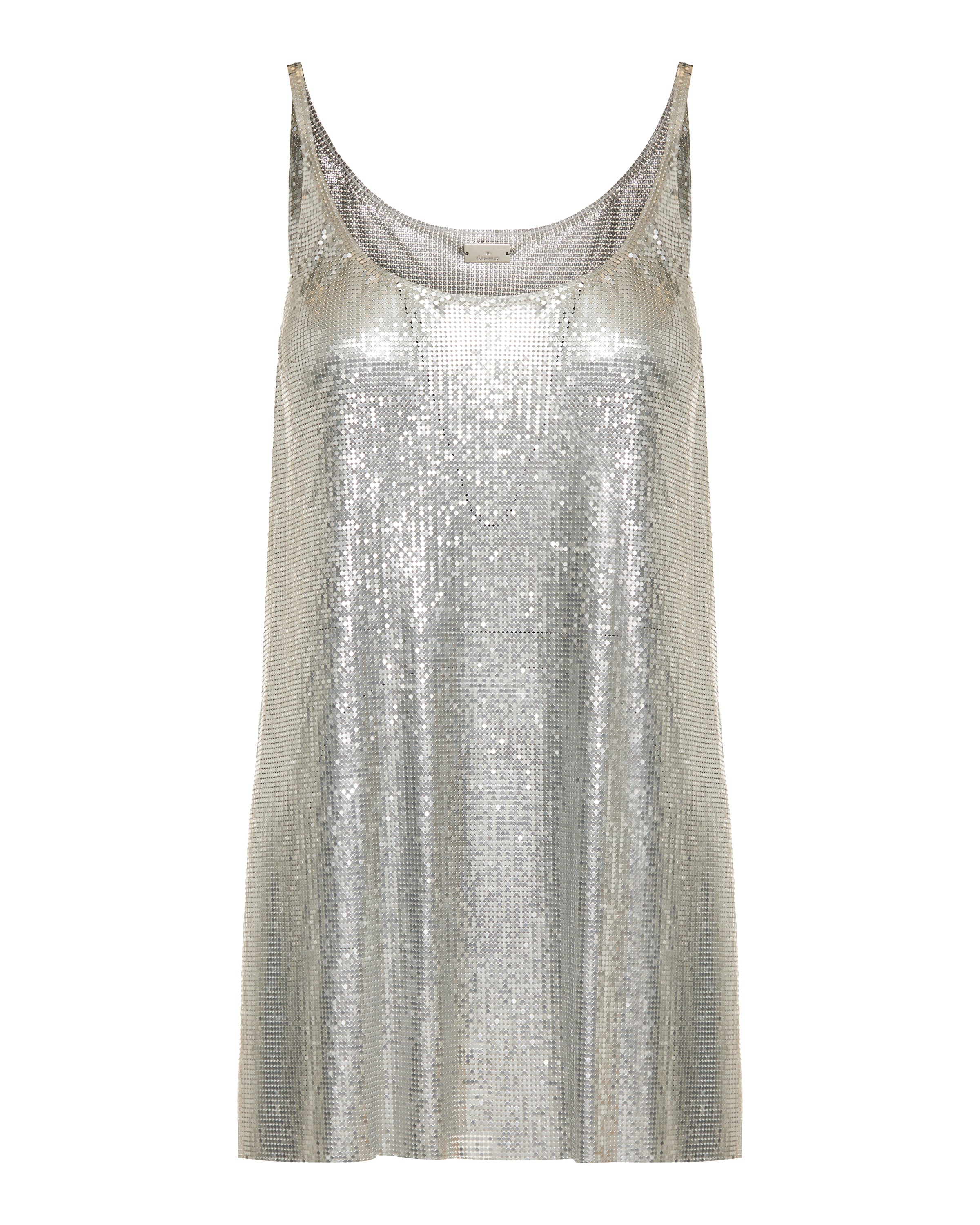 A sleek, structured tank silhouette in metallic mesh with subtle shine and modern edge.