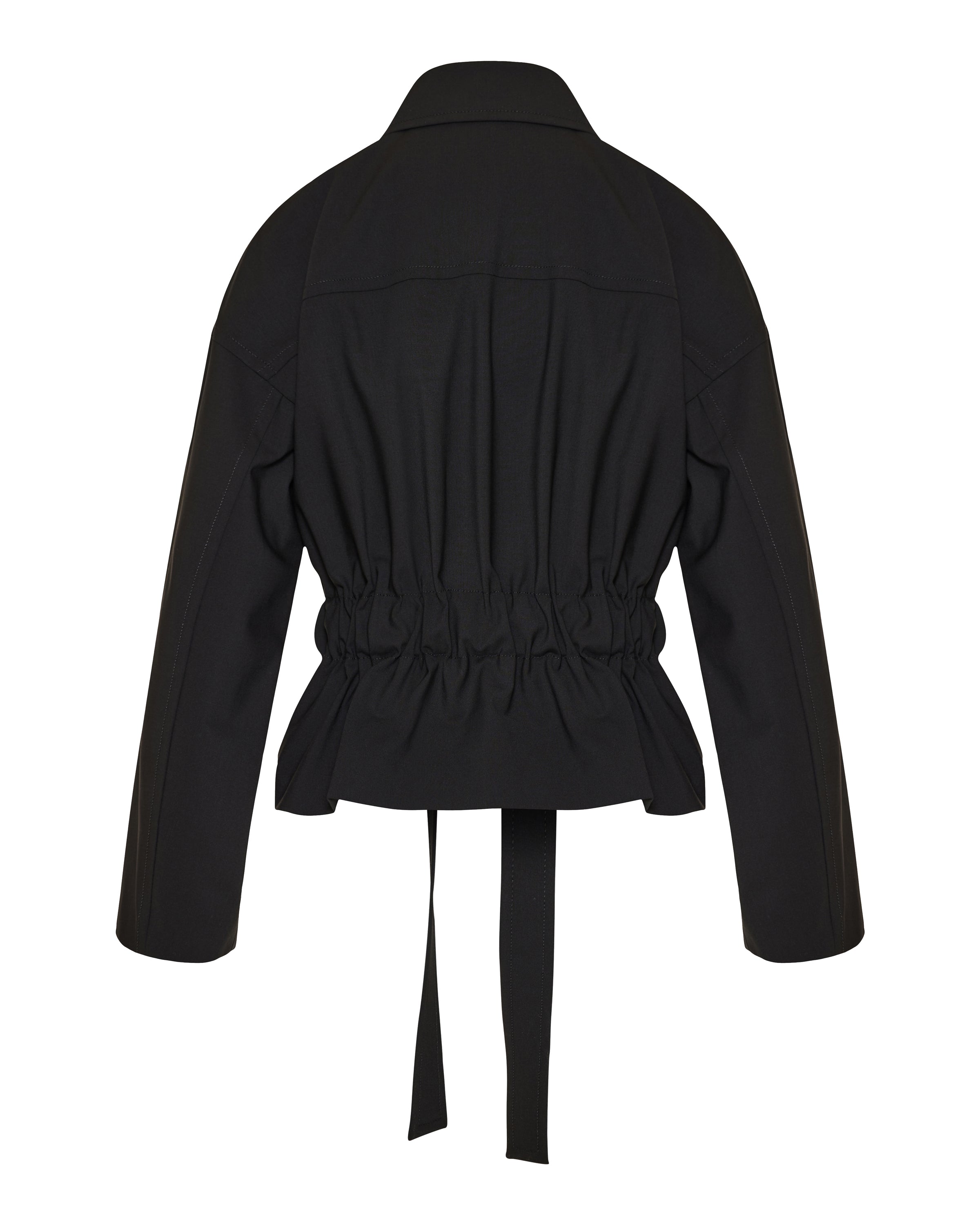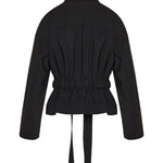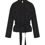 A structured jacket crafted in smooth fabric, featuring a defined waist belt and utility-inspired pocket detailing for a refined, modern silhouette.
