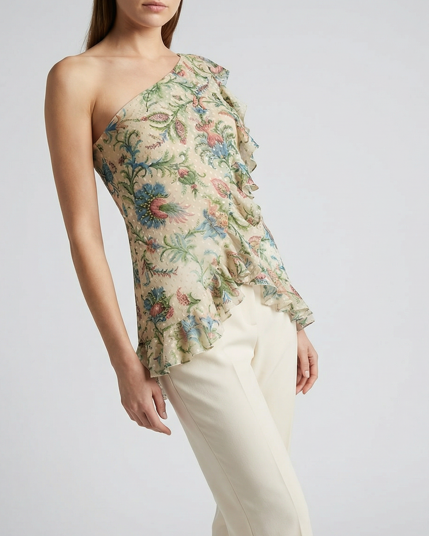 A fluid silk top featuring an expressive printed motif and a softly draped silhouette that moves effortlessly.