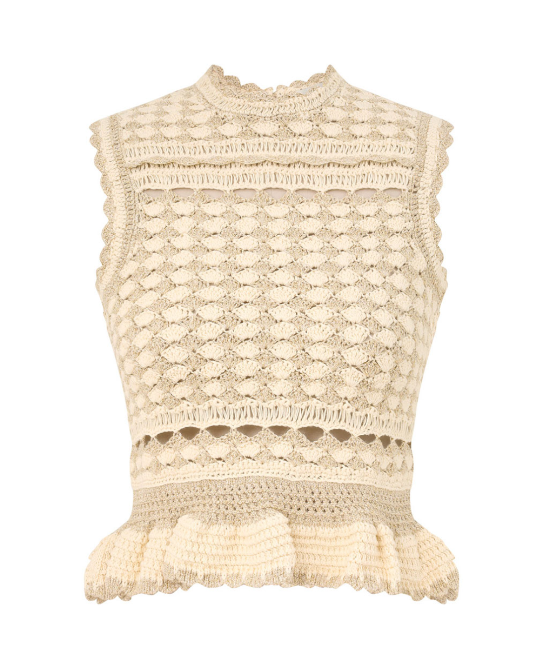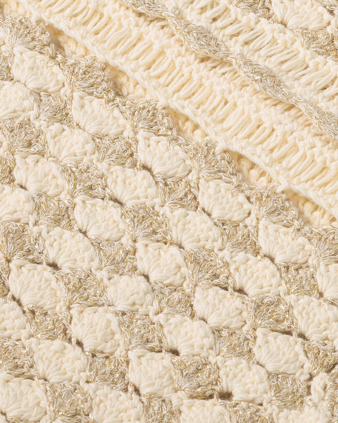 Refined and luminous, this crochet tank top is defined by an intricate openwork design woven with subtle metallic threads. Designed with a softly fitted silhouette, it offers a delicate balance between texture and lightness, creating an elegant yet relaxed feel. Polished and versatile, it is suitable for daytime occasions, summer styling, and elevated resort looks, delivering understated glamour with a contemporary, artisanal character.