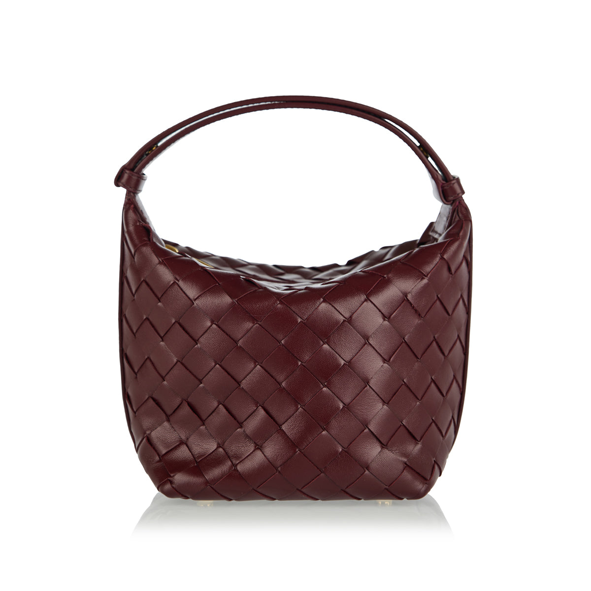 This super mini Wallace bag with Intrecciato craftsmanship in leather features shoulder strap with adjustable press stud, one main compartment and top zip closure.