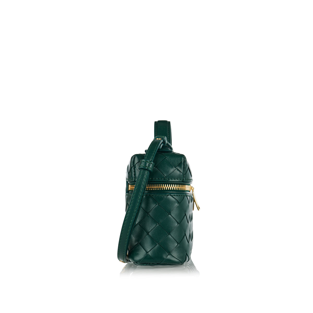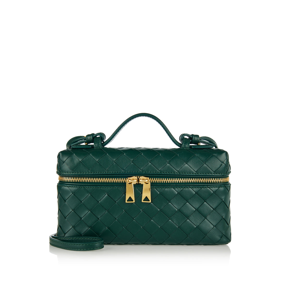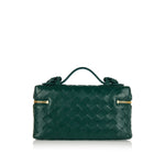 Discover the Bottega Veneta Bang Bang Intrecciato vanity case, a luxurious and versatile accessory meticulously crafted in Italy. This exquisite vanity case is rendered in the iconic Intrecciato leather in a captivating emerald green, showcasing Bottega Veneta's unparalleled artisanal heritage. Designed for both elegance and practicality, it features a single main compartment and a flat pocket, secured with a sophisticated zippered closure. The detachable strap offers versatile carrying options, while the top handle provides an elegant alternative.