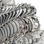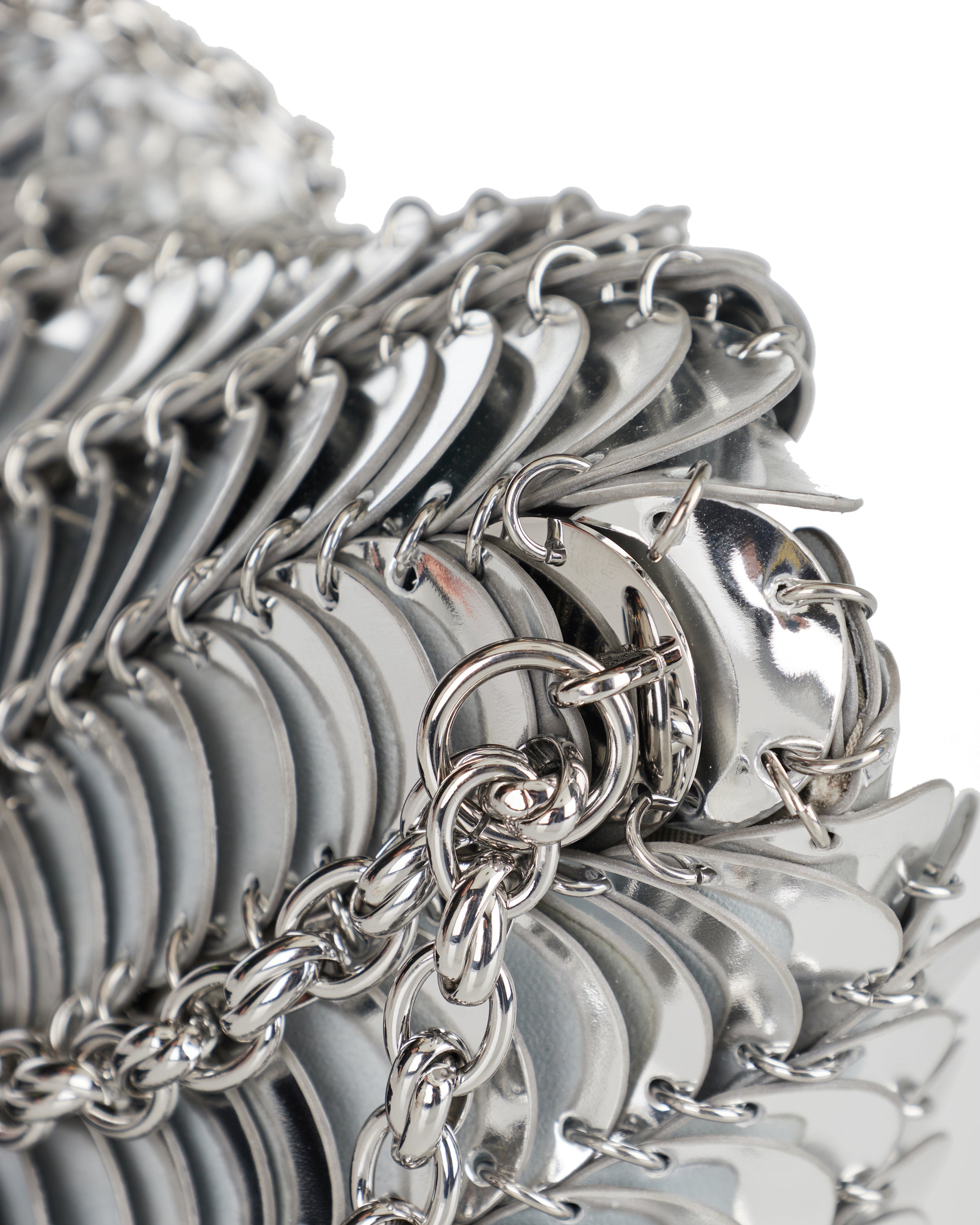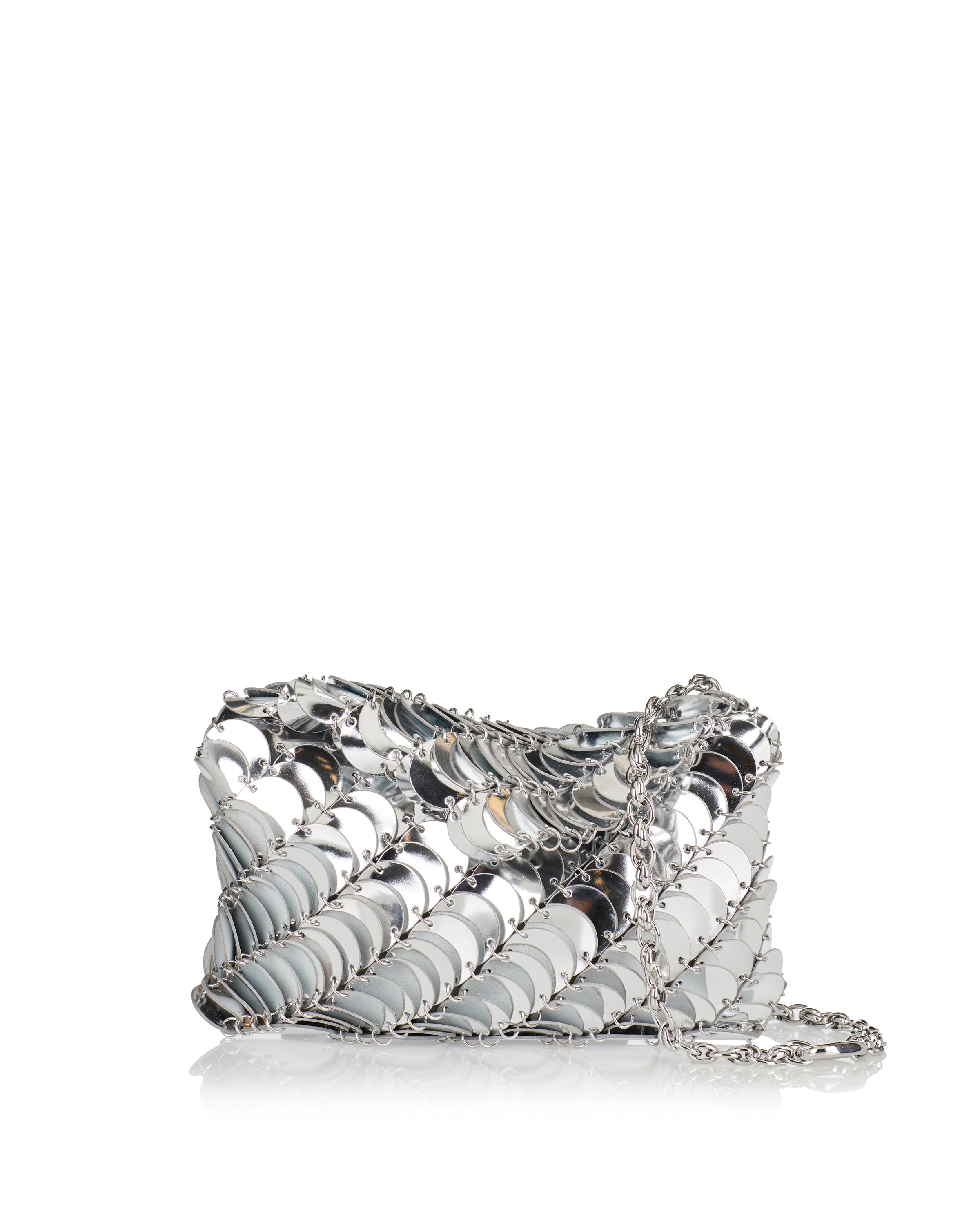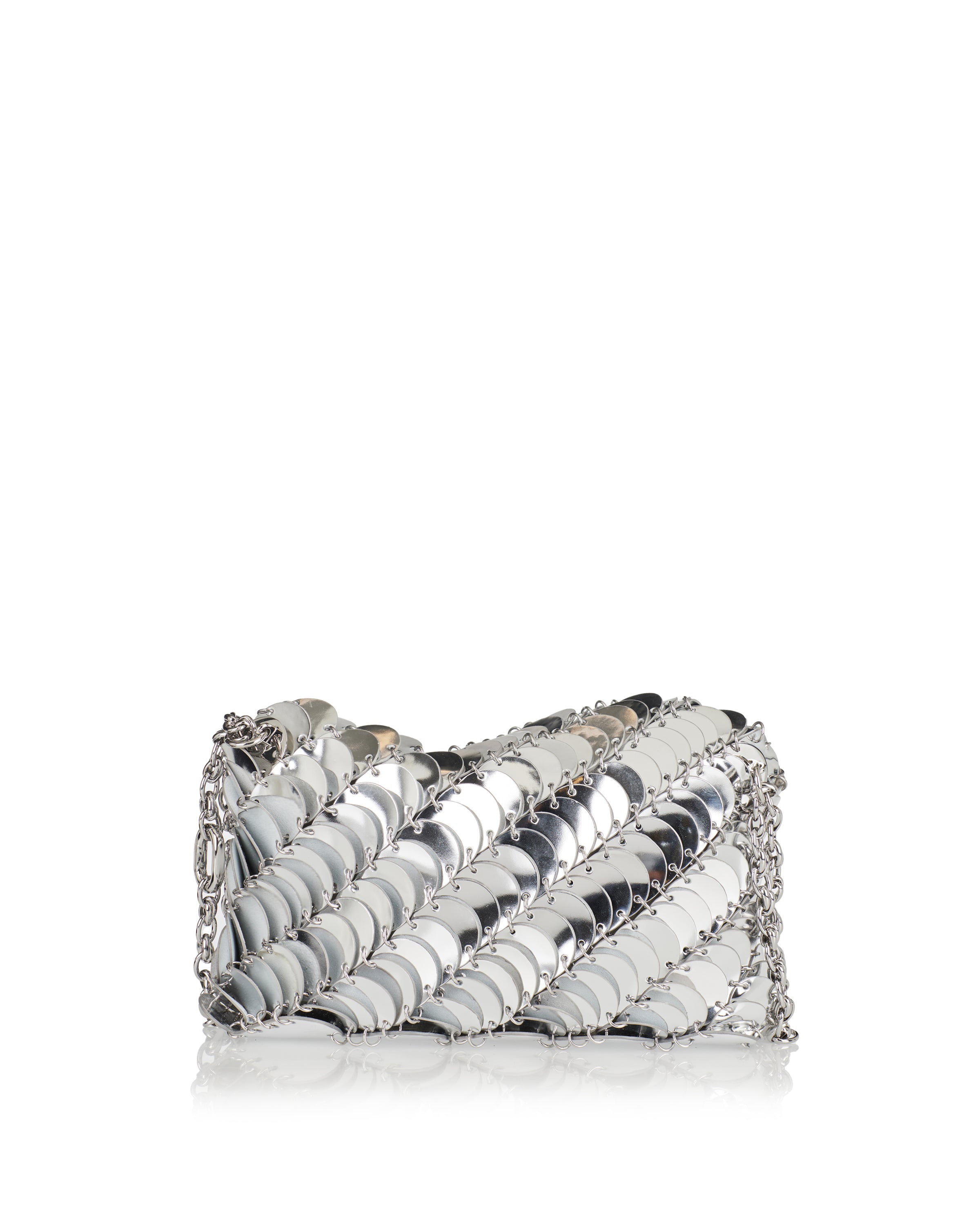 An iconic statement piece, this shoulder bag reflects Rabanne’s heritage of bold, architectural design. Defined by its fluid chainmail construction, it combines sculptural impact with a refined, compact silhouette. Both expressive and elegant, it is suitable for evening wear, formal occasions, and elevated night styling, adding a distinctive, modern edge to curated looks.