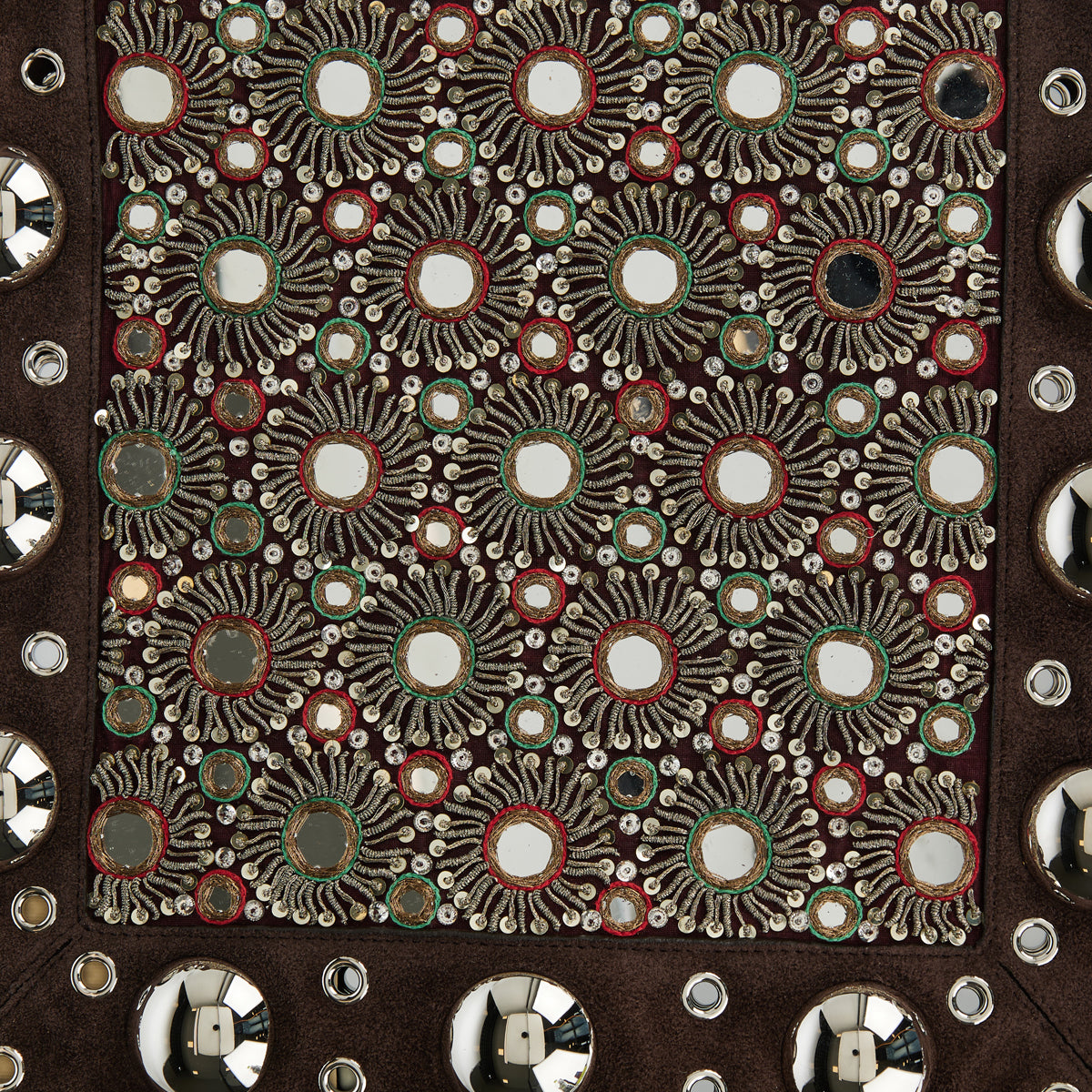 Valentino Garavani’s Nellcôte embroidered shoulder bag is a statement piece, crafted in rich brown fabric with intricate embroidery and refined leather details. Featuring an adjustable strap and spacious silhouette, it blends artisanal craftsmanship with contemporary elegance. A distinctive design that embodies both bohemian character and timeless luxury.