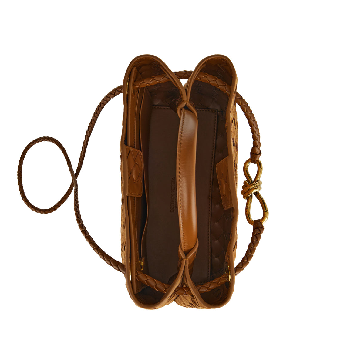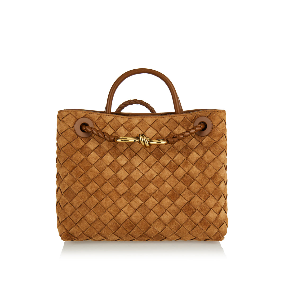 Introducing the Bottega Veneta Andiamo small tote bag, a masterpiece of tactile luxury and refined design. This exquisite top-handle bag is meticulously crafted in Italy from Intrecciato suede in a sophisticated amber hue. It features a distinguished signature knot detail and a practical sliding crossbody strap, offering versatile carrying options. The interior is thoughtfully compartmentalized with one zipped pocket and one open pocket. A secure magnetic closure keeps your belongings safe, while the rich Muse Brass finish hardware complements the bag's luxurious aesthetic.