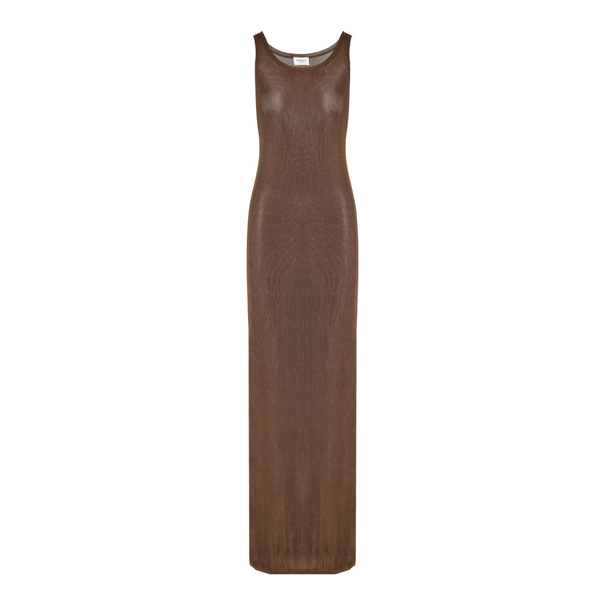 This elegant maxi dress from Saint Laurent is crafted from ribbed-knit viscose, featuring a scoop neckline and a straight hem. Designed with a fitted silhouette, it offers a flattering and comfortable fit. The dress is sheer and stretchy, adding a touch of allure to its minimalist design.