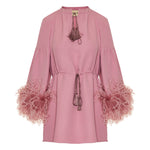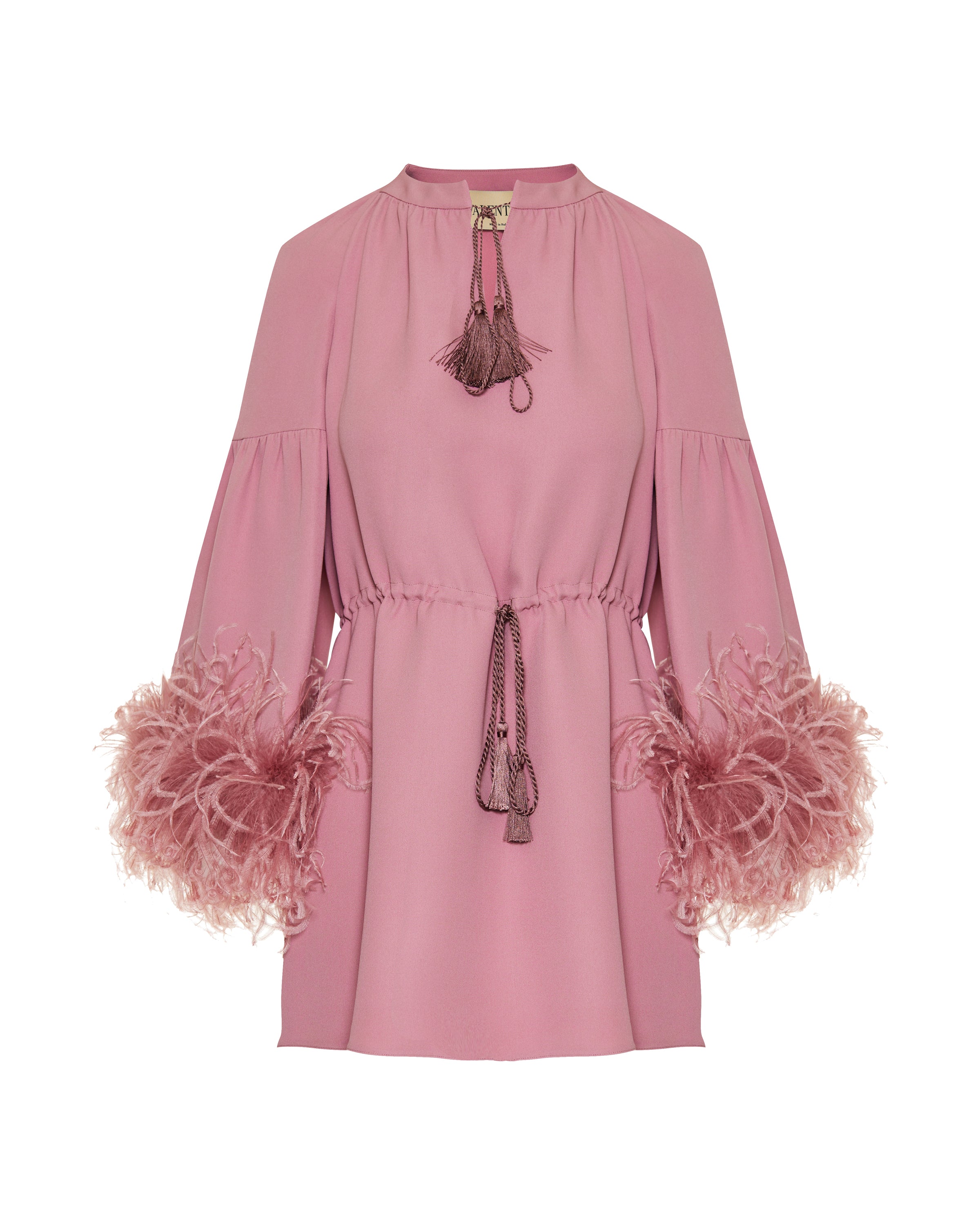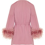 Elegant V-neck dress crafted from cady couture fabric, defined by a sleek silhouette and feather-trim detailing for refined evening impact.