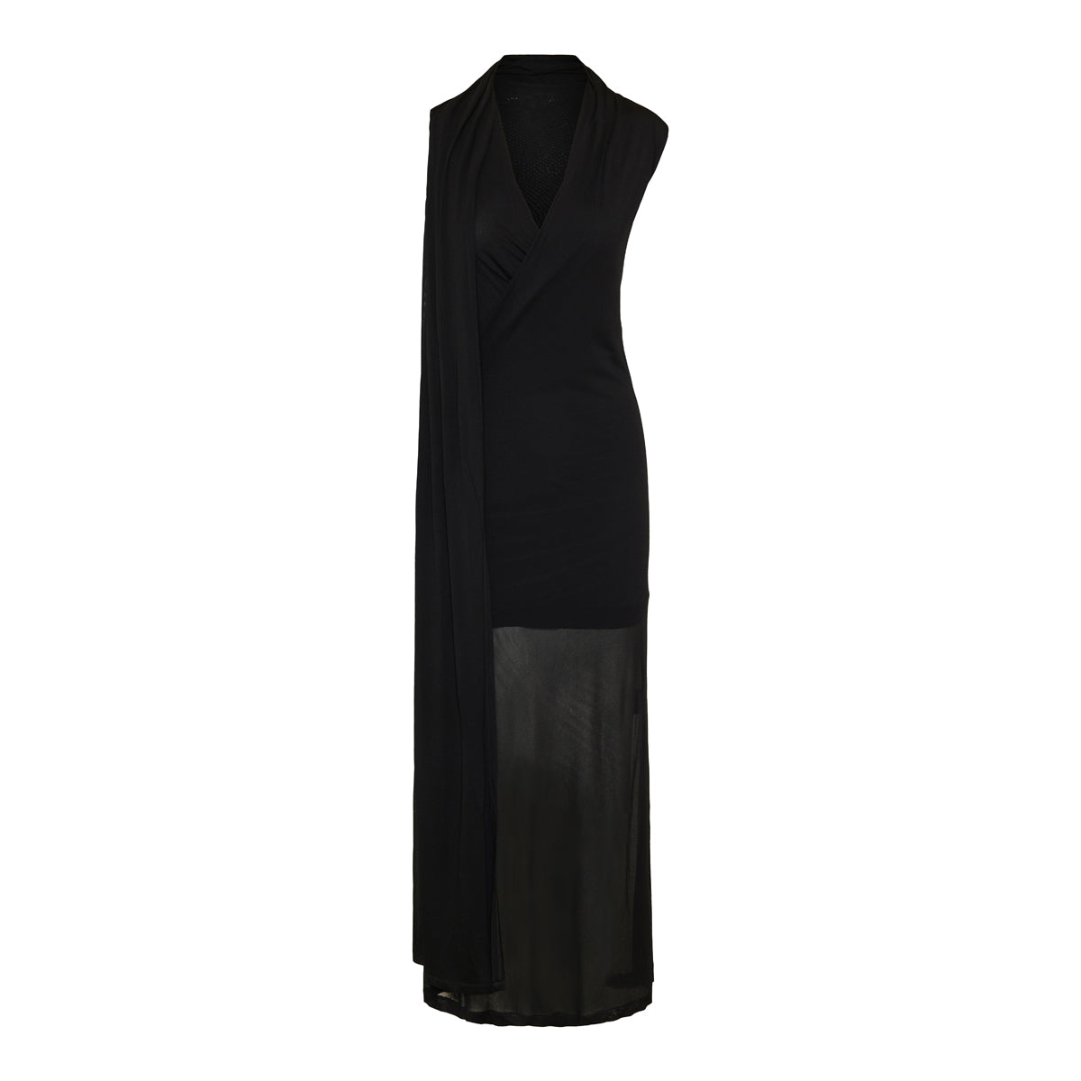 This elegant maxi dress from Toteme features a distinctive scarf detail that attaches at the shoulder, allowing it to be draped over the neck or body. Crafted from semi-sheer, stretch jersey, it offers a slim, overlapped silhouette that combines modern minimalism with sophisticated draping. Ideal for formal occasions or evening events, this dress embodies understated luxury.