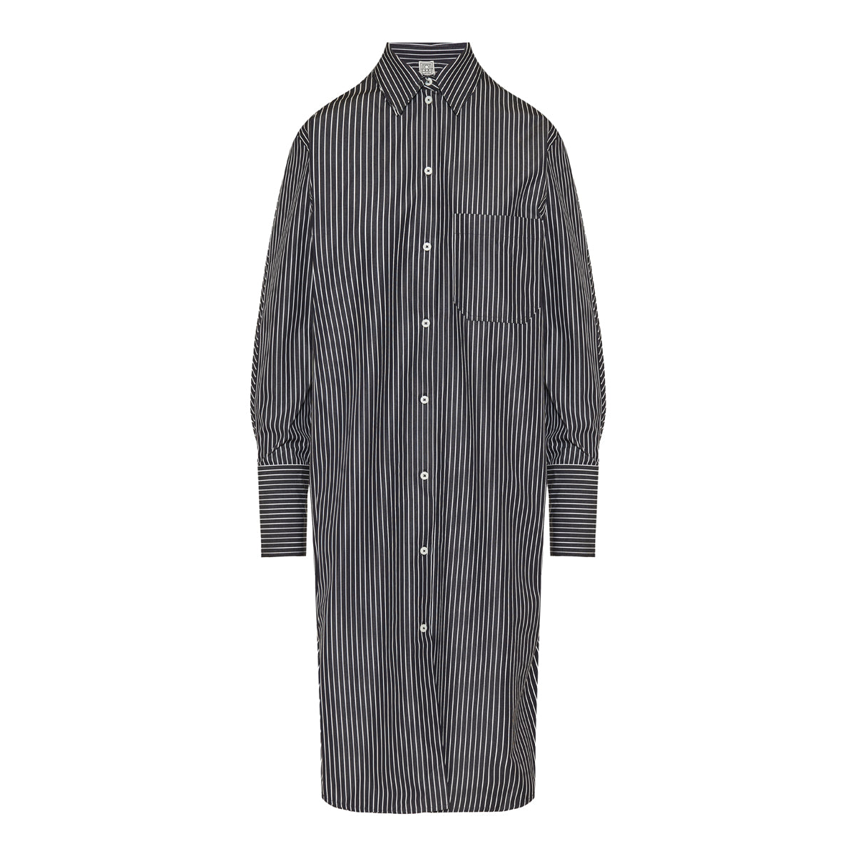 Toteme’s striped shirtdress is tailored from crisp cotton with wide kimono-inspired sleeves and a relaxed, straight silhouette. The black-and-white stripes add a graphic edge, while the versatile cut transitions effortlessly from daywear to vacation dressing.