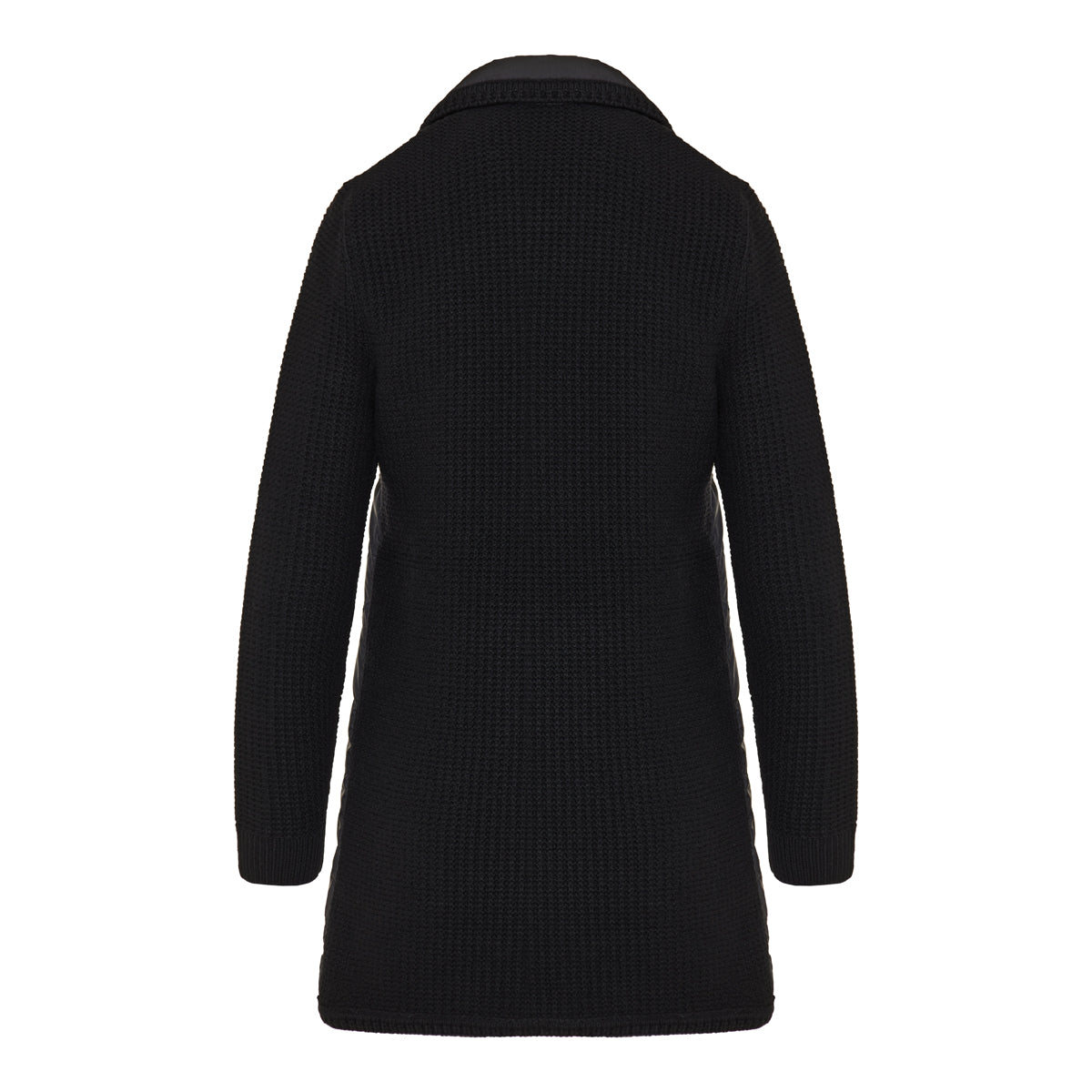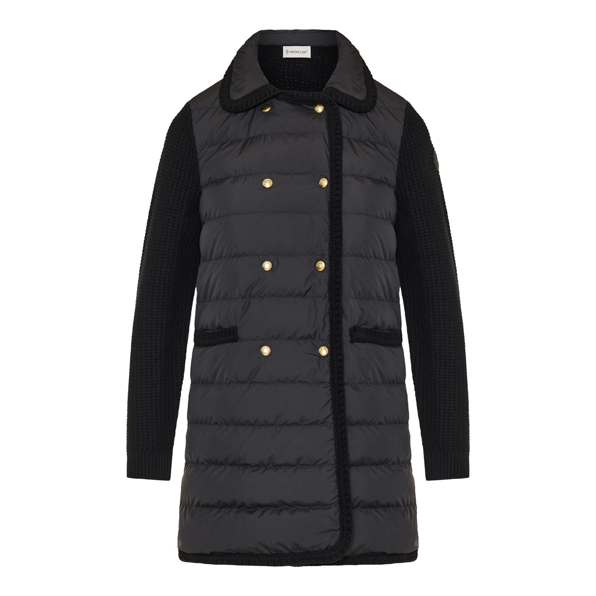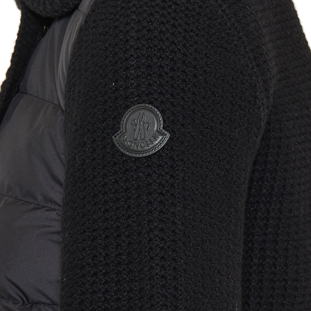 A refined cardigan from Moncler blending plush wool and cashmere with a down-filled front panel for added warmth. The elongated silhouette features snap-button closure, welt pockets, knit trims and a leather logo patch. Ideal for transitional layering in elevated looks and city styling.