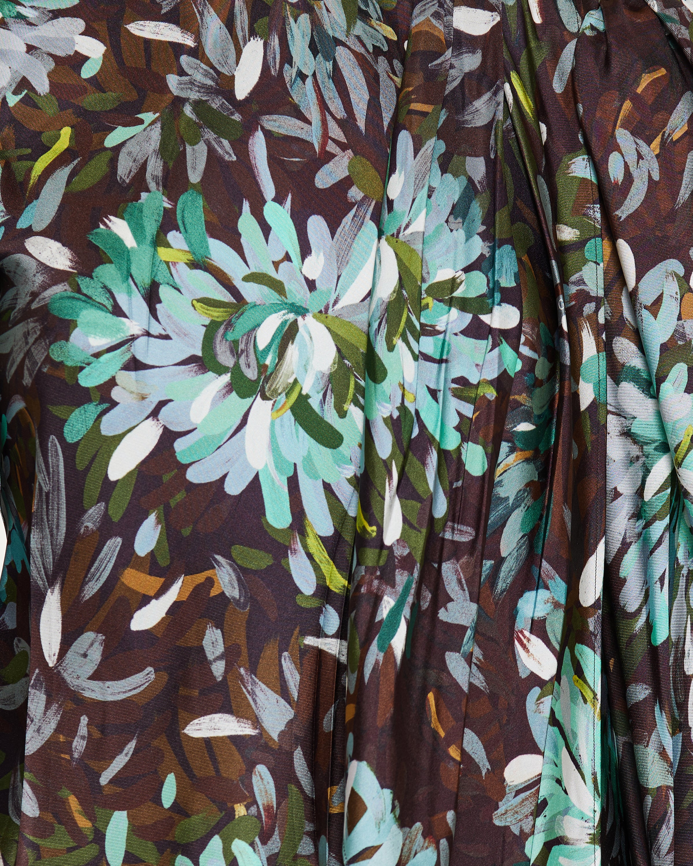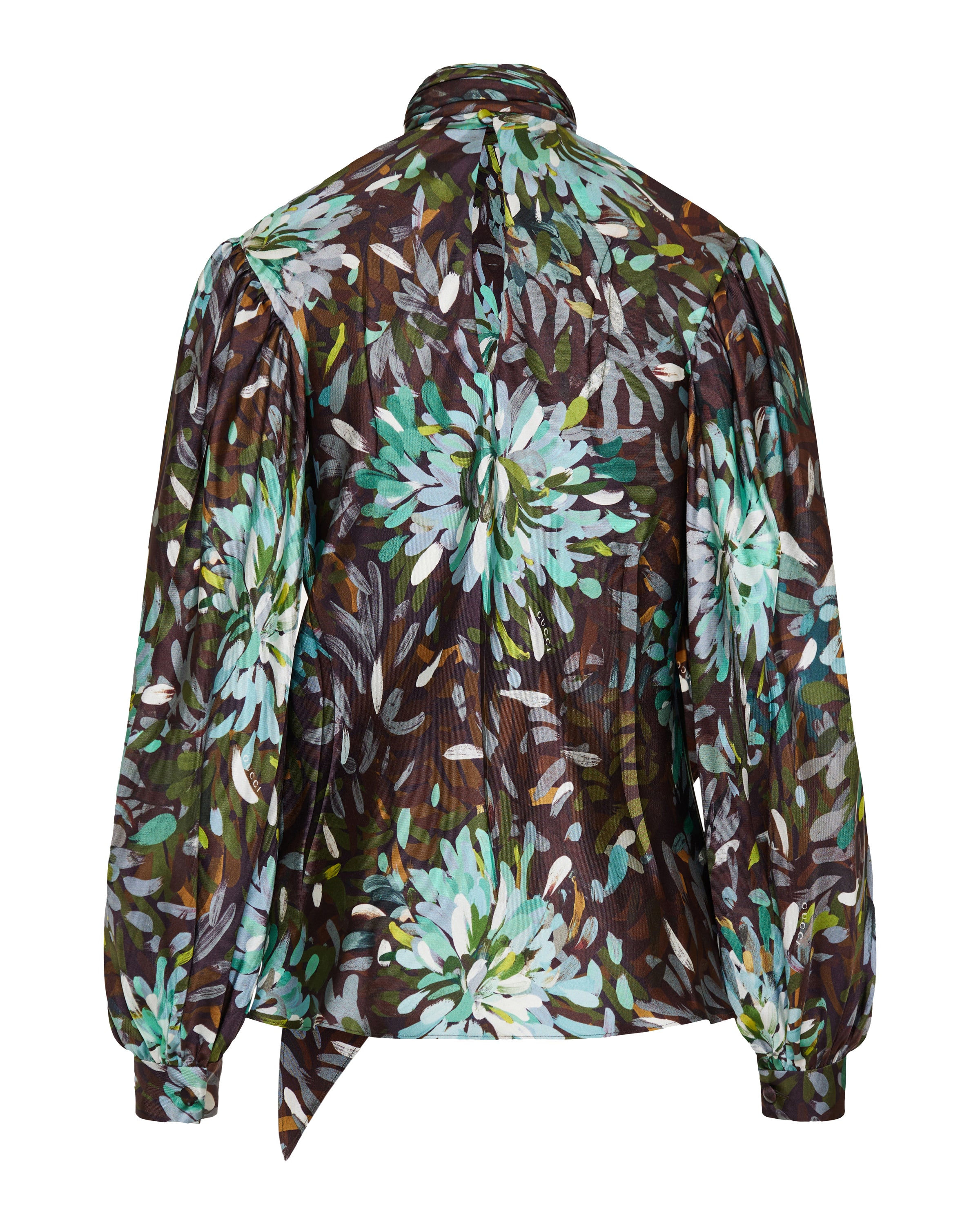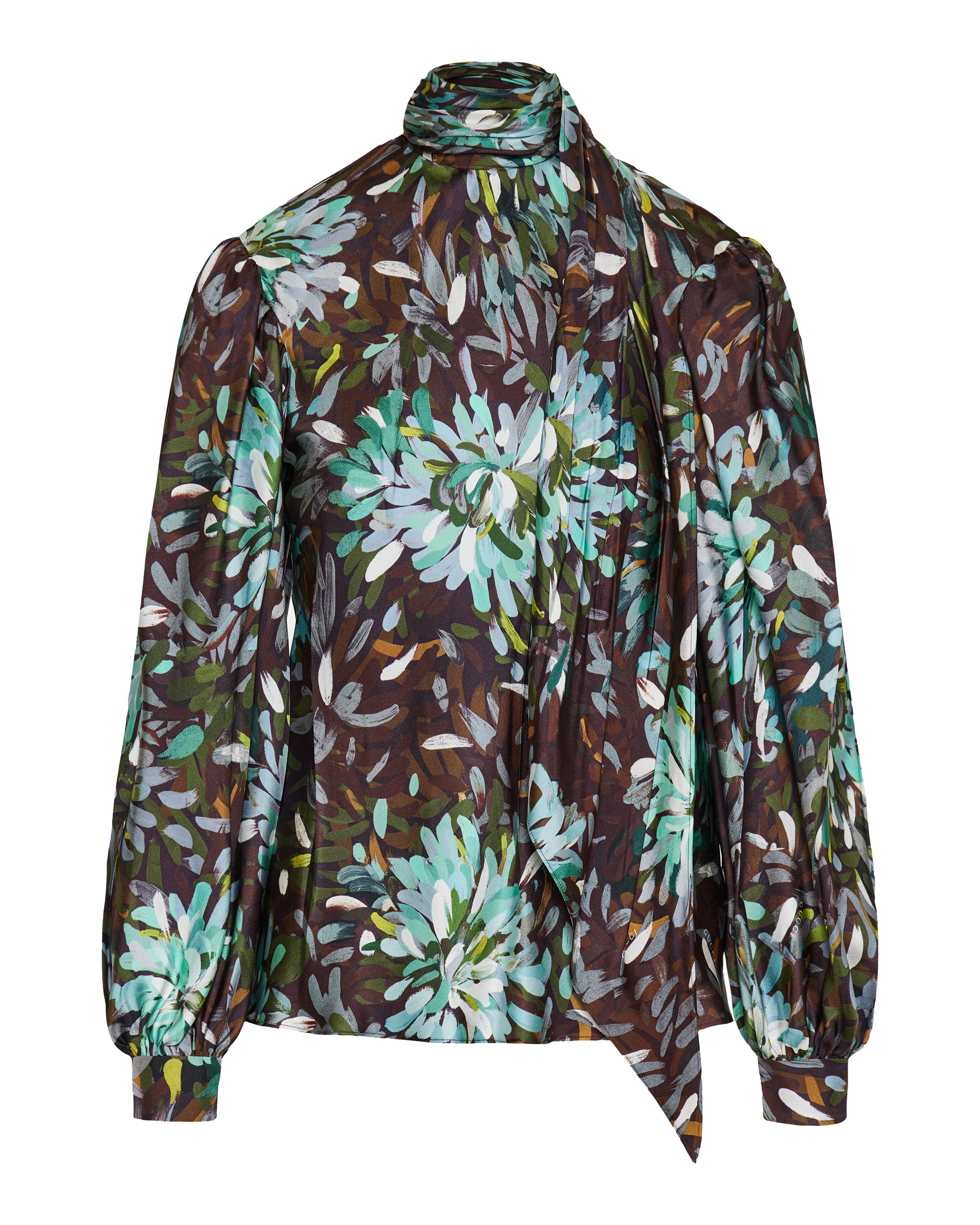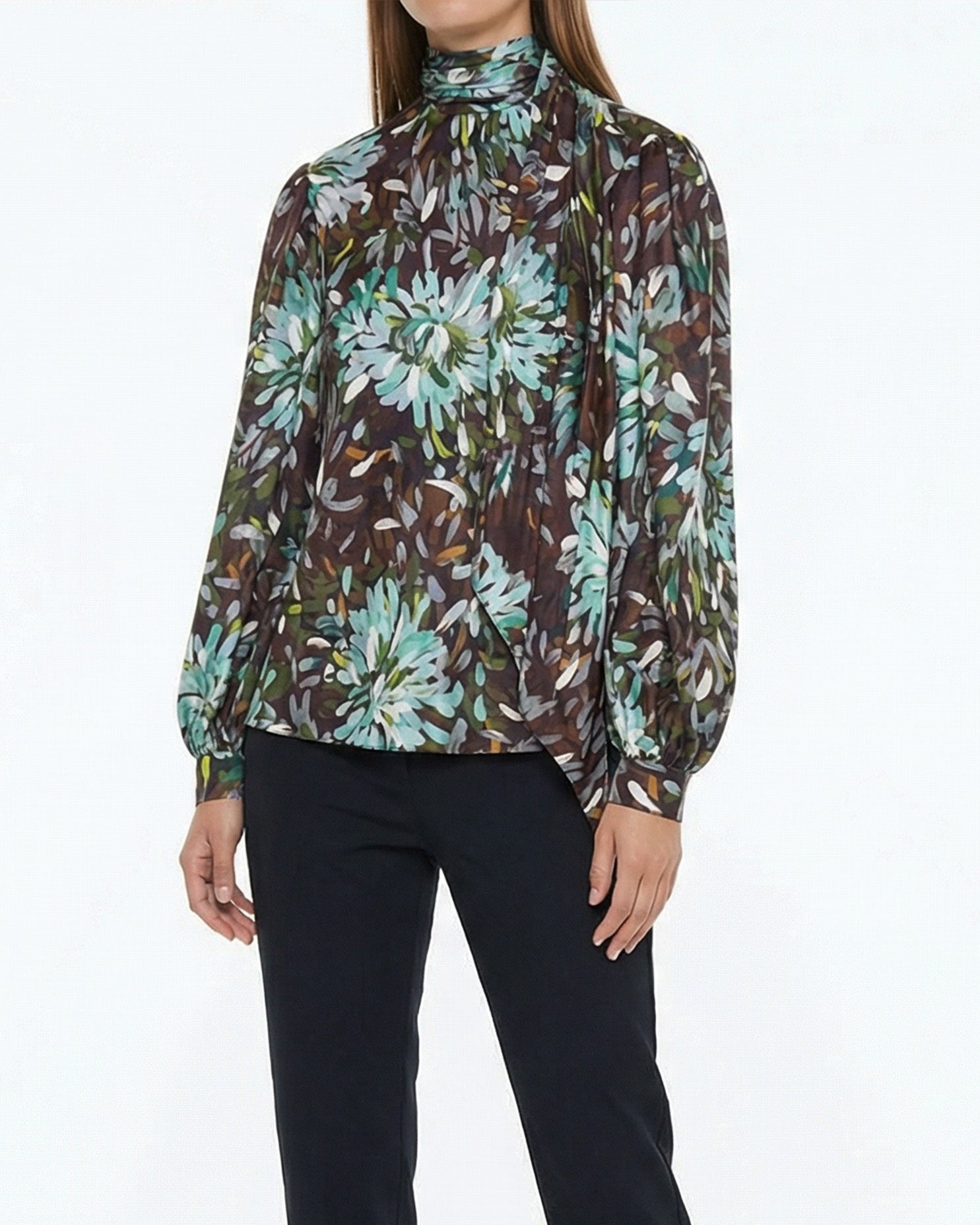 A luxurious Gucci printed silk twill shirt with an all‑over floral motif and self‑tie neck ribbon, featuring structured padded shoulders and long puff sleeves for a refined silhouette. Designed for elevated daytime and smart‑casual wardrobes with couture‑level craftsmanship and modern elegance.