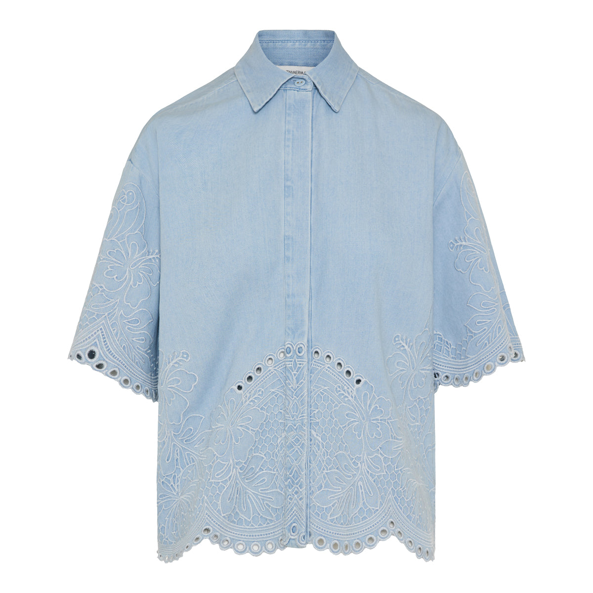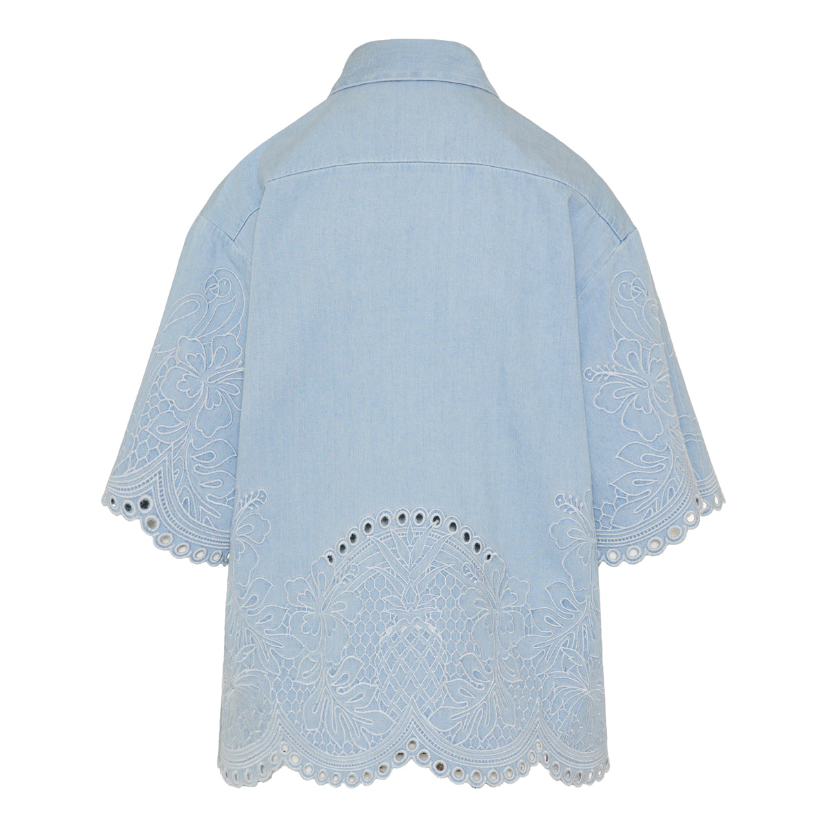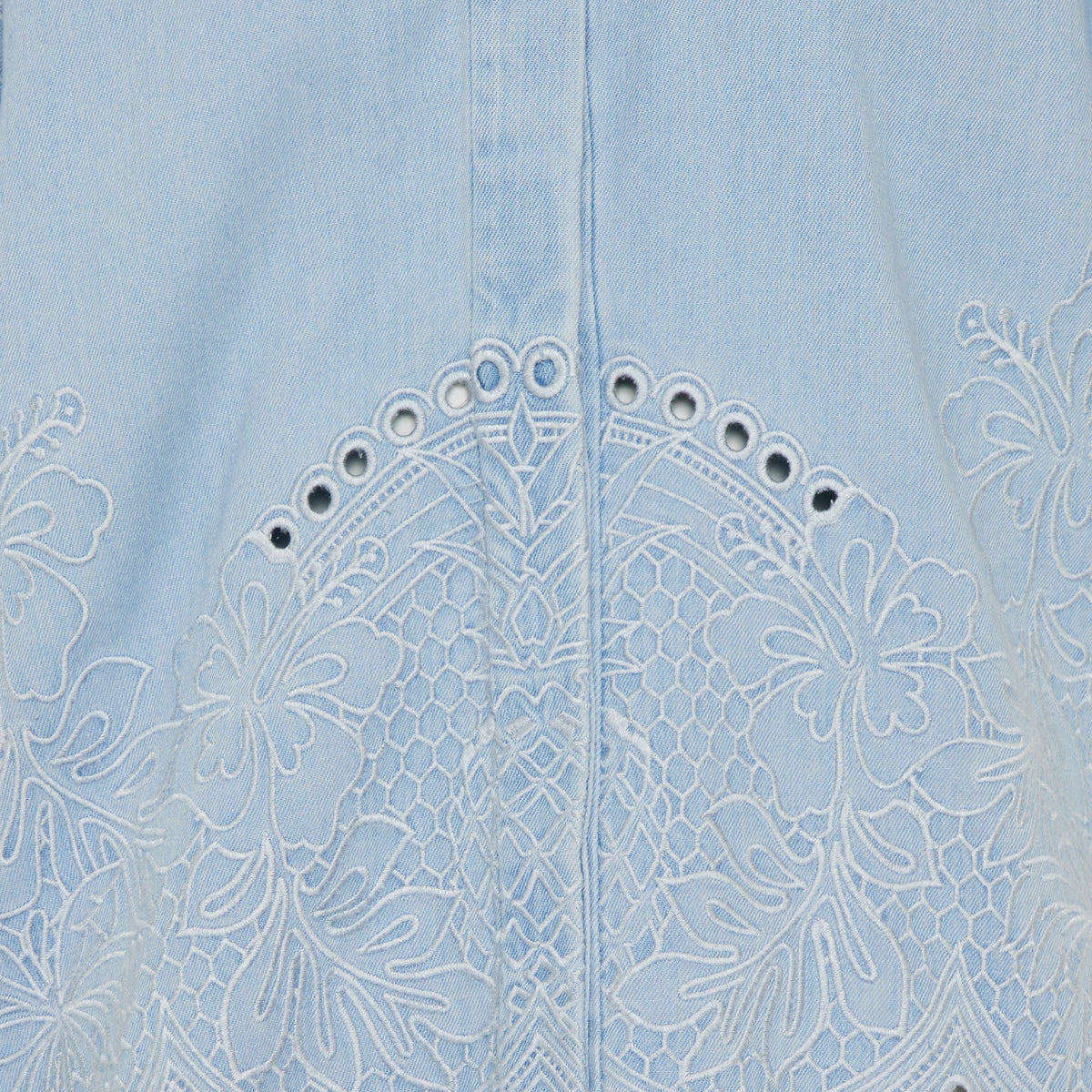 A relaxed-fit denim shirt in Ice Storm wash, featuring a classic collar, concealed button placket and wide three-quarter sleeves. Embroidered detailing along the hem and sleeves and scalloped trim add subtle artisanal charm — ideal for elevated casual or resort wear when styled with shorts, wide-leg jeans or a breezy skirt.