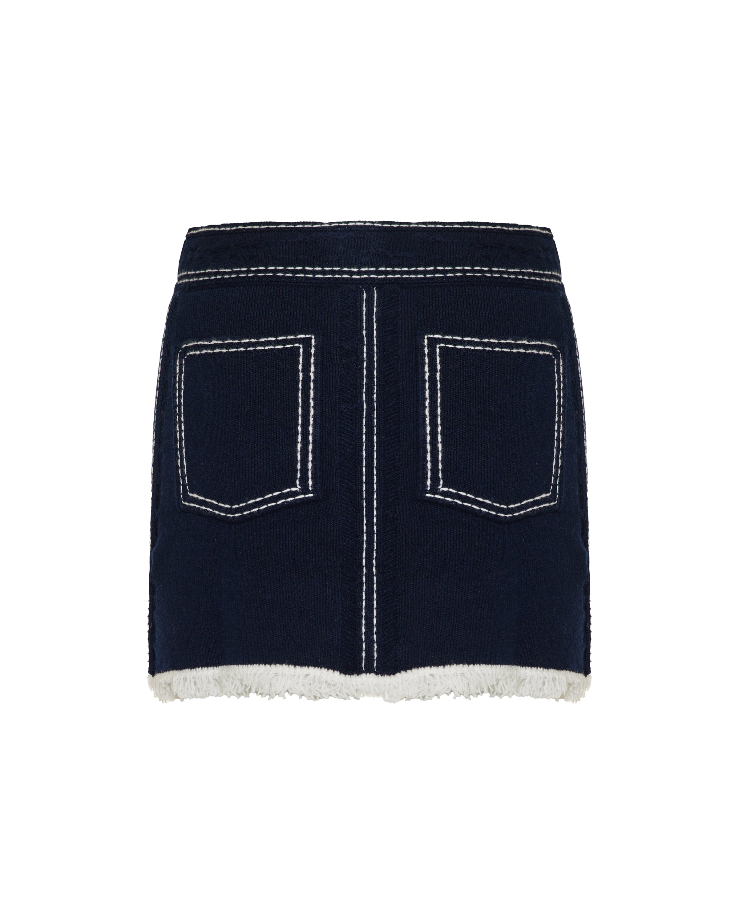 A refined Barrie cotton and cashmere denim‑effect skirt crafted in a soft knit with precision stitching and signature Barrie‑logo metal buttons, reinterpreting classic denim tailoring with luxurious texture. Designed for elevated smart‑casual wardrobes and ideal when paired with complementary knit jackets from the Barrie denim collection.