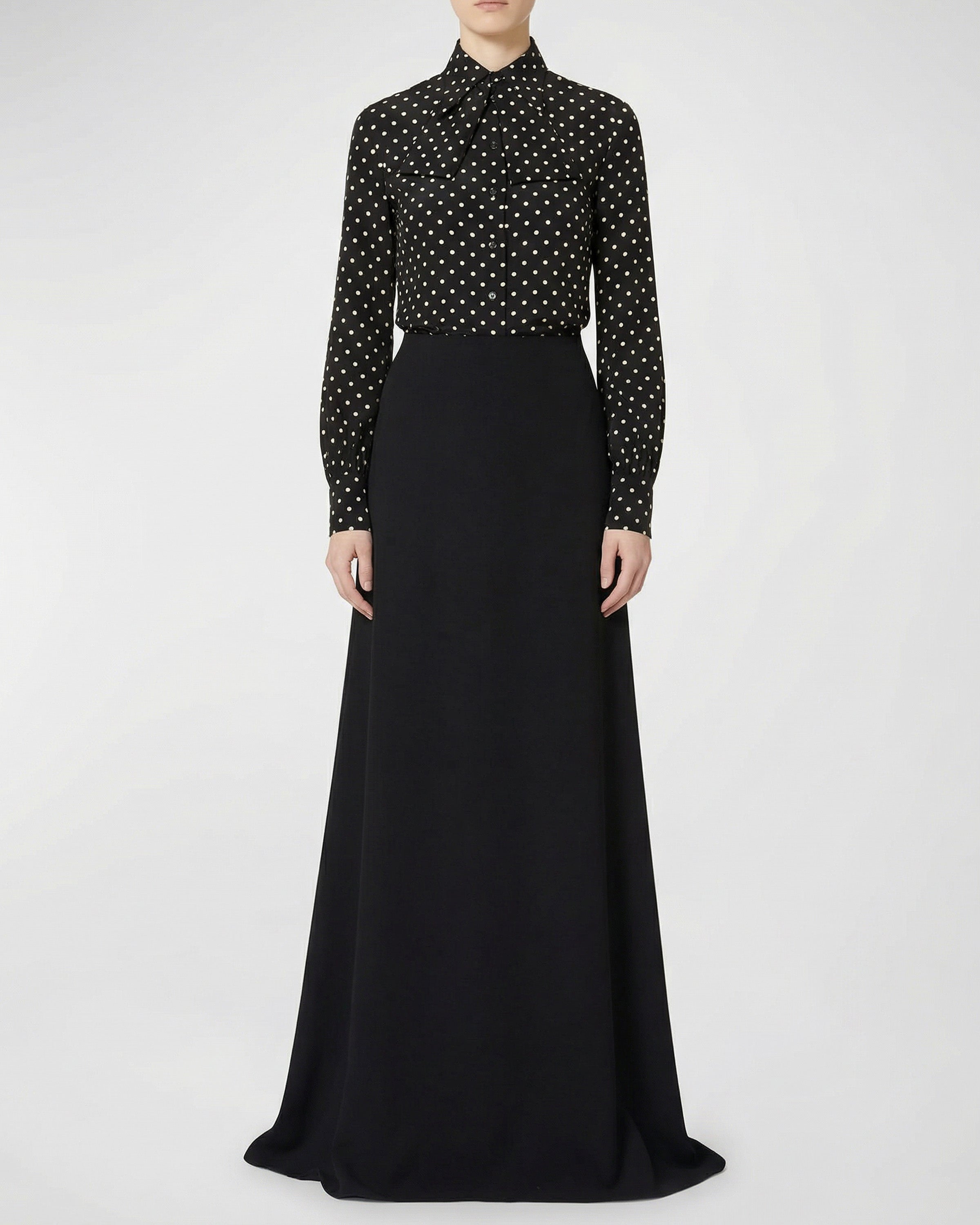 An elegant long skirt crafted from luxurious Cady Couture silk, featuring a high-waisted silhouette with fluid, floor-skimming lines. Designed for elevated formal and refined daytime ensembles, the piece embodies Valentino’s signature combination of sophisticated craftsmanship and effortless glamour. Versatile in styling, it pairs seamlessly with tailored tops and evening blouses alike.