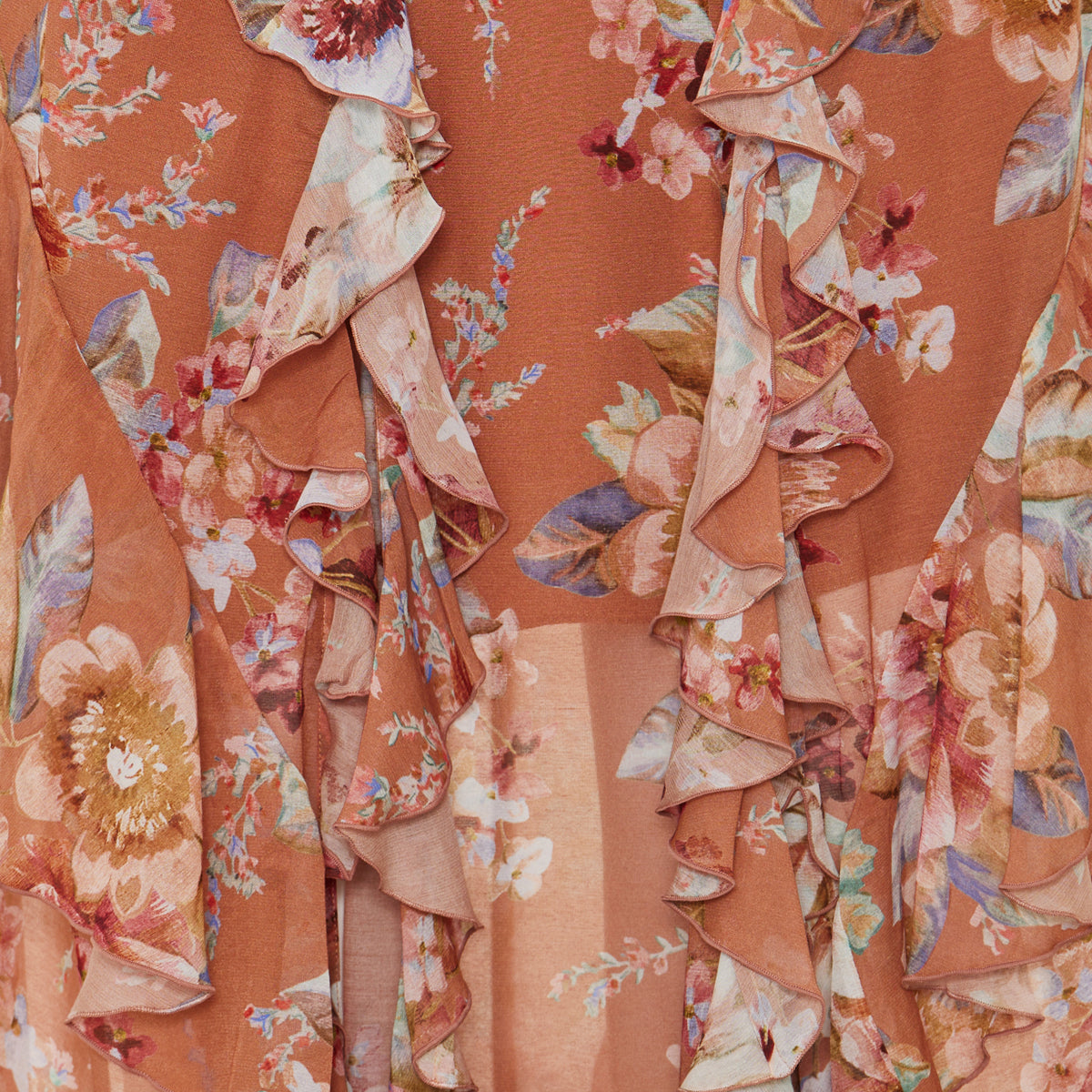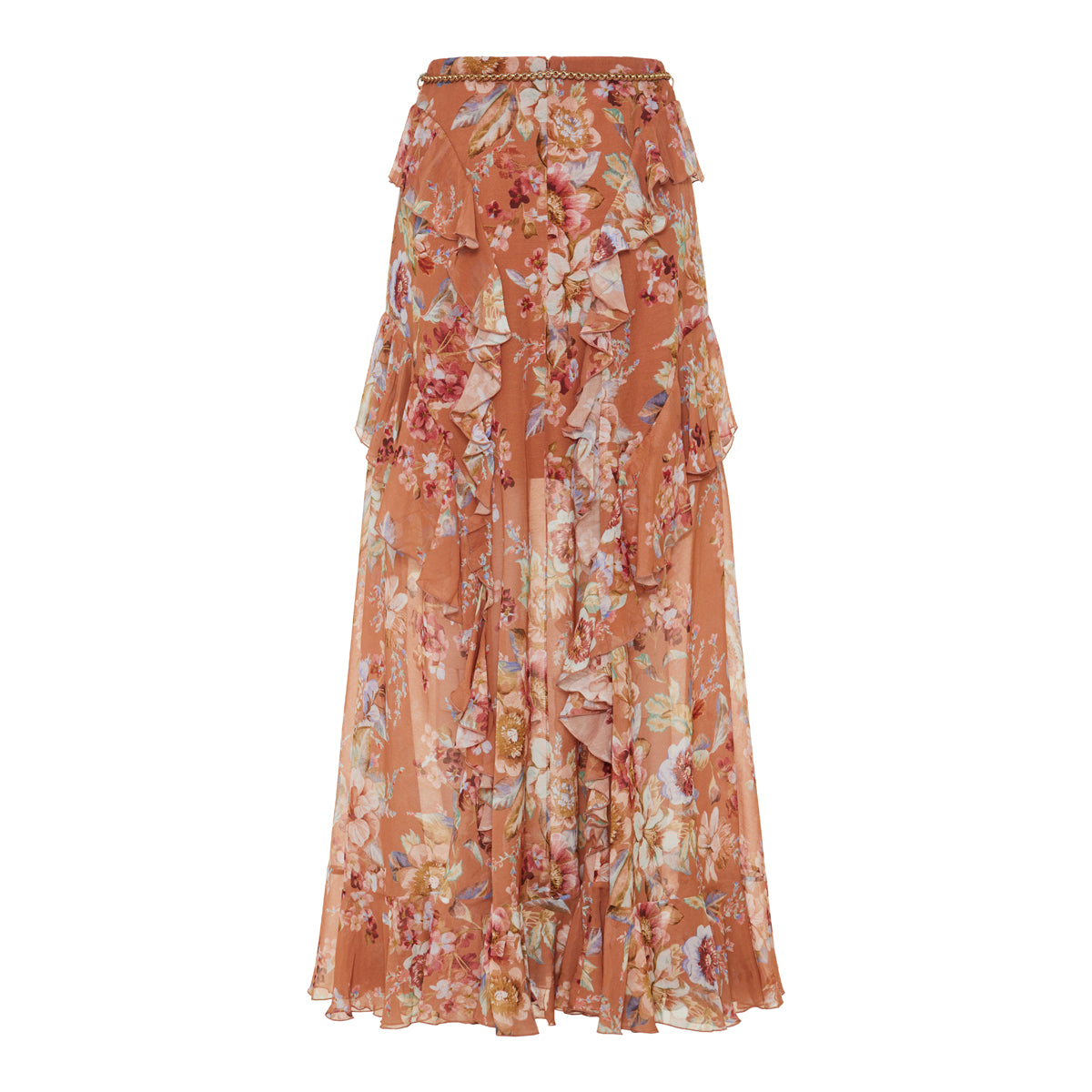 A flowing, full‑length skirt in a cotton‑silk blend with cascading ruffles, a detachable rope belt, and subtle side slits — perfect for graceful movement. Rendered in the Cinnamon Floral print, it is ideal for elevated daywear, resort outfits or romantic evening ensembles when styled with a fitted top or light blouse.