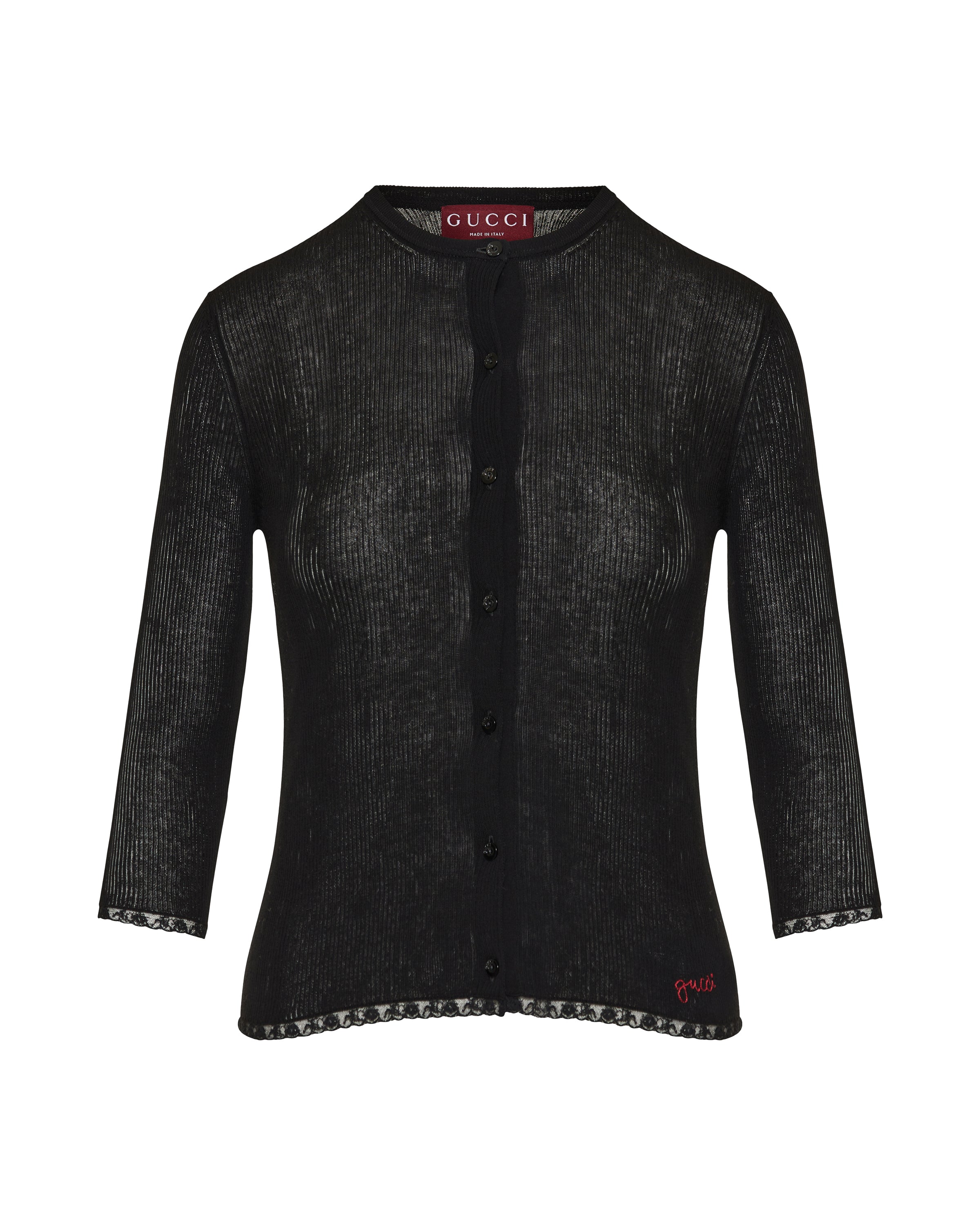 A sophisticated Gucci cotton rib cardigan from the Cruise 2026 women’s ready‑to‑wear collection, crafted in extra‑fine breathable cotton with delicate lace trim and signature Gucci logo embroidery above the hem. Designed for refined smart‑casual layering and elevated wardrobe versatility.